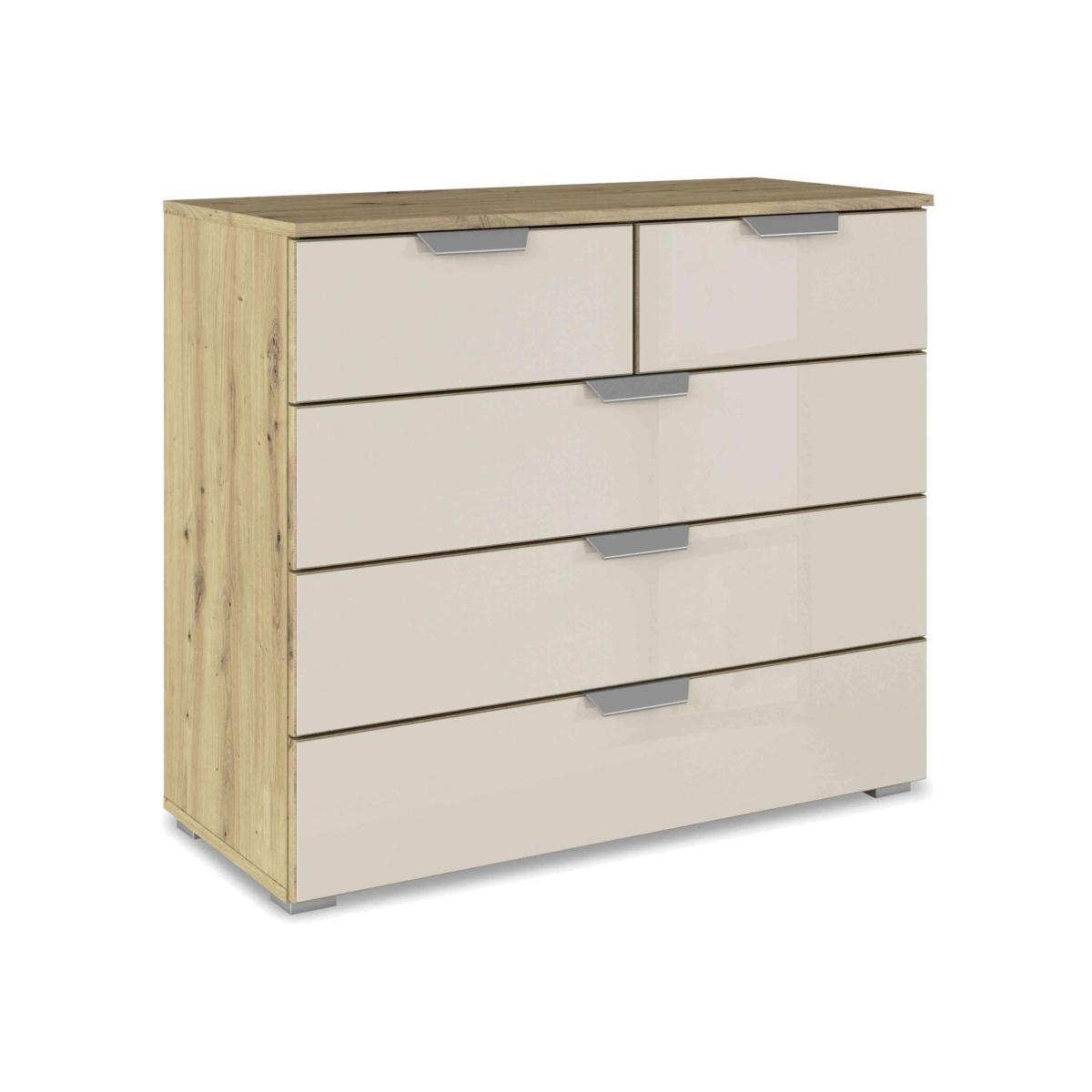 With so many sizes and styles of wardrobe plus chests of drawers, the Rauch Freja collection makes it so easy to create an on-trend and high-end bedroom look. Sliding door and hinged door wardrobes are offered in a choice of door finishes that include glass and decor as well as mirrored and an artisanal oak effect that matches the wardrobes’ frames. And with everything from two-door to five-door wardrobes available, there’s a sleek storage solution for any size of bedroom. Complete the look with a pair of bedside cabinets and a chest of drawers. And because it's made in Germany by Rauch, you’ll know that the Freja range offers exceptional standards of quality as well as unique style. With three large drawers and two smaller ones, this glass-fronted Rauch five-drawer chest of drawers offers thoughtfully designed storage as well as striking style. Why you'll love it Top-quality bedroom furniture from Rauch. On-trend style with an ultra-sleek finish. Choice of sophisticated colours for the glass drawer fronts. Soft-closing drawers with metal handles. Artisanal oak-effect frame. Made in Germany. This 2+3-drawer chest of drawers is part of the Rauch Freja range. What you need to know Assembled in your home free of charge. The Rauch Freja range includes sliding and hinged door wardrobes, and chests of drawers. WARNING!