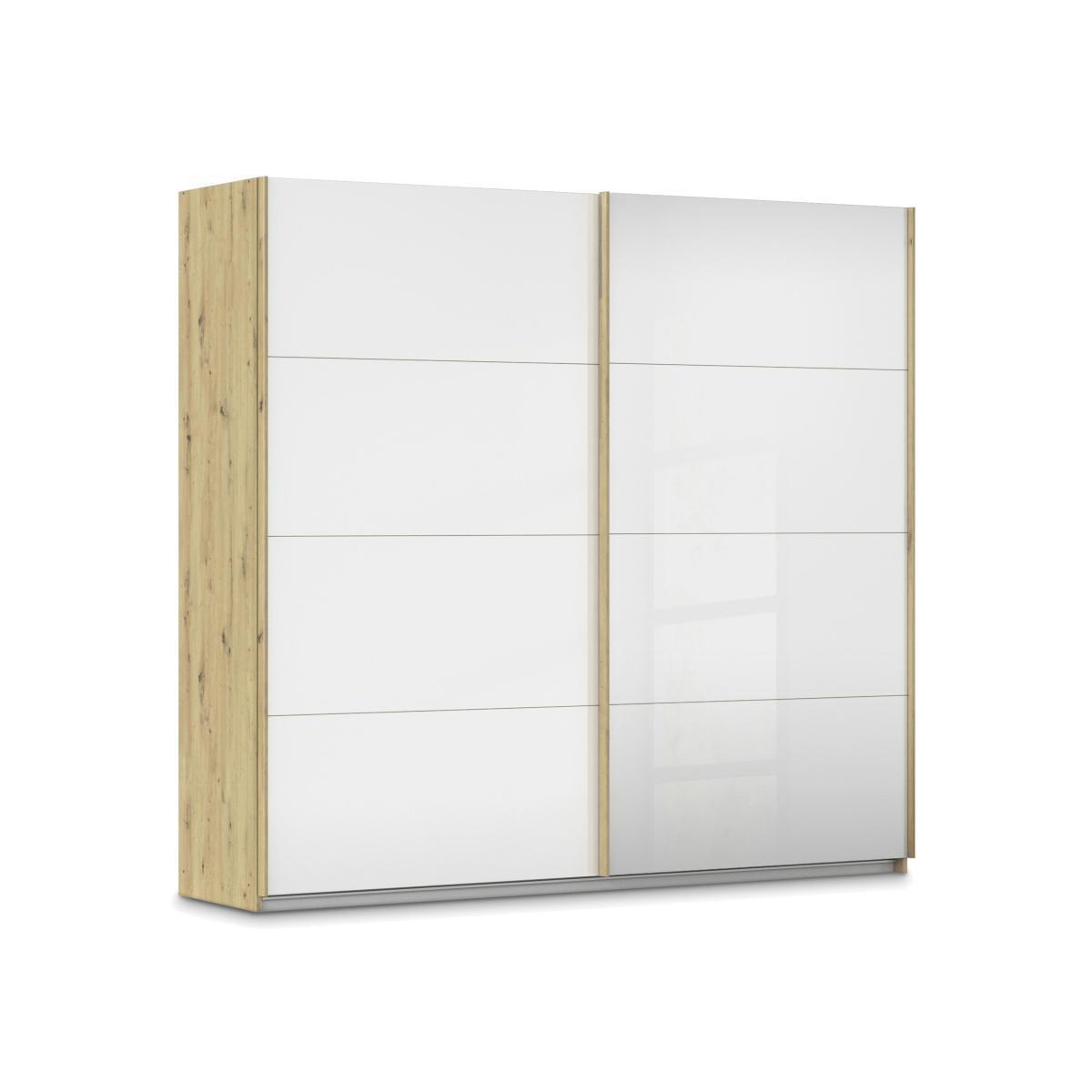 With so many sizes and styles of wardrobe plus chests of drawers, the Rauch Freja collection makes it so easy to create an on-trend and high-end bedroom look. Sliding door and hinged door wardrobes are offered in a choice of door finishes that include glass and decor as well as mirrored and an artisanal oak effect that matches the wardrobes’ frames. And with everything from two-door to five-door wardrobes available, there’s a sleek storage solution for any size of bedroom. Complete the look with a pair of bedside cabinets and a chest of drawers. And because it's made in Germany by Rauch, you’ll know that the Freja range offers exceptional standards of quality as well as unique style. At over two metres from end to end, this Rauch sliding door wardrobe delivers a fabulous amount of storage space. And with its glossy glass door and mirror door, it’s not lacking style either. Why you'll love it Top-quality bedroom furniture from Rauch. On-trend style with an ultra-sleek finish. Practical as well striking with 1 mirrored door and 1 glass door. Choice of sophisticated colours for the glass door. Frame has an artisanal oak-effect finish. Sliding doors are soft closing. Superbly designed wardrobe storage with 1 shelf and 1 hanging rail in each section. Customise this wardrobe by adding space-saving and practical interior fittings. This 226 cm 2-door sliding wardrobe is part of the Rauch Freja range. What you need to know Assembled in your home free of charge. This sliding door wardrobe is available in a choice of widths to fit any bedroom. The Rauch Freja range includes sliding and hinged door wardrobes, and chests of drawers. WARNING!