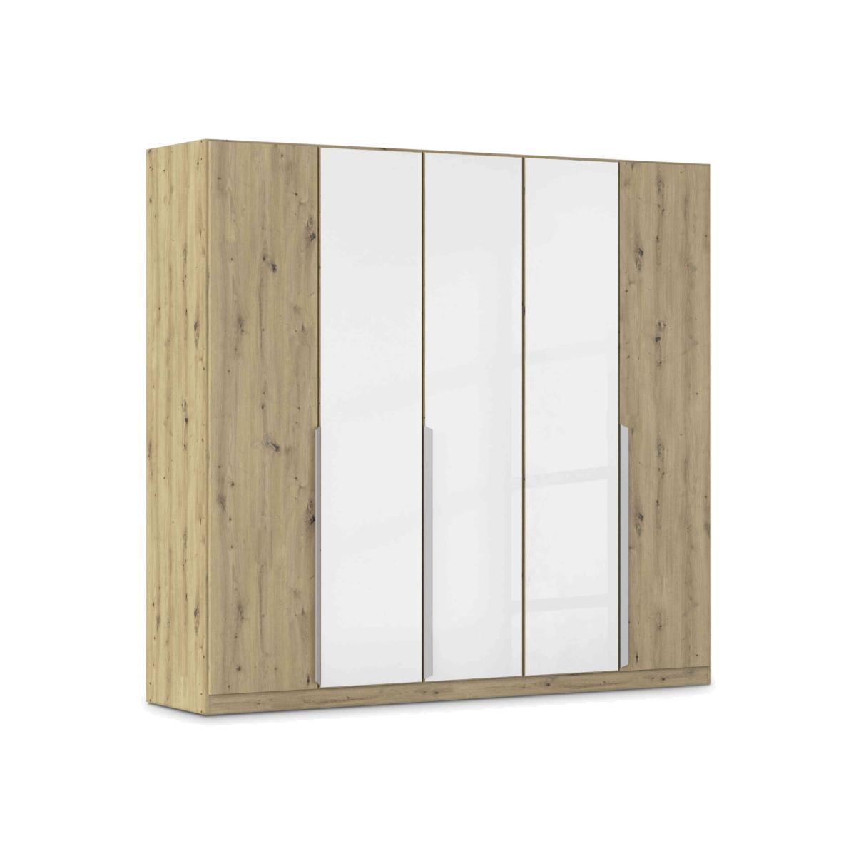 With so many sizes and styles of wardrobe plus chests of drawers, the Rauch Freja collection makes it so easy to create an on-trend and high-end bedroom look. Sliding door and hinged door wardrobes are offered in a choice of door finishes that include glass and decor as well as mirrored and an artisanal oak effect that matches the wardrobes’ frames. And with everything from two-door to five-door wardrobes available, there’s a sleek storage solution for any size of bedroom. Complete the look with a pair of bedside cabinets and a chest of drawers. And because it's made in Germany by Rauch, you’ll know that the Freja range offers exceptional standards of quality as well as unique style. With a stunning glass and artisanal oak-effect finish, this very large five-door hinged wardrobe delivers storage and style in abundance. By Rauch. Why you'll love it Top-quality bedroom furniture from Rauch. On-trend style with an ultra-sleek finish. Striking combination of glass and oak-effect doors. Glass doors are available in a choice of sophisticated colours. Artisanal oak-effect frame. Soft-closing doors with metal door handles. Superbly designed wardrobe storage with 1 shelf and 1 hanging rail in each section. Customise this wardrobe by adding space-saving and practical interior fittings. This 226 cm 5-door hinged wardrobe is part of the Rauch Freja range. What you need to know Assembled in your home free of charge. This hinged door wardrobe is available in a choice of sizes to fit any bedroom. The Rauch Freja range includes sliding and hinged door wardrobes, and chests of drawers. WARNING!