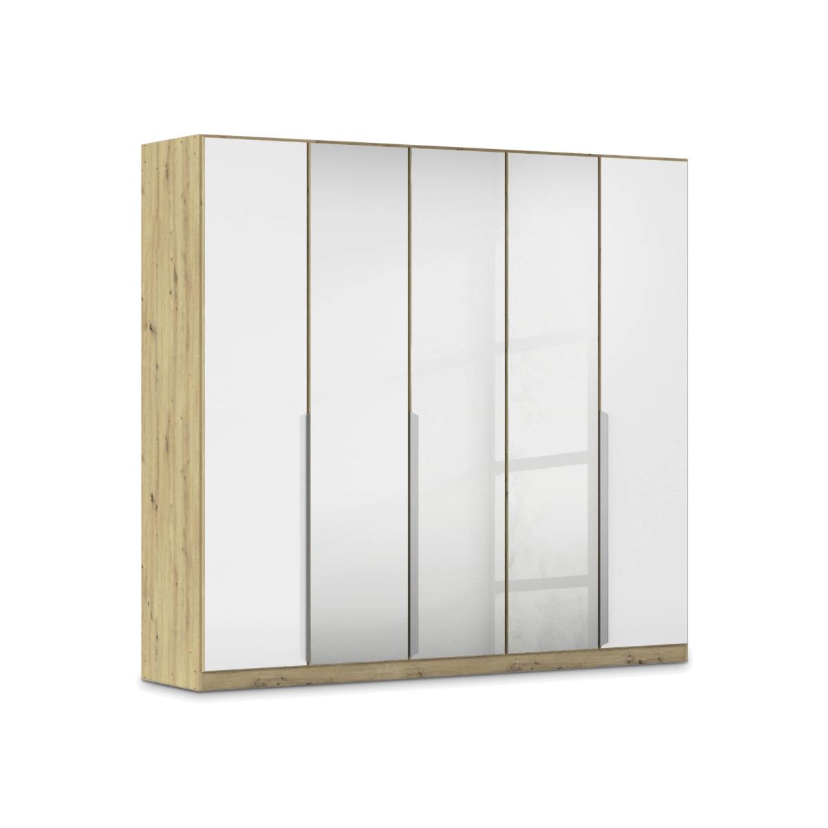 With so many sizes and styles of wardrobe plus chests of drawers, the Rauch Freja collection makes it so easy to create an on-trend and high-end bedroom look. Sliding door and hinged door wardrobes are offered in a choice of door finishes that include glass and decor as well as mirrored and an artisanal oak effect that matches the wardrobes’ frames. And with everything from two-door to five-door wardrobes available, there’s a sleek storage solution for any size of bedroom. Complete the look with a pair of bedside cabinets and a chest of drawers. And because it's made in Germany by Rauch, you’ll know that the Freja range offers exceptional standards of quality as well as unique style. It’s the combination of light-enhancing mirror doors and glossy glass doors in a choice of colours that really makes this Rauch wardrobe sing. And we think you’ll love the ultra-spacious interior too. Why you'll love it Top-quality bedroom furniture from Rauch. On-trend style with an ultra-sleek finish. Choice of sophisticated colours for the 2 glass doors. With 3 mirror doors – practical and light-enhancing. Artisanal oak-effect frame. Soft-closing doors with metal door handles. Superbly designed wardrobe storage with 1 shelf and 1 hanging rail in each section. Customise this wardrobe by adding space-saving and practical interior fittings. This 226 cm 5-door hinged wardrobe is part of the Rauch Freja range. What you need to know Assembled in your home free of charge. This hinged door wardrobe is available in a choice of sizes to fit any bedroom. The Rauch Freja range includes sliding and hinged door wardrobes, and chests of drawers. WARNING!