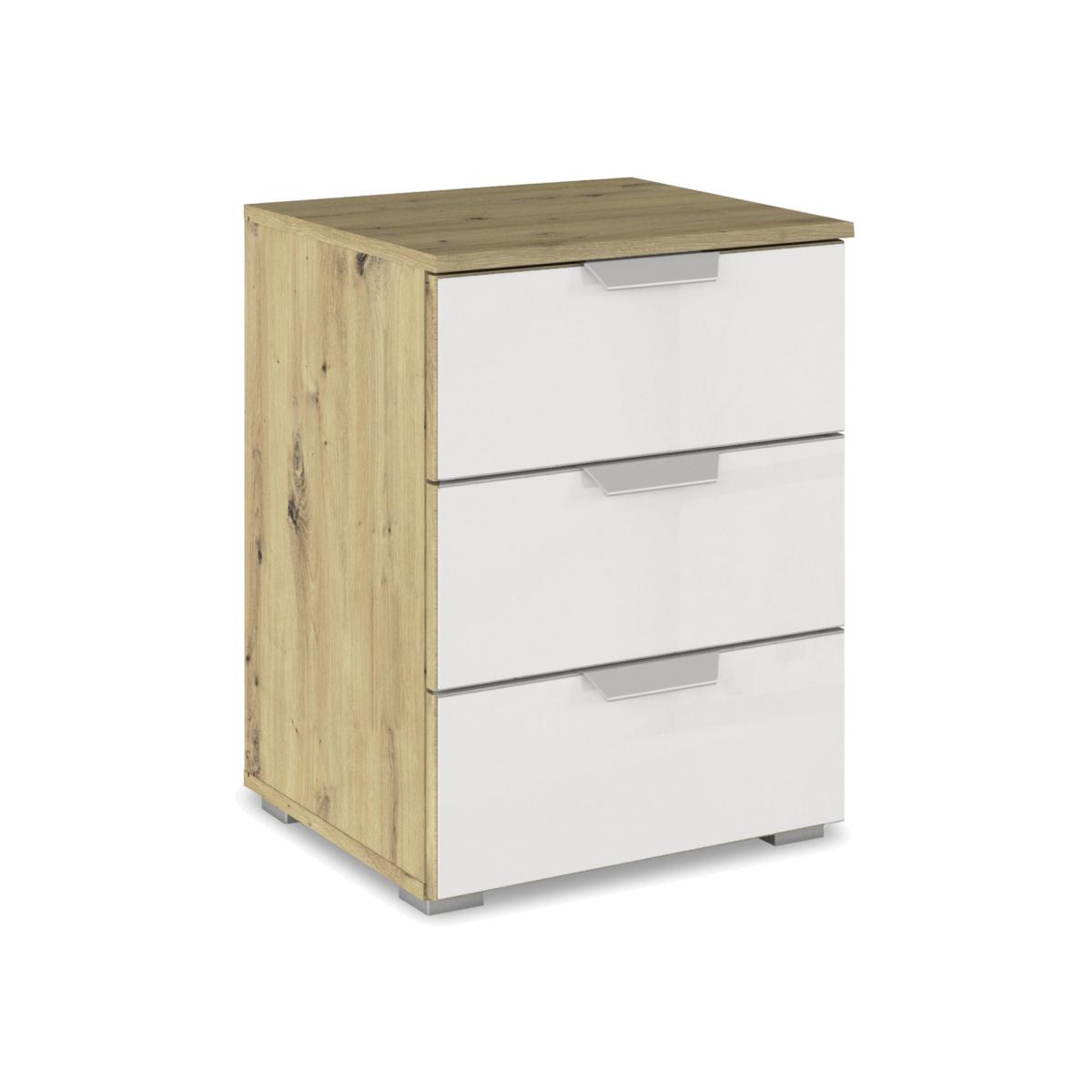 With so many sizes and styles of wardrobe plus chests of drawers, the Rauch Freja collection makes it so easy to create an on-trend and high-end bedroom look. Sliding door and hinged door wardrobes are offered in a choice of door finishes that include glass and decor as well as mirrored and an artisanal oak effect that matches the wardrobes’ frames. And with everything from two-door to five-door wardrobes available, there’s a sleek storage solution for any size of bedroom. Complete the look with a pair of bedside cabinets and a chest of drawers. And because it's made in Germany by Rauch, you’ll know that the Freja range offers exceptional standards of quality as well as unique style. This Rauch bedside cabinet also makes a lovely chest of drawers in a smaller bedroom. The glass drawer fronts are available in a choice of stylish colours. Why you'll love it Top-quality bedroom furniture from Rauch. On-trend style with an ultra-sleek finish. Choice of sophisticated colours for the glass drawer fronts. Soft-closing drawers with metal handles. Artisanal oak-effect frame. Made in Germany. This 3-drawer bedside cabinet is part of the Rauch Freja range. What you need to know Assembled in your home free of charge. The Rauch Freja range includes sliding and hinged door wardrobes, and chests of drawers. WARNING!