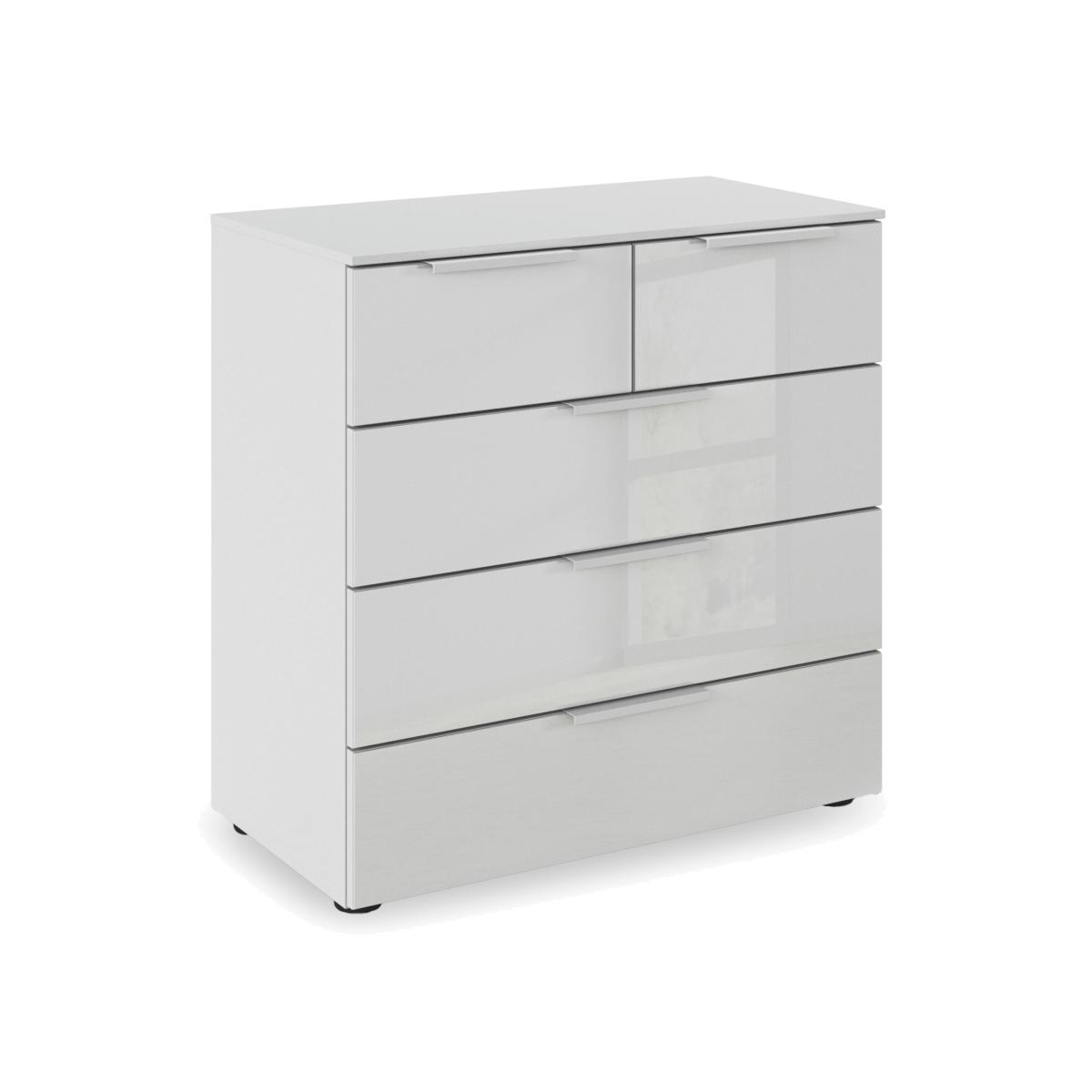 Sleek, modern and minimal, this five-drawer chest makes it easy to create a bedroom that’s a haven of calm and relaxation. In a choice of colours for the décor and glass finish. Why you'll love it Enjoy minimal style and maximum storage with our Rauch Haven range. Sleek and modern, this 3+2-drawer chest helps you create a calm, clutter-free bedroom. The décor frame and glass drawer fronts are available in a choice of fashionable colours. Stylishly matching handles. Soft-closing drawers. Made in Germany. Exclusively at Furniture Village. This 3+2-drawer chest is part of our Rauch Haven range. What you need to know Delivered, assembled and installed for you free of charge. Dust with a lint-free cloth. Do not use silicone-based furniture polishes. You’ll find a huge choice of wardrobes, chests of drawers and more in our Rauch Haven range. WARNING! Item code: HAV-CHT3GL-002