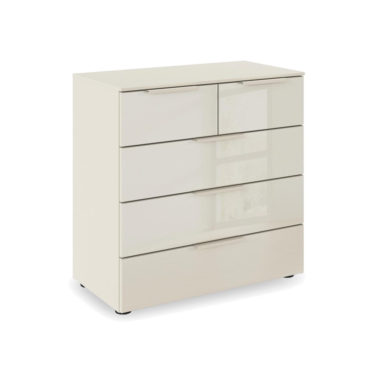 Sleek, modern and minimal, this five-drawer chest makes it easy to create a bedroom that’s a haven of calm and relaxation. In a choice of colours for the décor and glass finish. Why you'll love it Enjoy minimal style and maximum storage with our Rauch Haven range. Sleek and modern, this 3+2-drawer chest helps you create a calm, clutter-free bedroom. The décor frame and glass drawer fronts are available in a choice of fashionable colours. Stylishly matching handles. Soft-closing drawers. Made in Germany. Exclusively at Furniture Village. This 3+2-drawer chest is part of our Rauch Haven range. What you need to know Delivered, assembled and installed for you free of charge. Dust with a lint-free cloth. Do not use silicone-based furniture polishes. You’ll find a huge choice of wardrobes, chests of drawers and more in our Rauch Haven range. WARNING! Item code: HAV-CHT3GL-003