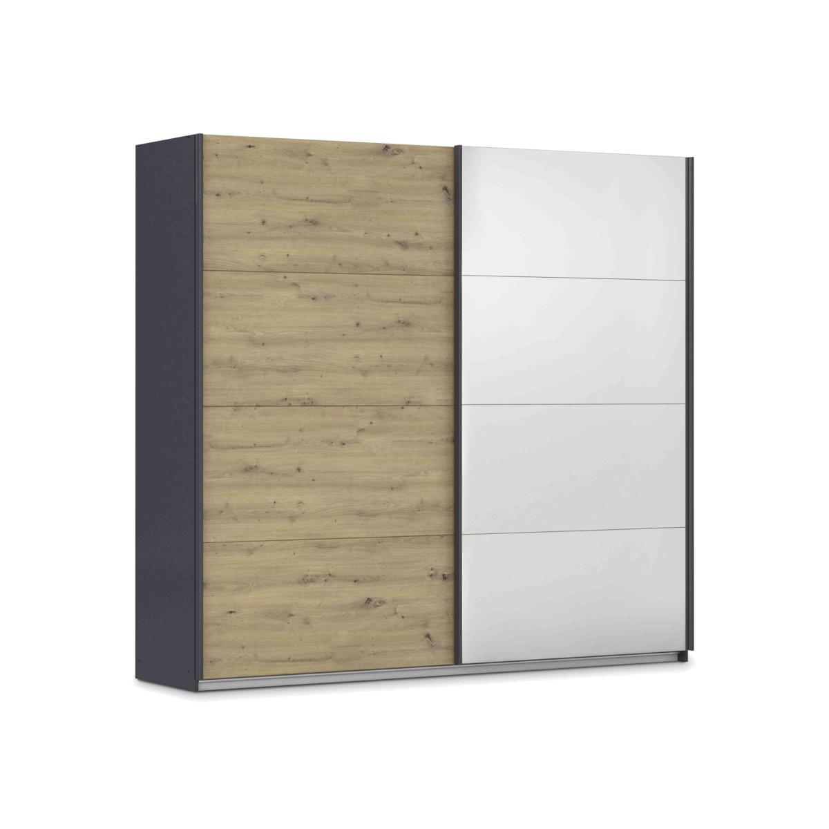 This large slider wardrobe makes a statement, packs a style punch – modern industrial flair all the way – and takes care of every storage need, big and small. By Rauch. Why you'll love it Superbly well- crafted bedroom furniture from Rauch. Modern industrial design for your cool and contemporary bedroom. Stylish combination of mirrored and artisanal oak- effect decor doors. Metallic grey frame enhances this wardrobe's urban look. Sliding doors are soft- closing and have metal door handles. Practical storage with 1 shelf and 1 hanging rail in each section. Make it just right for you by choosing from a range of extra interior fittings. Made in Germany. This 226 cm 2- door sliding wardrobe is part of the Rauch Leon range. What you need to know Assembled in your home free of charge. This sliding door wardrobe is available in a choice of widths to fit any bedroom. Create a stylish space with wardrobes and chests of drawers from the Rauch Leon range. WARNING! Furniture can tip over unexpectedly and cause injury. This item must be fixed to a wall using the anti- tip kit provided. Be sure to use the correct wall fixings suitable for the walls in your home. Furniture Village is not able to fix anti- tip devices for you. Seek professional advice if you are unsure.