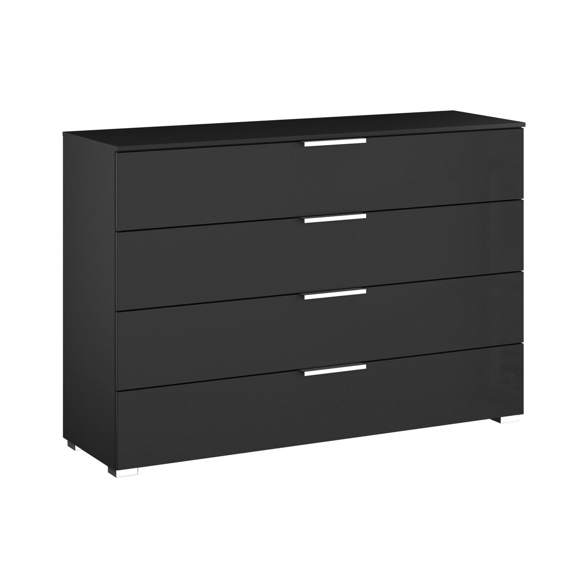 Sleek and contemporary bedroom style. Striking glass-fronted drawers. Designed and crafted in Germany by Rauch. Sleek bedroom style – and practical storage – is yours with the Perth 4 drawer wide chest of drawers. Beautifully crafted in Germany by Rauch, makers of ergonomic and contemporary bedroom furniture, this roomy chest of drawers combines modern good looks with exceptionally roomy storage in four wide drawers. The look is striking. Drawers are glass fronted a practical choice. This glass finish is extremely durable – it’s impact resistant, colourfast and UV-protected. High-end features abound. Drawers are soft close and are finished with smart linear chrome-effect handles. Feet are chrome effect. The Perth 4 drawer wide chest of drawer is part of the Perth bedroom furniture collection. The range includes a wide choice of sleek sliding door wardrobes with integrated mirrors and optional lighting plus chests of drawers in many sizes.