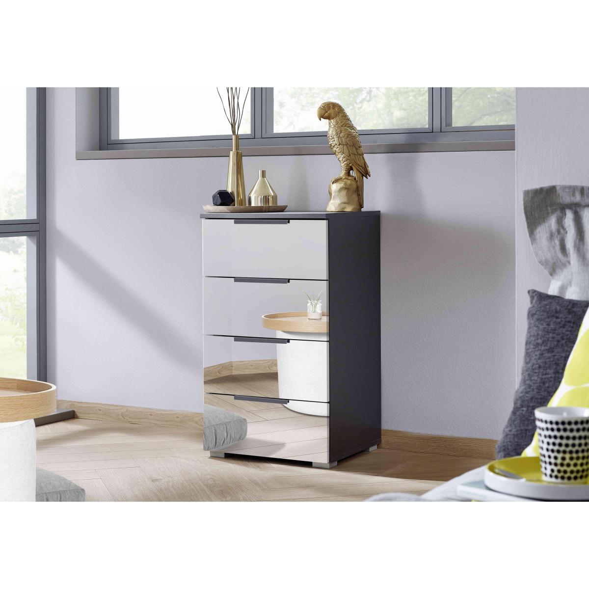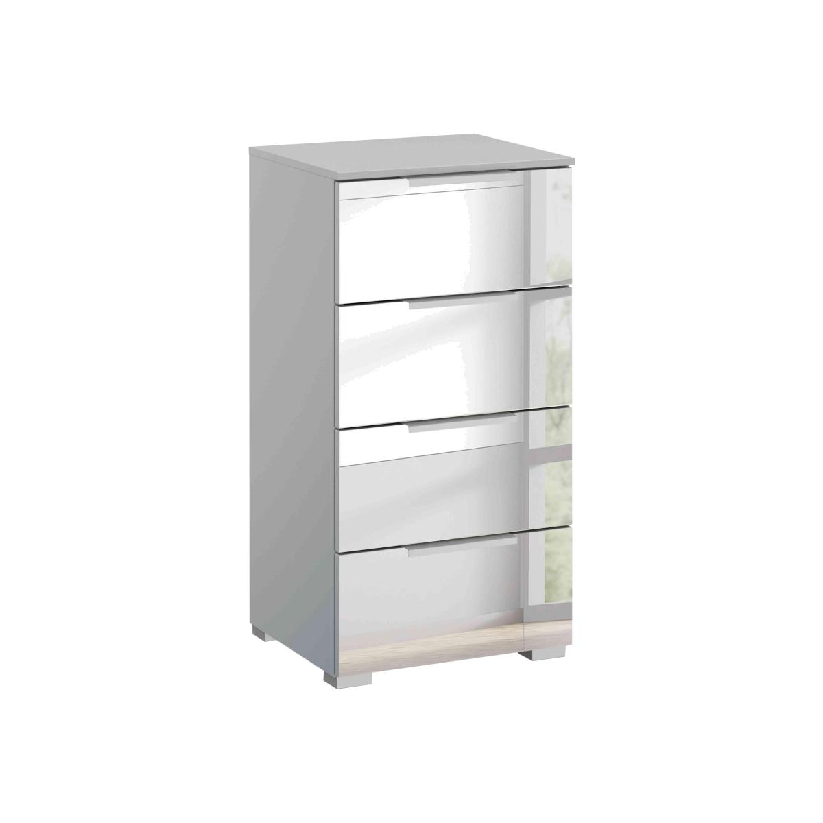 Love sleek style and ergonomic storage? We’ve found your bedroom furniture. Whatever the size of your bedroom, you’ll find a sliding wardrobe and chest of drawers to fit your space – perfectly – in the Rauch Rio collection. Offered in a choice of colours, wardrobes feature striking grey mirror-framed mirror doors, an innovative design choice that brings on-trend sophistication to any bedroom. The range includes mirrored chests of drawers in several sizes and a wide choice of interior fittings packages so you can add extra shelves, drawers and more to any wardrobe. Made in Germany by Rauch and only at Furniture Village. This small but tall chest of drawers makes it easy to enjoy sleek furniture style even if yours is a compact bedroom. We love those mirrored drawer fronts. Why you'll love it. Neat and compact 4-drawer chest oozes contemporary flair. Sophisticated modern style. Distinctive grey mirrored drawer fronts. Choice of colour finishes for the frame. Made in Germany by Rauch. Exclusively available at Furniture Village. This 4-drawer chest is part of the Rauch Rio range. What you need to know. Door handles are made of metal. Grey linen-effect interior. Assembled in your home free of charge. WARNING!. Furniture can tip over unexpectedly and cause injury. This item must be fixed to a wall using the anti-tip kit provided. Be sure to use the correct wall fixings suitable for the walls in your home. Furniture Village is not able to fix anti-tip devices for you. Seek professional advice if you are unsure.