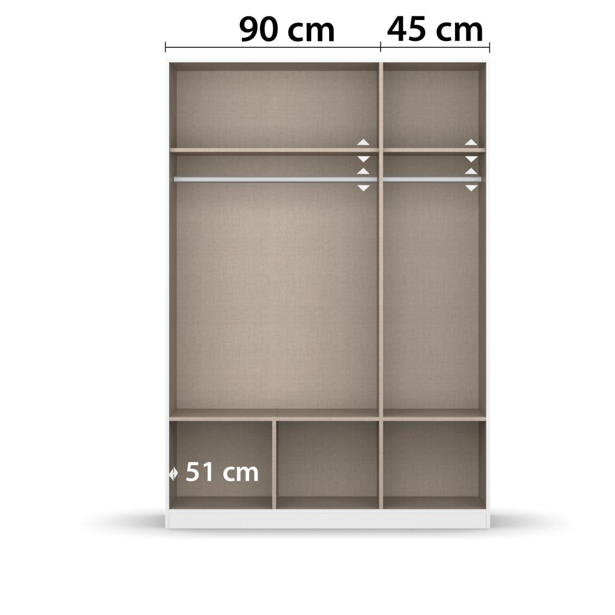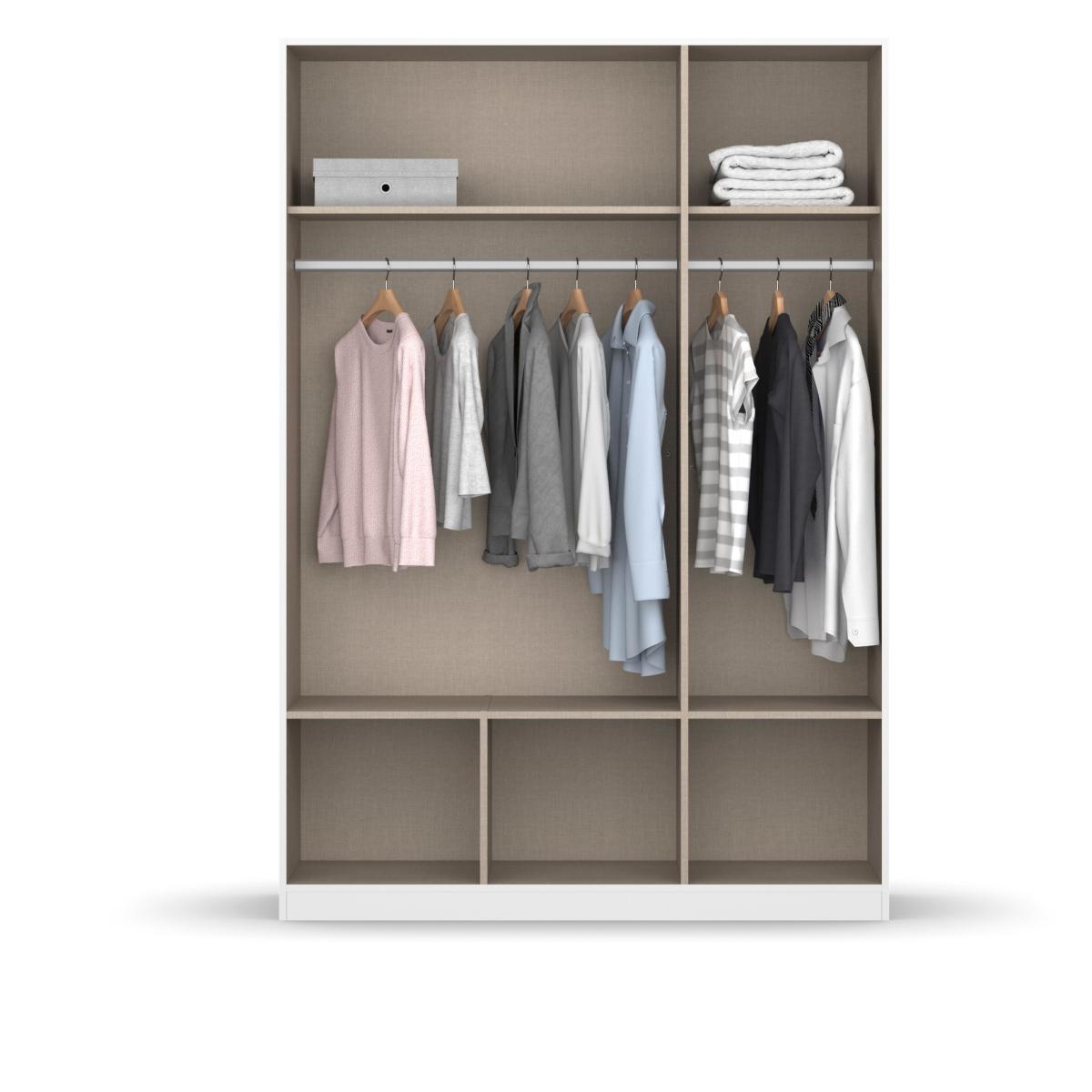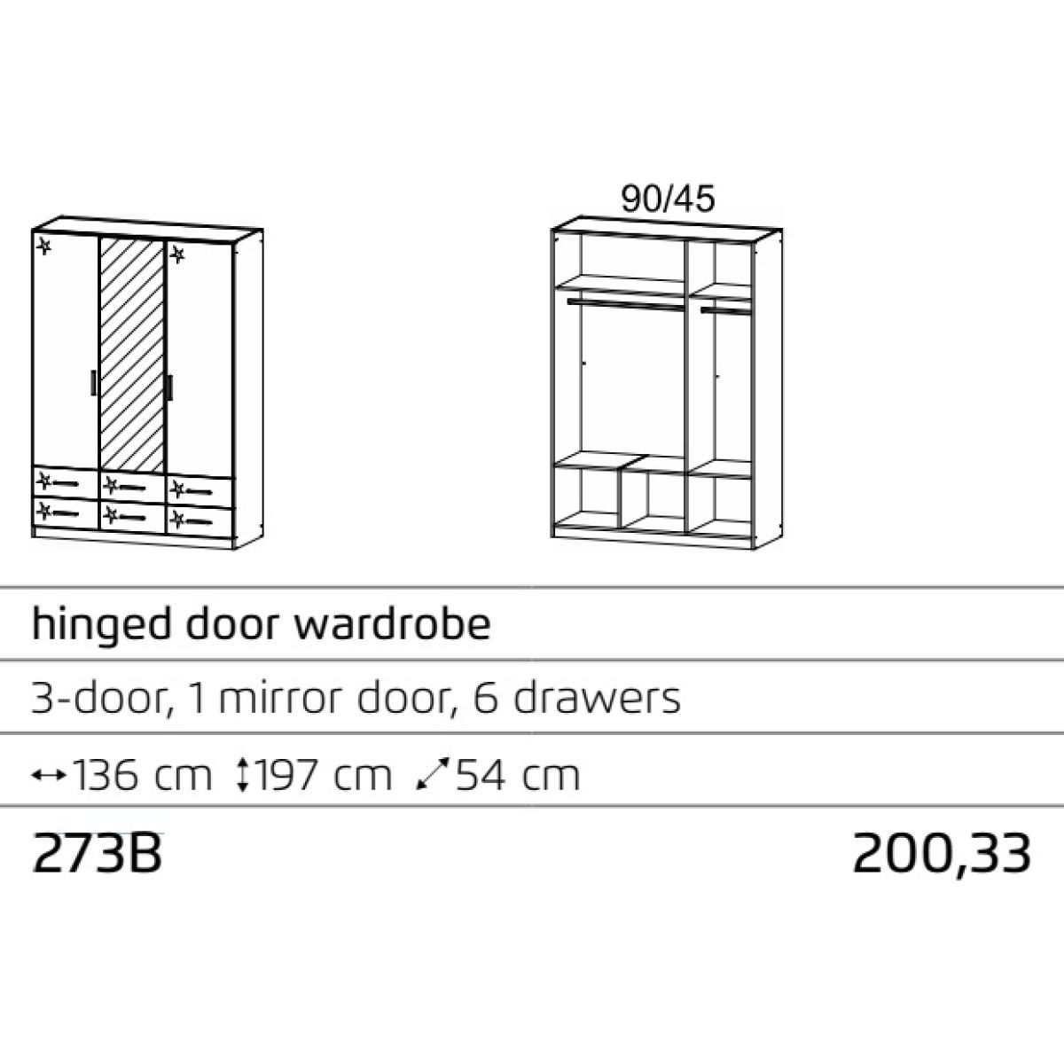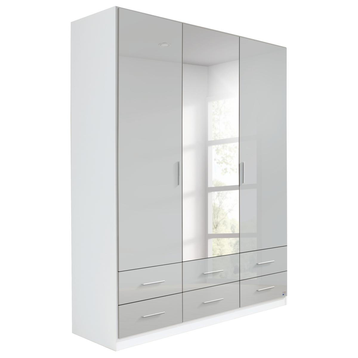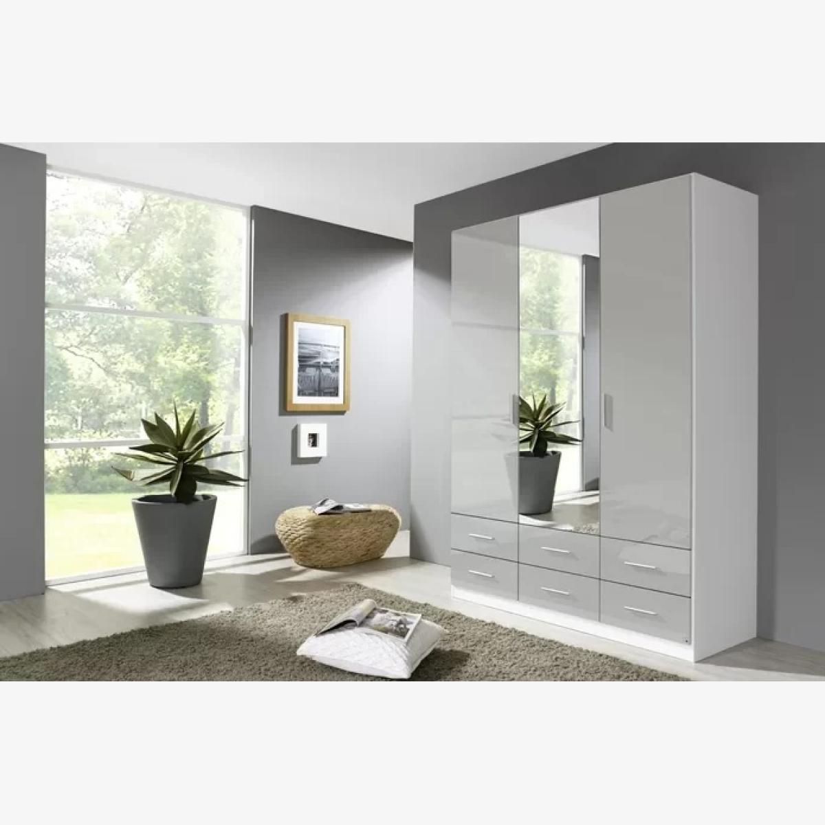 This Stuttgart hinged door wardrobe offers a chic stylish design. The wardrobe is available in either a 2 door, 3 door or 4 door design with a combination of storage drawers, mirrored and plain fronts. The Stuttgart range is available in a range of finishes including two high polish colours. Combining high quality craftsmanship with understated elegance this wardrobe oozes with style. Sleek, clean lines make up the stunning wardrobe that offers plenty of hanging space to neatly store away clothes. This wardrobe boasts even further space to store away items without taking up any further floor space. The mirrored fronts will project the light beautifully and offer a practical reflective area to get ready in. The aluminium coloured handles add to the contemporary feel. Finished to a very high standard this wardrobe will last for many years. Soft Grey Polished fronts with 1 mirrored door 6 drawers Alpine White Carcase Assembly Required Dimensions:H 197cm x W 136cm x D 54cm