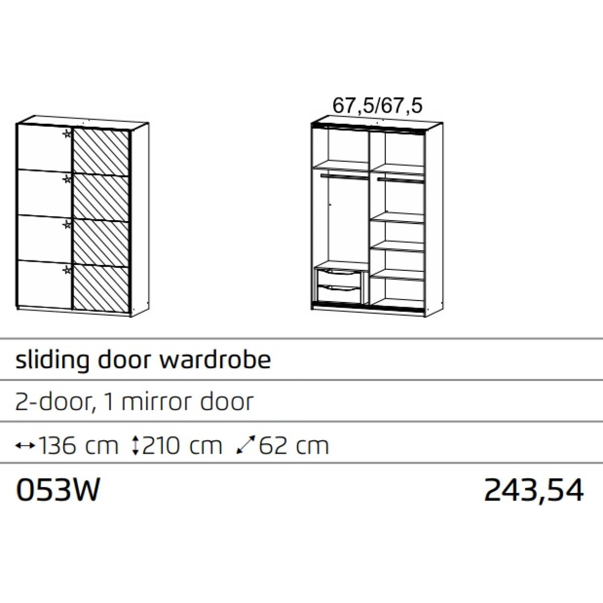The soft grey polished and mirror front doors complement the “sanremo oak” frame to give a contemporary yet functional range of furniture. As the doors slide open, no clearance is required for the doors to open so this robe is a great idea where space is in short supply. This multi-functional sliding door wardrobe features a hanging rail, upper shelf and internal chest of 2 drawers in one section and a hanging rail and 4 shelves in the other. Pair this with other pieces of the Stuttgart Bedroom Furniture collection for a sleek and stylish bedroom. Soft Grey and Mirrored Polished front Sanremo Oak Carcase Assembly Required Dimensions: 136cm W x 62cm D x 210cm H