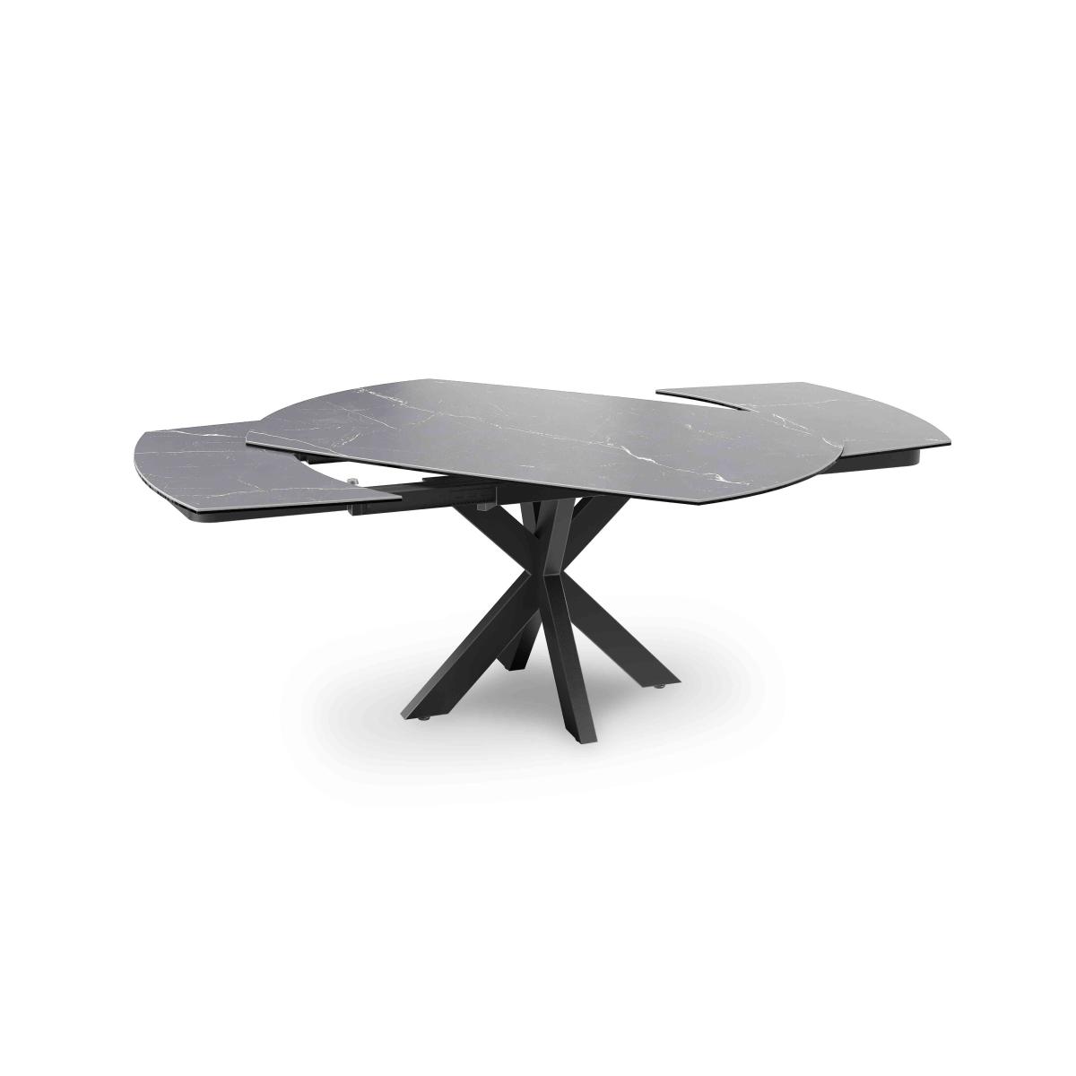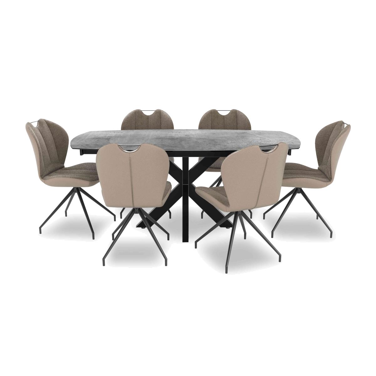 This beautiful dining table turns any dining room into the epitome of cool style. The swivel-top table rotates to extend and is finished in a silver-toned ceramic. This set includes six swivel chairs. Why you'll love it Part of our Modern Dining Collection. Sleek modern style for your on-trend contemporary home. Well-crafted extending dining table has a curved boat-shaped top. Sophisticated ceramic top is absolutely stunning. So easy to look after. Ceramic is scratch-resistant, chip-resistant and heat-resistant. Chunky matt black lacquered metal legs are arranged in a star shape. It’s ergonomic as well as elegant – the leg design allows you to seat more diners in comfort. To extend this dining table, simply rotate the table top. Dining set includes 6 dining chairs with integrated handles. Self-returning chair bases swivel 180° and then swivel back into place. Matt black lacquered steel legs. Upholstered in a choice of fabric colours. Only at Furniture Village. This dining set is part of our Raul range. What you need to know Chairs have matt black lacquered steel legs and foam seat cushioning. Large swivel dining table seats 8 closed and 10 when extended. Table top is 3 mm ceramic layer on 6 mm glass layer. Table has steel legs with a lacquered finish. Please note that the ceramic table top is not 100% heatproof. We recommend using coasters and placemats at all times. Wipe clean with a damp cloth. Dry with a soft duster. Do not use abrasive cleaning products. Part of our Raul collection of urban-style modern dining room furniture.