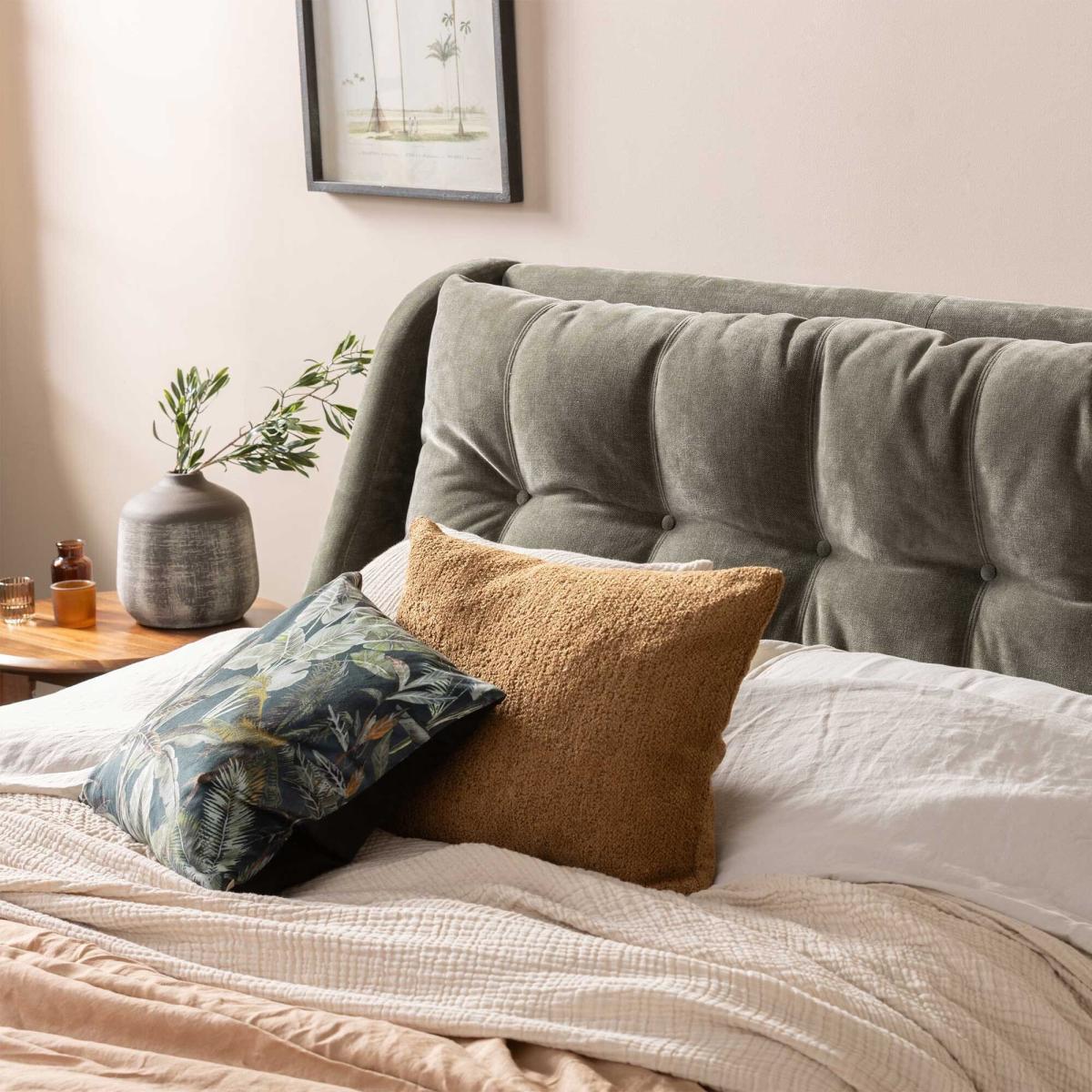 I love this green velvet super-king bed for its sculptural headboard and rich, tactile finish. The mossy tone and subtle tufting work equally well in modern, mid-century or art-deco schemes, and its low profile helps keep a bedroom feeling spacious and uncluttered. For styling, start with crisp white linens, then layer in charcoal cushions and a muted ochre or blush throw to add contrast. Pair it with simple brass-toned bedside tables that echo the feet, hang a streamlined pendant above, and bring in a few sculptural accessories or a leafy plant to ground the look.