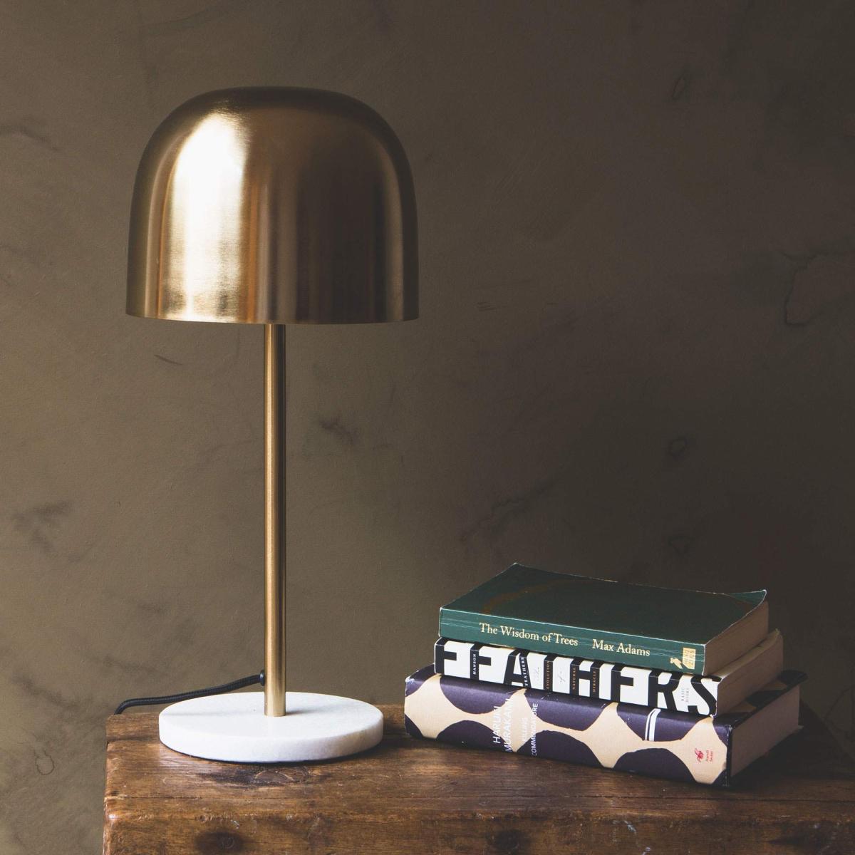 A contemporary style, our domed Raum brass lamp exudes clean lines and geometric influences. With a curved brass shade, long slim stand and circular marble base, this is a stylish way to light desks, table tops and dark corners.