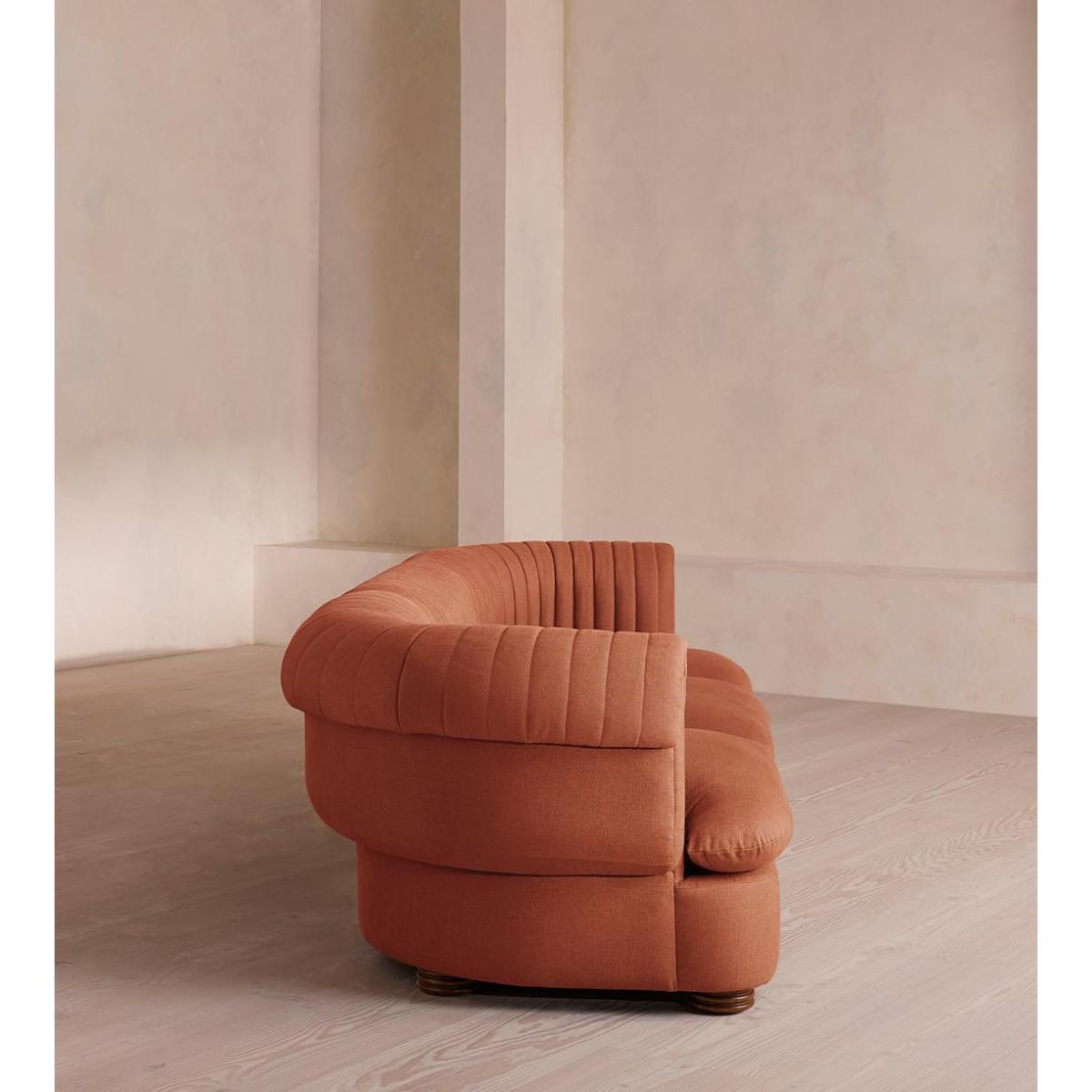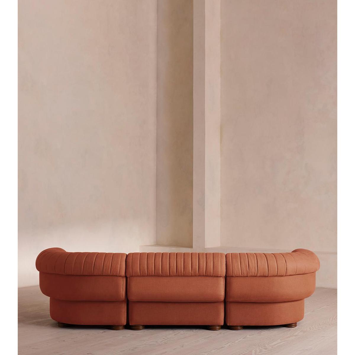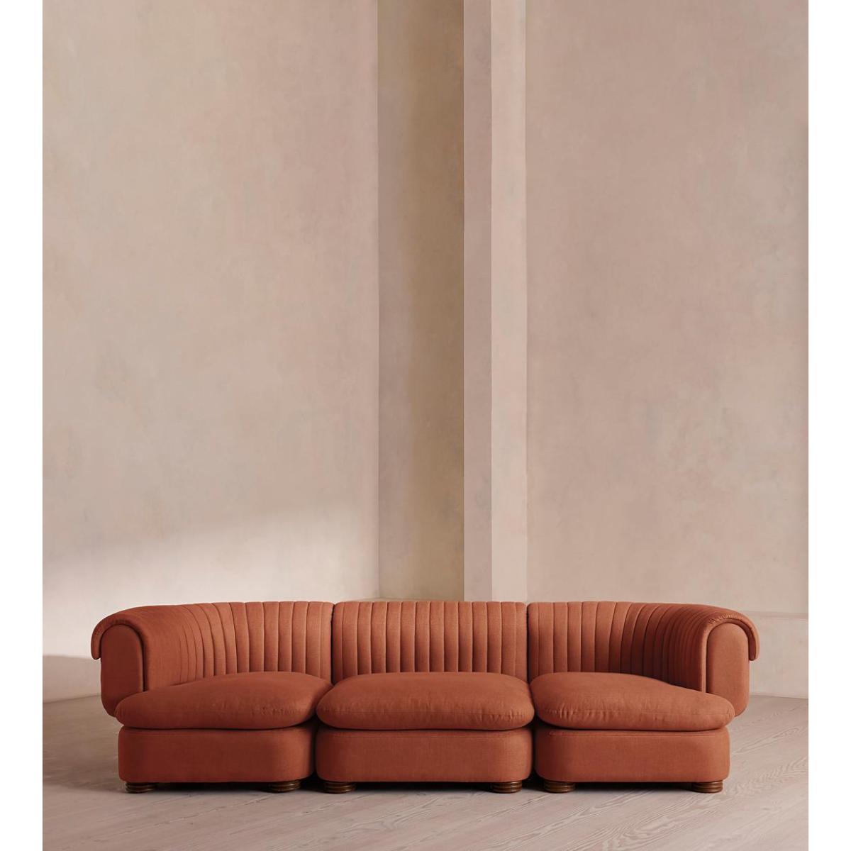 A soft, rounded four-seater silhouette with a fluted backrest is fully upholstered in linen. Fully wrapped in linen, the multi-functional Rava sofa is inspired by the social spaces in Soho House Nashville. Available fully formed or as separate modules, it pieces together with discrete crocodile clips to offer various seating arrangements to suit your own space.