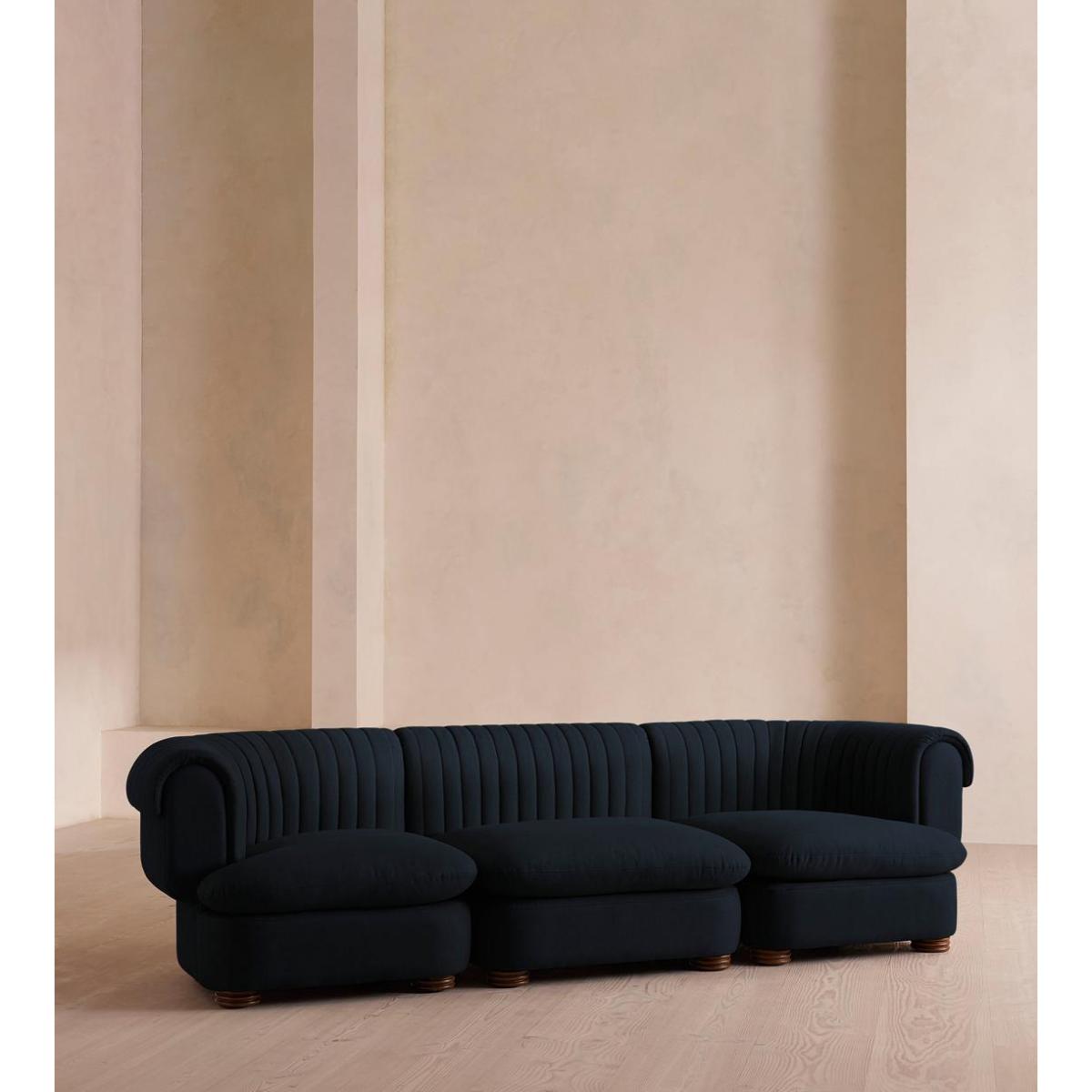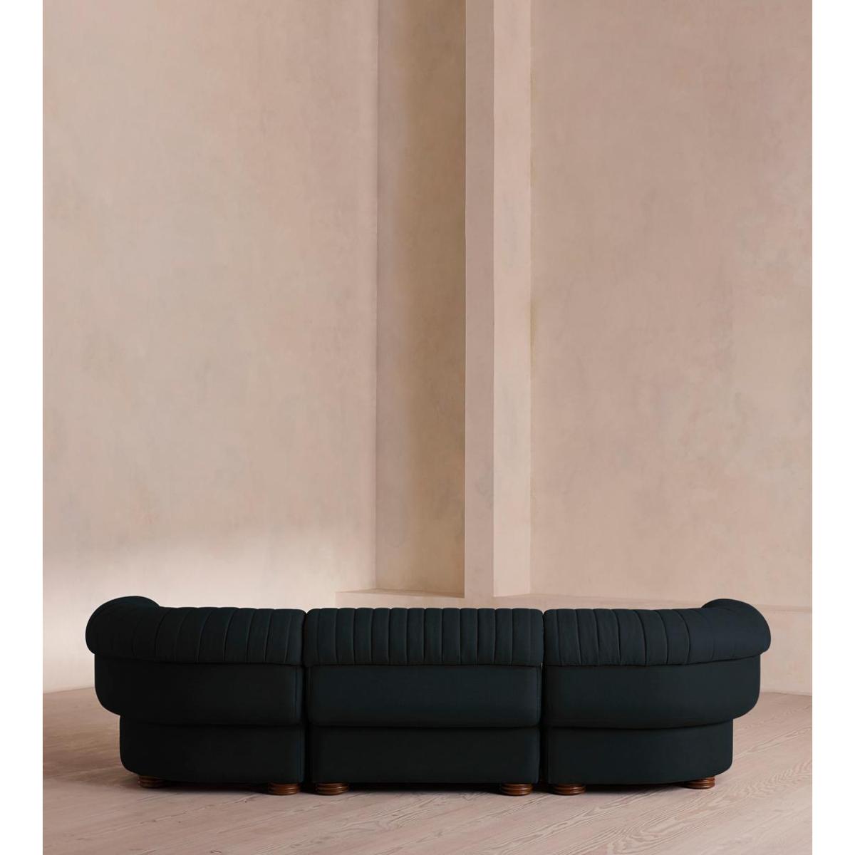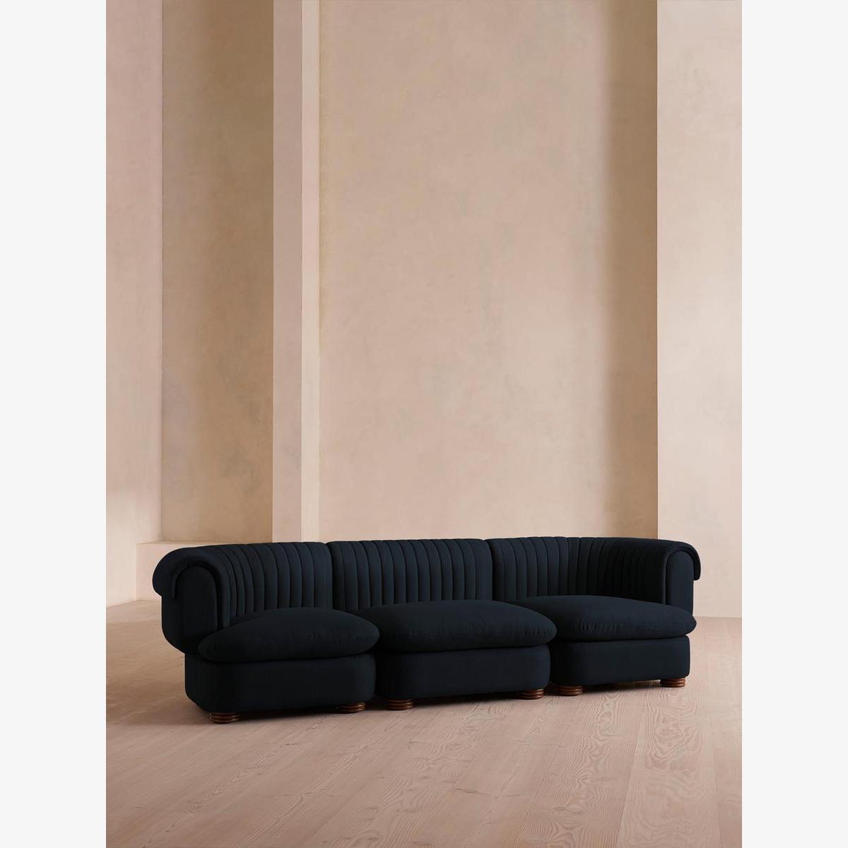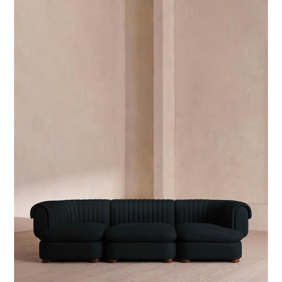 A soft, rounded four-seater silhouette with a fluted backrest is fully upholstered in linen. Fully wrapped in linen, the multi-functional Rava sofa is inspired by the social spaces in Soho House Nashville. Available fully formed or as separate modules, it pieces together with discrete crocodile clips to offer various seating arrangements to suit your own space.