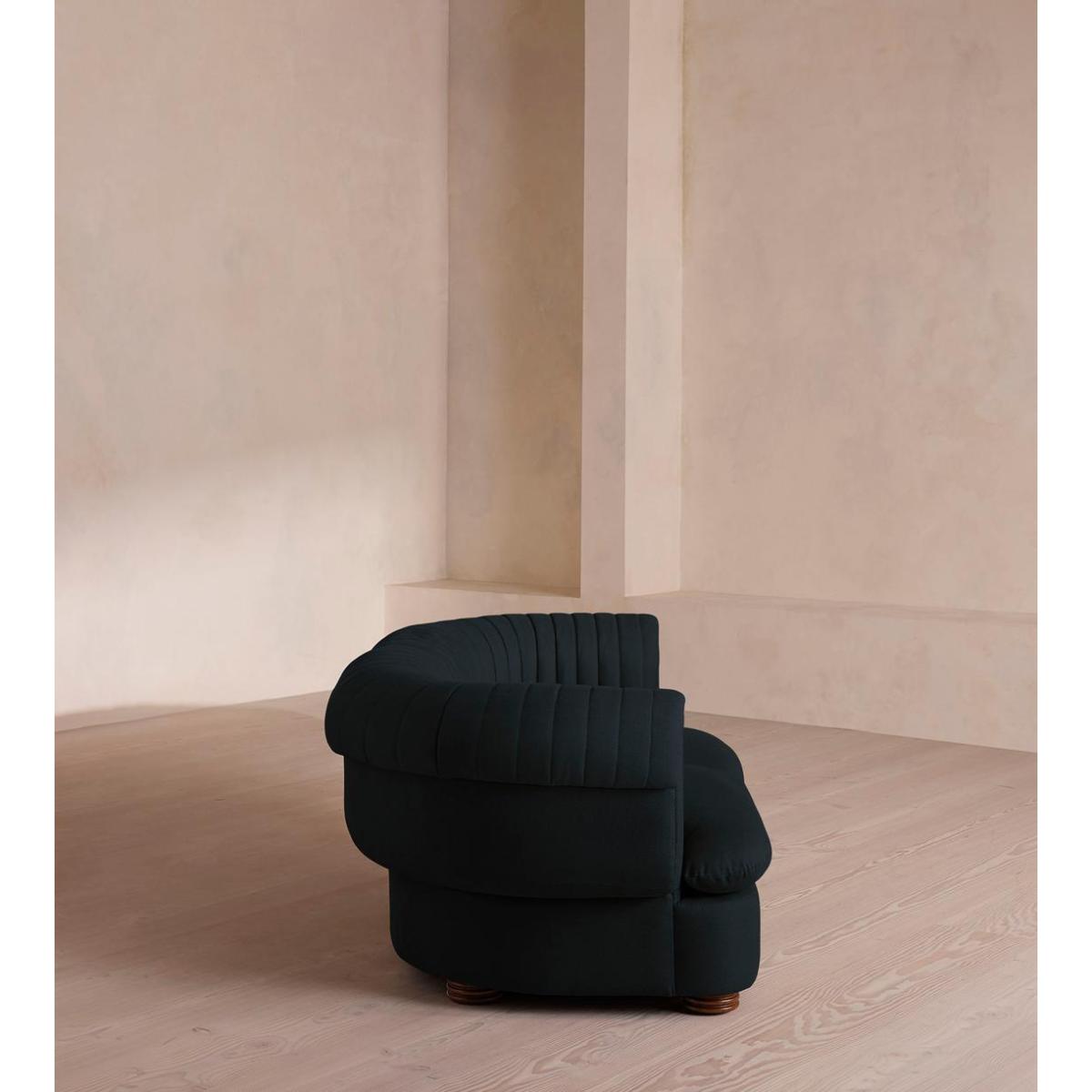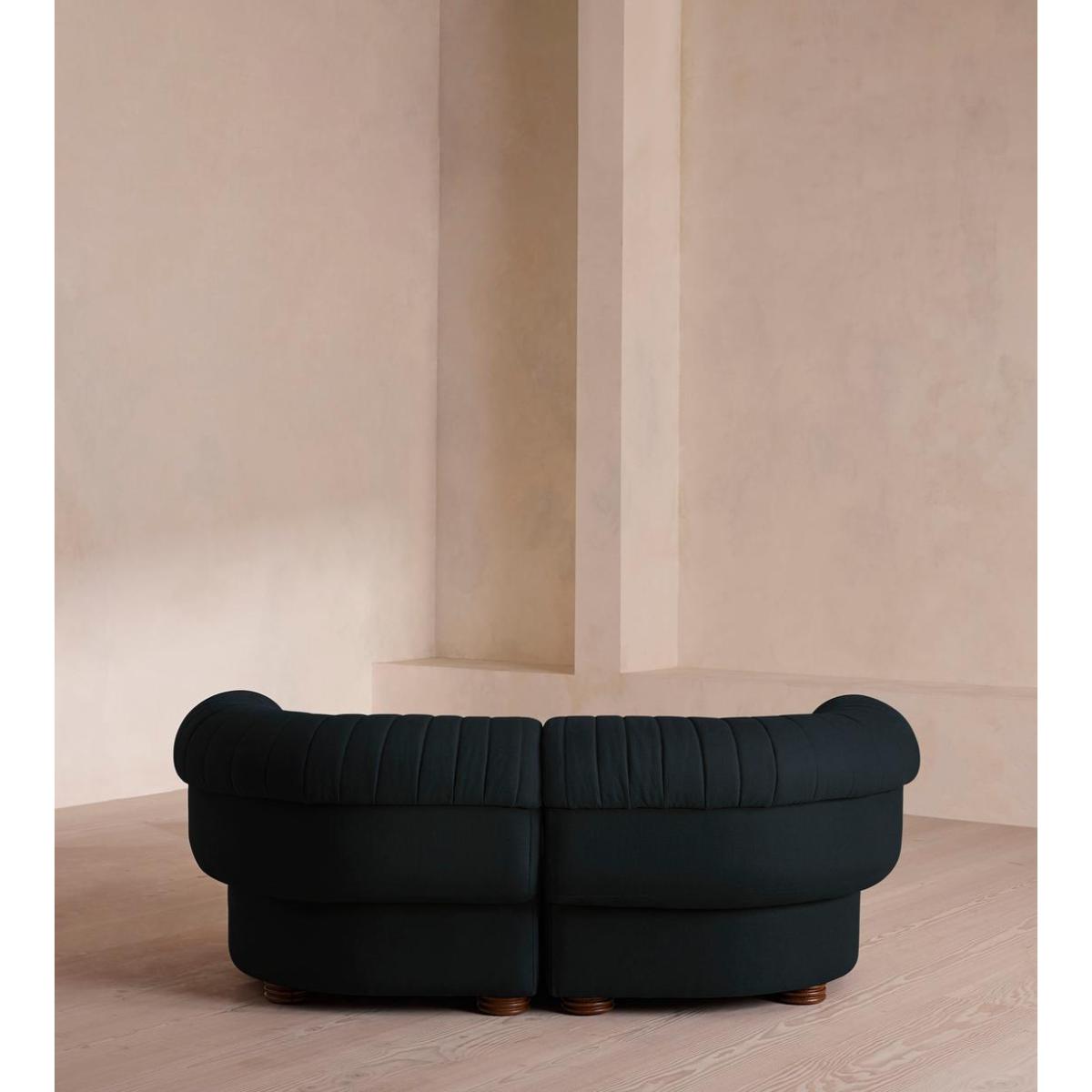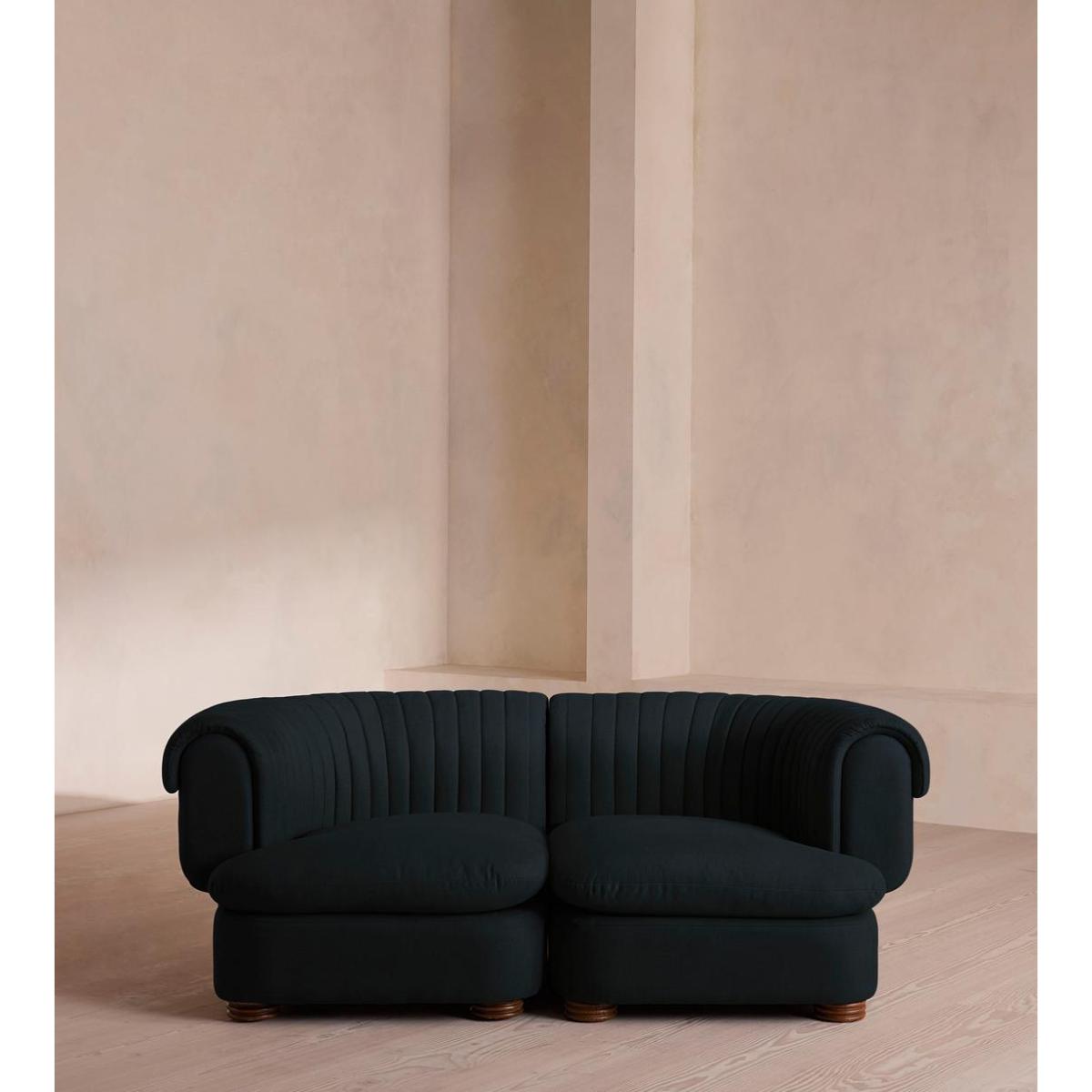 A soft, rounded three-seater silhouette with a fluted backrest is fully upholstered in linen. Fully wrapped in linen, the multi-functional Rava sofa is inspired by the social spaces in Soho House Nashville. Available fully formed or as separate modules, it pieces together with discrete crocodile clips to offer various seating arrangements to suit your own space.