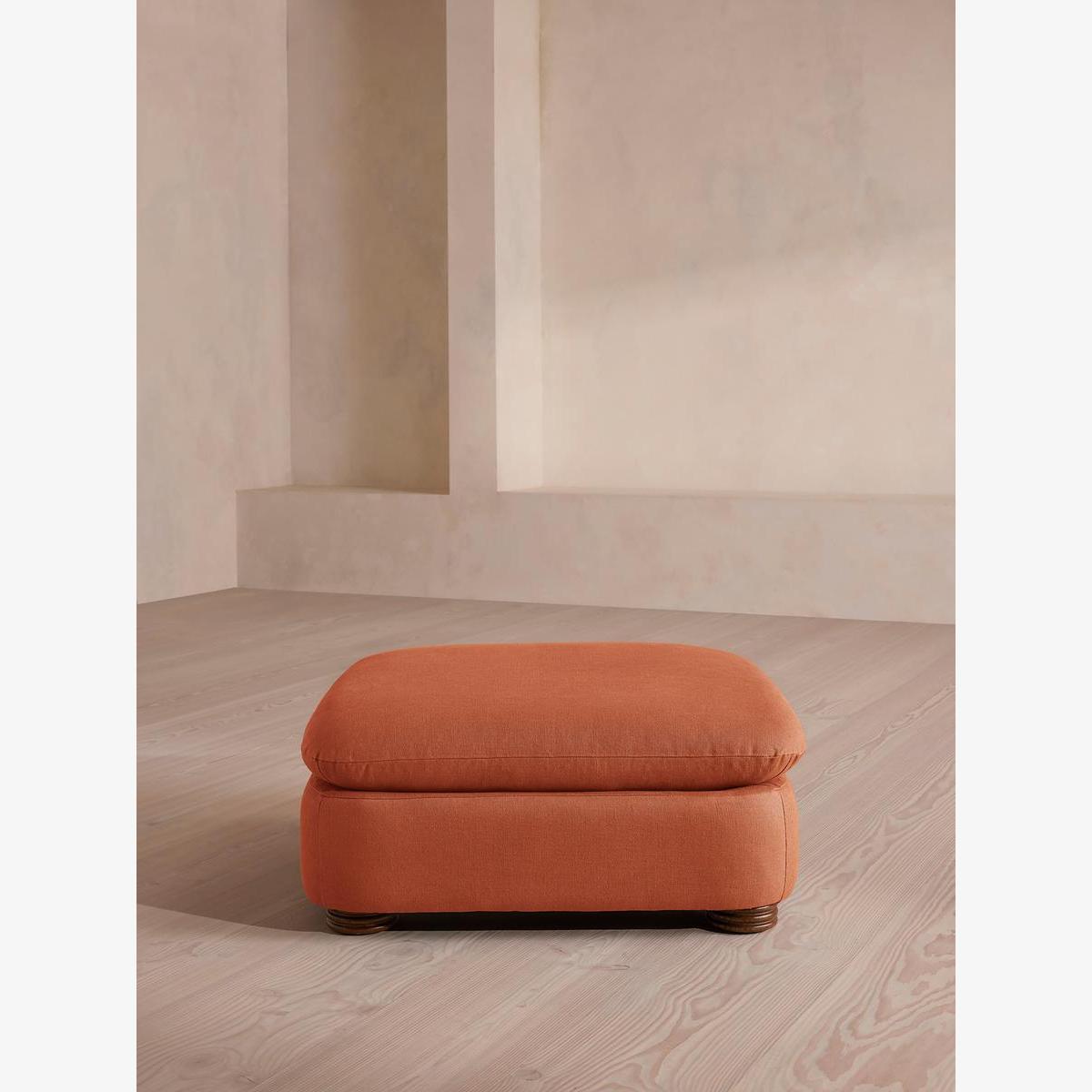 Designed to complement the Rava modular sofa, a square silhouette is softened by curved edges and wrapped in linen. Taking cues from the social spaces of Soho House Nashville, this ottoman is designed to complement the Rava modular sofa. Upholstered in linen that comes in our full made-to-order palette, its square silhouette is rounded at the corners for a soft, comfortable finish.