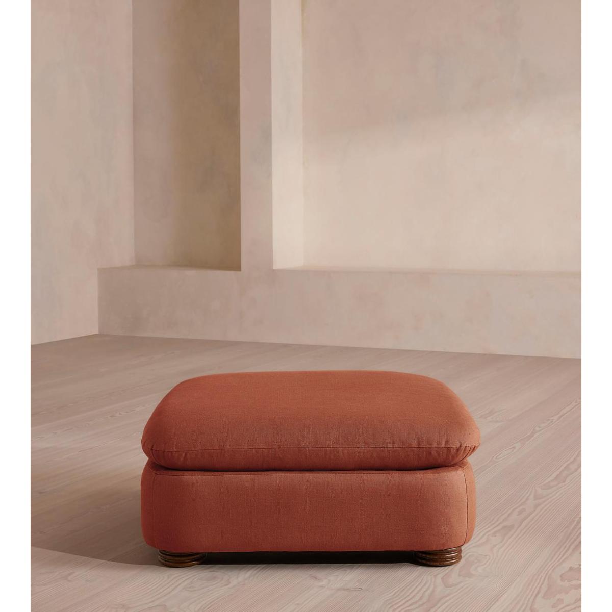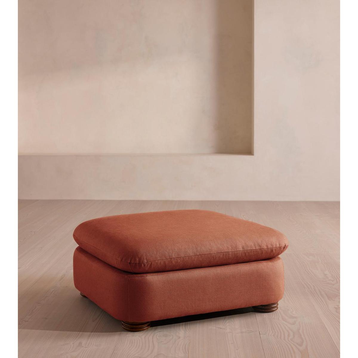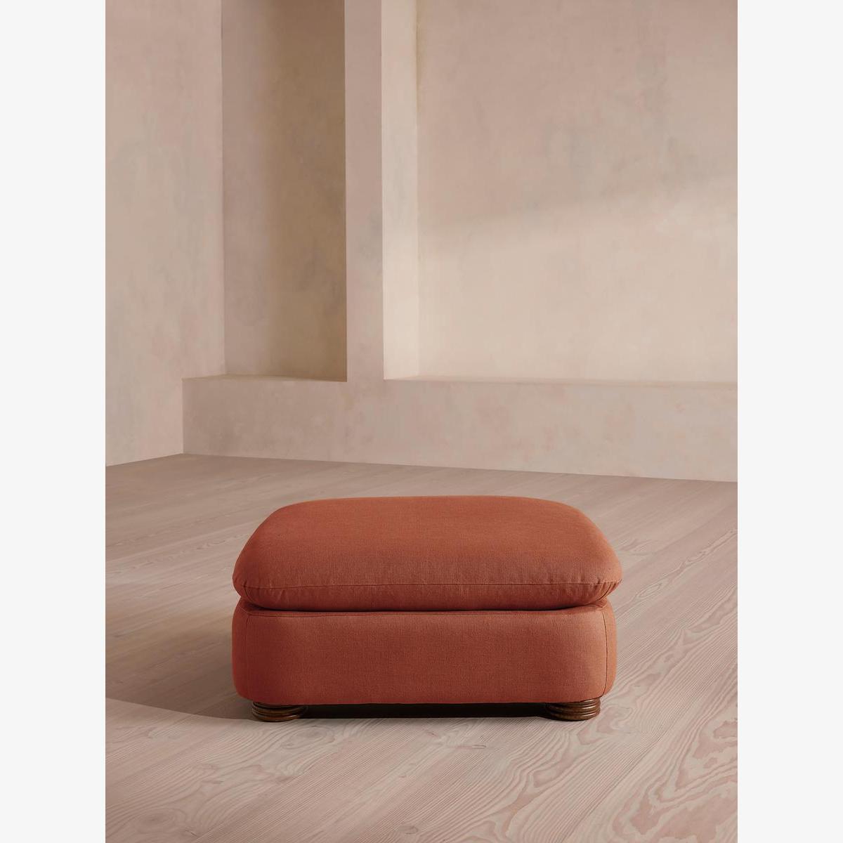 Designed to complement the Rava modular sofa, a square silhouette is softened by curved edges and wrapped in linen. Taking cues from the social spaces of Soho House Nashville, this ottoman is designed to complement the Rava modular sofa. Upholstered in linen that comes in our full made-to-order palette, its square silhouette is rounded at the corners for a soft, comfortable finish.