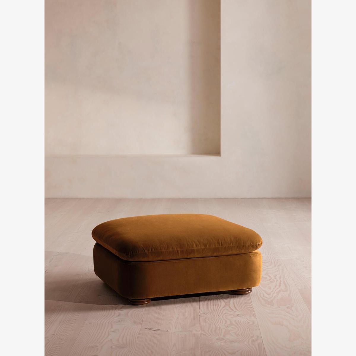 Designed to complement the Rava modular sofa, a square silhouette is softened by curved edges and wrapped in velvet. Taking cues from the social spaces of Soho House Nashville, this ottoman is designed to complement the Rava modular sofa. Upholstered in velvet that comes in our full made-to-order palette, its square silhouette is rounded at the corners for a soft, comfortable finish.