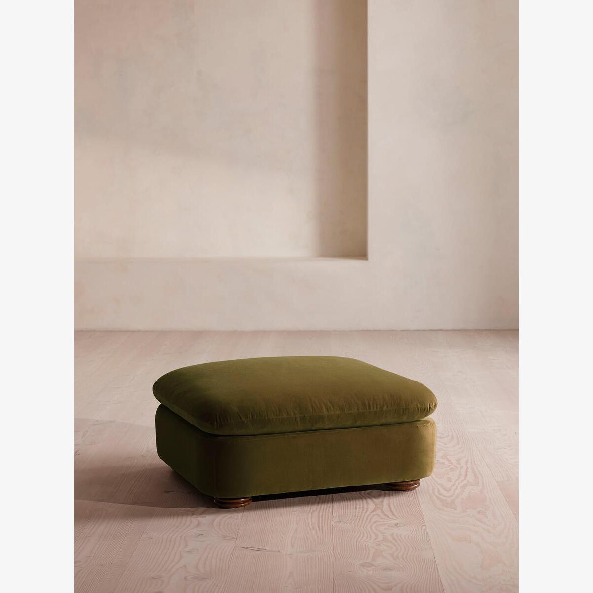 Designed to complement the Rava modular sofa, a square silhouette is softened by curved edges and wrapped in velvet. Taking cues from the social spaces of Soho House Nashville, this ottoman is designed to complement the Rava modular sofa. Upholstered in velvet that comes in our full made-to-order palette, its square silhouette is rounded at the corners for a soft, comfortable finish.