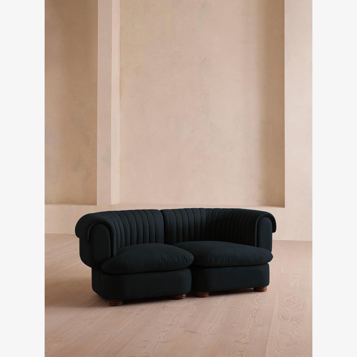 I love this two-tone sofa for its versatile and timeless appeal. The linen upholstery in indigo offers a relaxed yet refined look that works well in both classic and contemporary interiors. It’s a great choice for neutral schemes, adding a pop of colour without feeling overwhelming, and pairs beautifully with natural materials like wood and linen for a layered, cosy feel. Practical styling tips include keeping accessories simple with neutral cushions or textured throws to emphasise its understated elegance. This sofa’s shape is inviting and sturdy, making it ideal for a laid-back family space or a casual lounge, while still adding a sophisticated touch to a more formal setting.