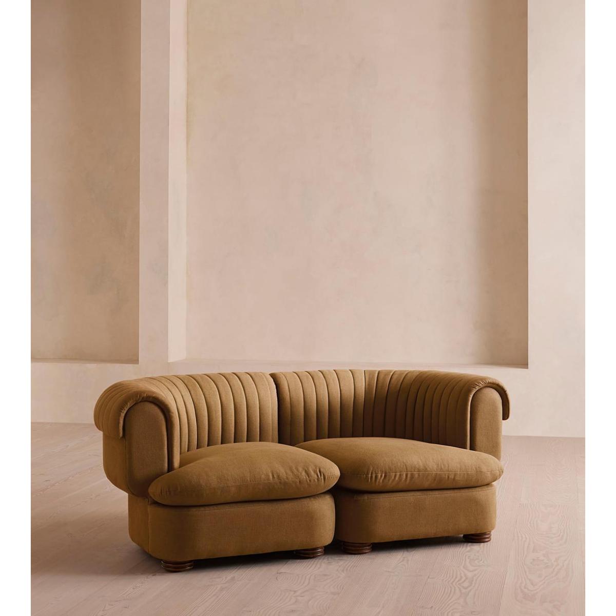 A soft, rounded three-seater silhouette with a fluted backrest is fully upholstered in linen. Fully wrapped in linen, the multi-functional Rava sofa is inspired by the social spaces in Soho House Nashville. Available fully formed or as separate modules, it pieces together with discrete crocodile clips to offer various seating arrangements to suit your own space.