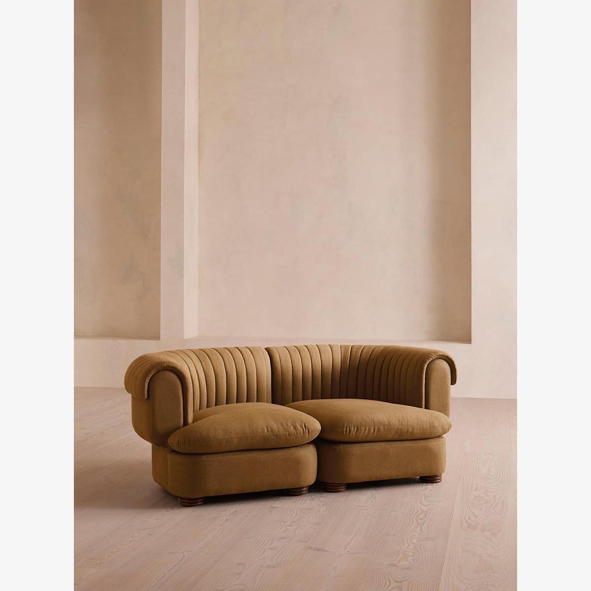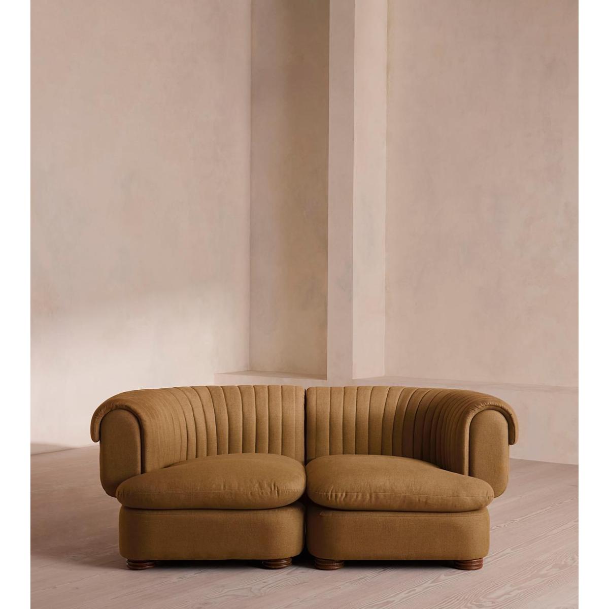 I really like this sofa for its versatile style and relaxed elegance. The linen fabric in ochre adds warmth and a natural feel, making it ideal for both modern and traditional interiors. It works particularly well in eclectic or boho schemes when paired with textured cushions and layered throws, but it can also stand out against minimalist backgrounds for a splash of colour. For practical styling, consider pairing it with neutral-toned rugs and accessories that pick up on the ochre hue to create a cohesive look. Its curved shape makes it perfect for creating inviting social spaces or cosy corners, and it's a great choice for bedrooms or living rooms that aim for a stylish yet comfortable vibe.