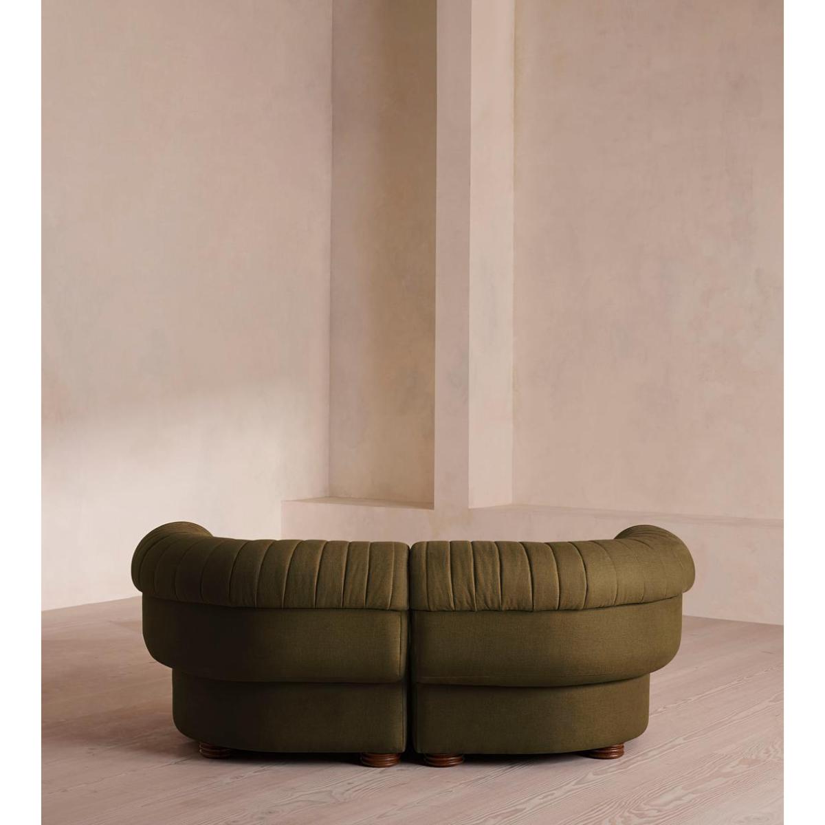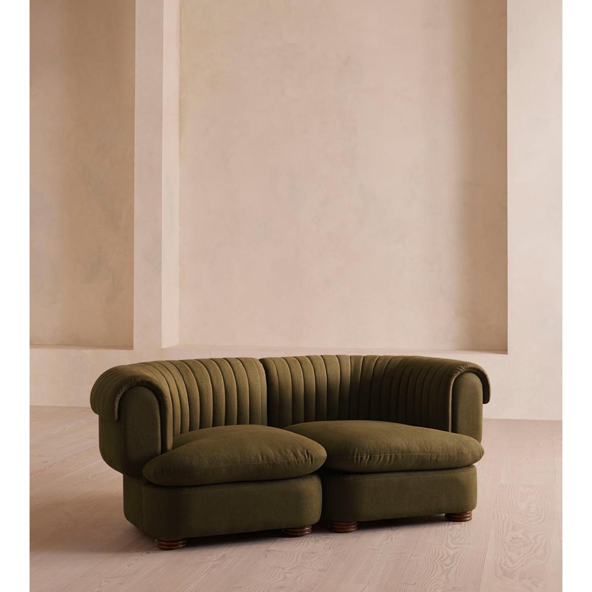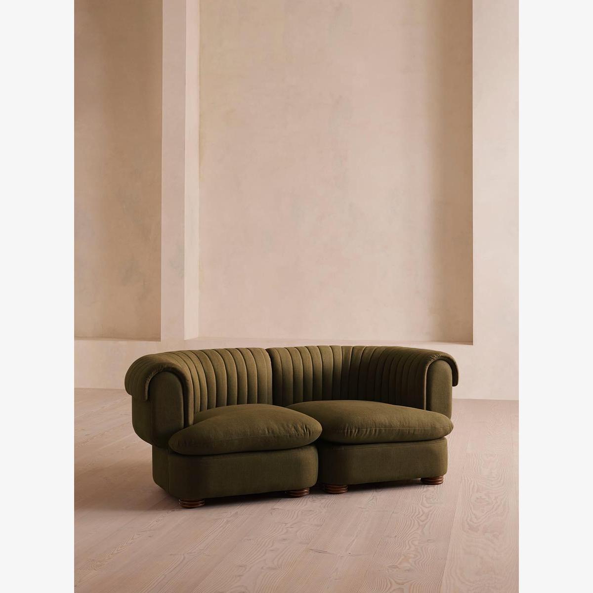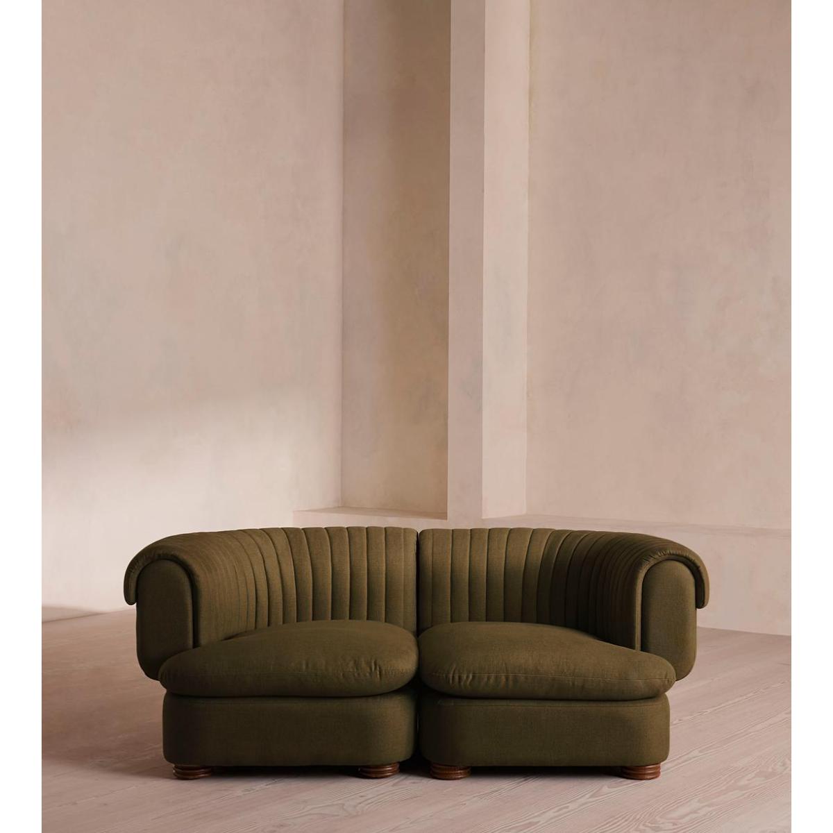 A soft, rounded three-seater silhouette with a fluted backrest is fully upholstered in linen. Fully wrapped in linen, the multi-functional Rava sofa is inspired by the social spaces in Soho House Nashville. Available fully formed or as separate modules, it pieces together with discrete crocodile clips to offer various seating arrangements to suit your own space.