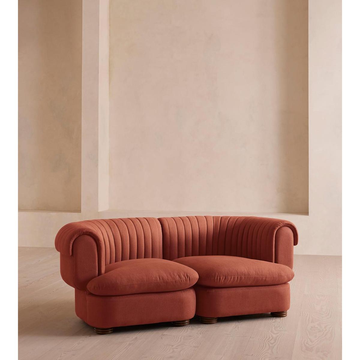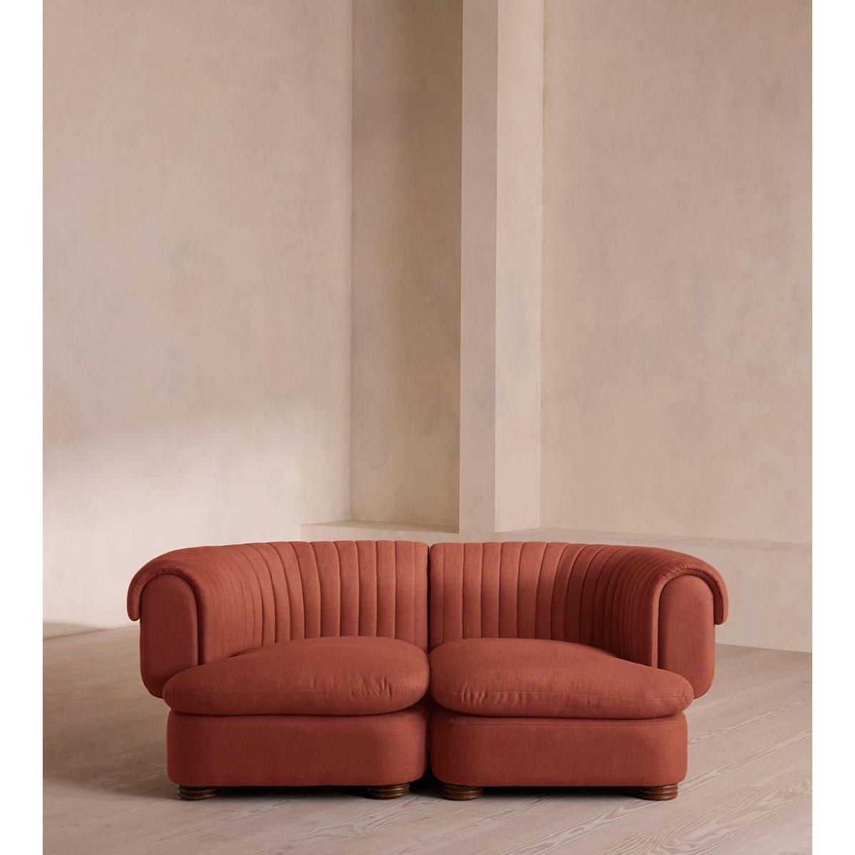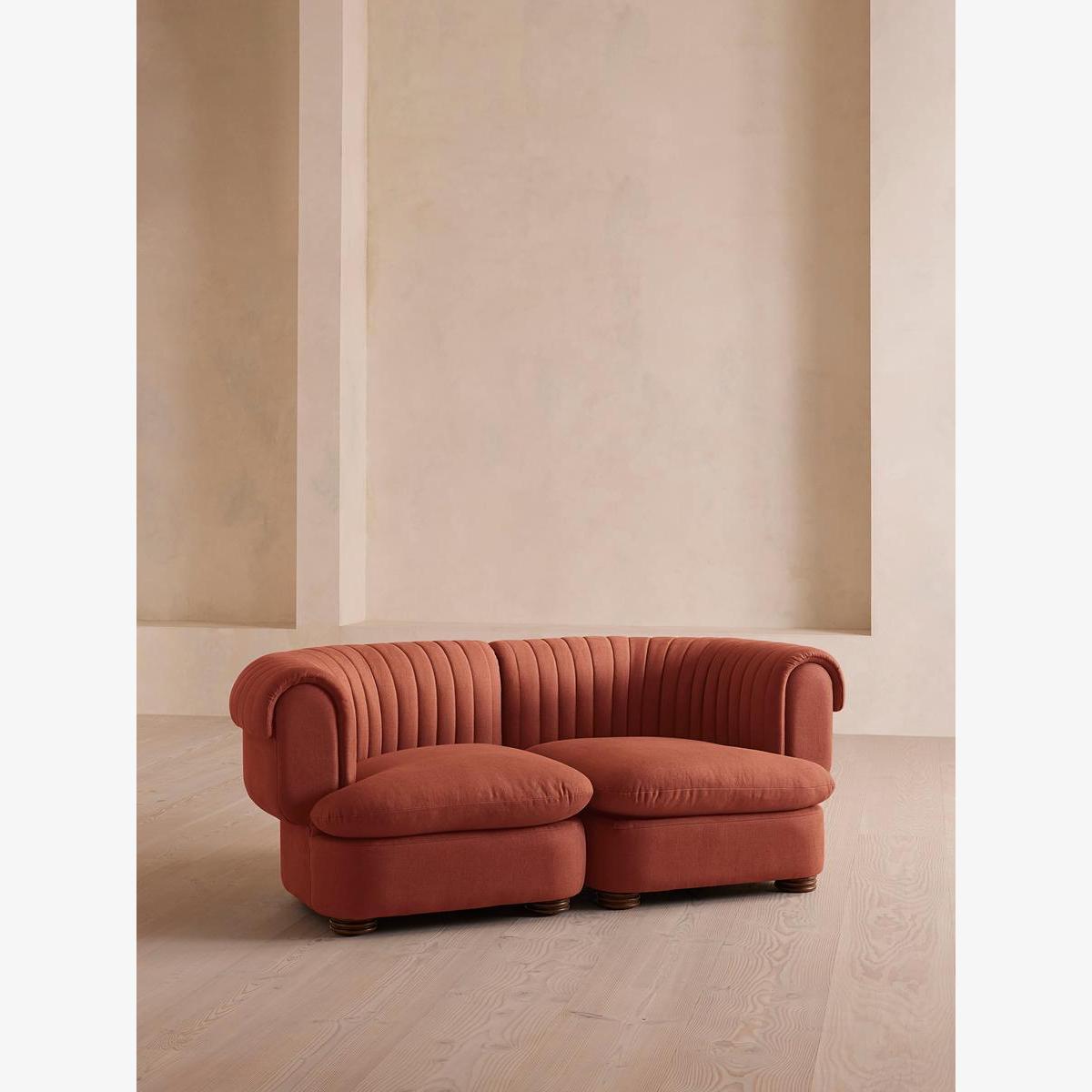 I love this sofa for its classic yet contemporary appeal-its linen fabric and sienna colour bring warmth and texture to a space. It works particularly well in relaxed, understated interiors, such as modern boho or minimalist schemes, where it can be styled with layered textiles and plants for a lived-in feel. Practical styling tips include pairing it with neutral or earth-tone cushions to highlight the sienna hue, or contrasting it with crisp white walls to really make the colour pop. The curved silhouette and comfortable size make it ideal for both entertaining and everyday living, adding a touch of cosy sophistication without overwhelming a room.