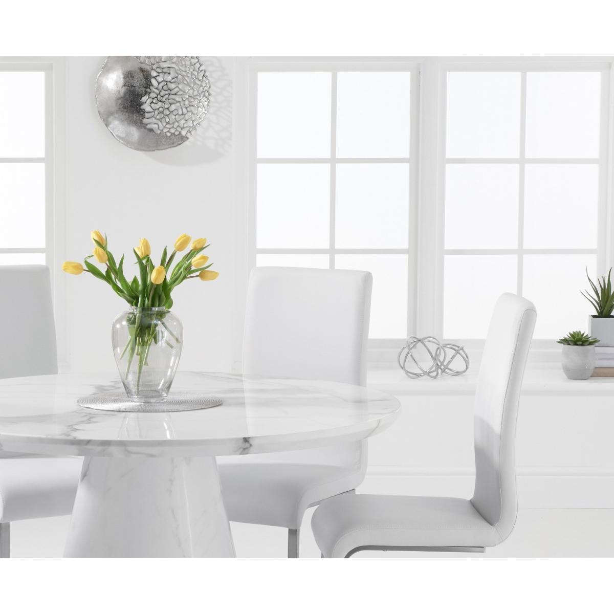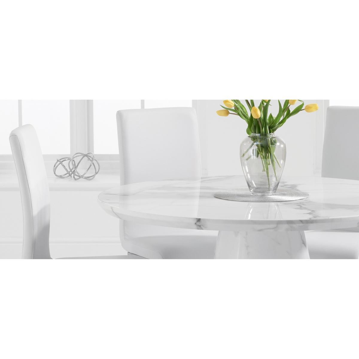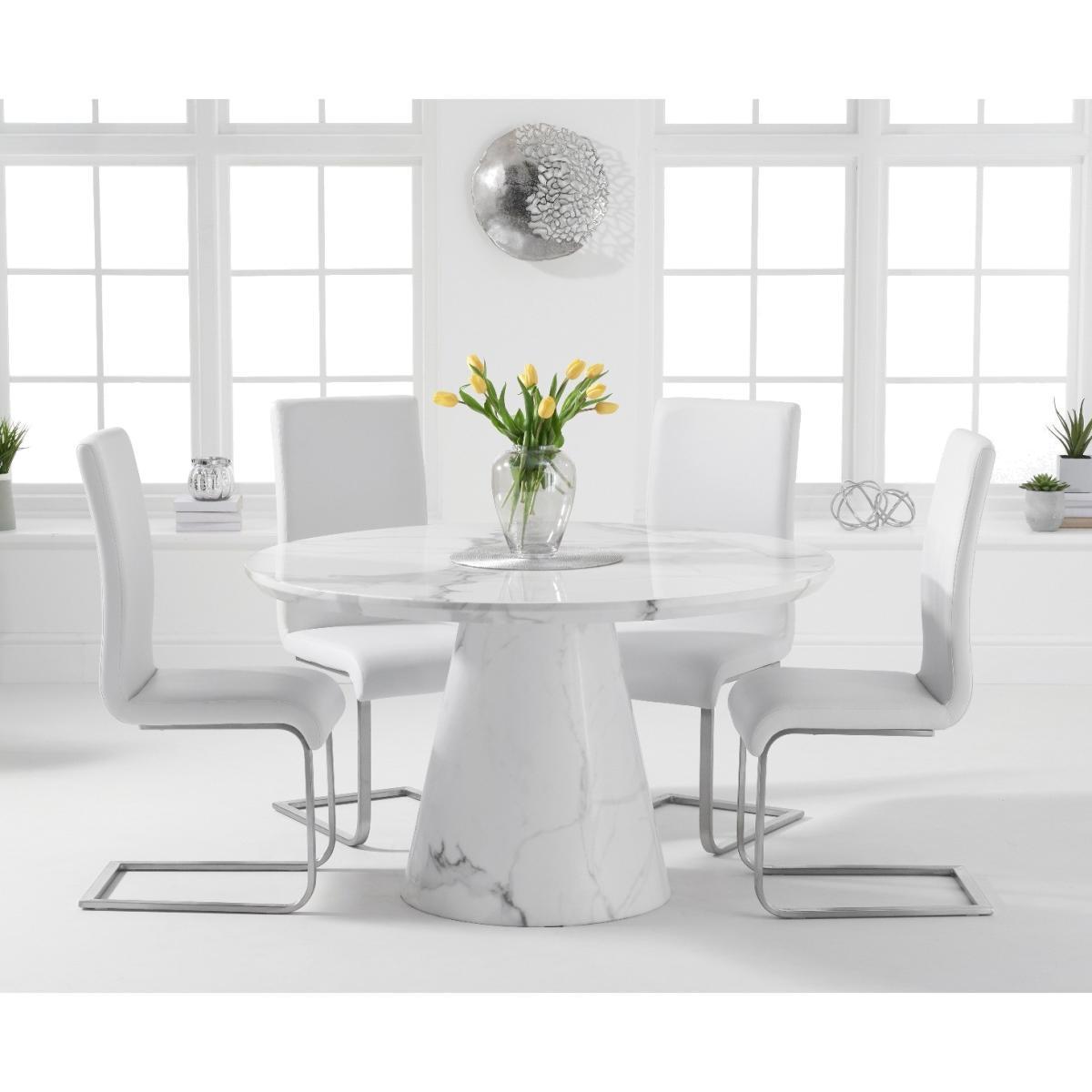 Sleek and modern, the Ravello 130cm Round White Marble Dining Table with Malaga Chairs is a stunning dining set. The small Ravello table is chic and space saving with a smooth round table top and pedestal base. Malaga chairs complete the set with faux leather and hooped metal legs. Small and stylish marble dining set makes an impression. Designed to seat 6 people. Round white marble dining table Smooth table top and modern pedestal base. Wipe-clean glossy finish. Malaga Chairs complete the set. Faux leather in a choice of colours. Hooped brushed metal legs*Ground Floor Delivery Only