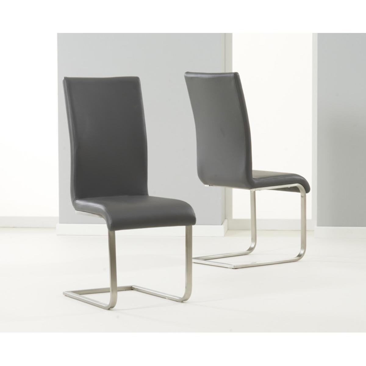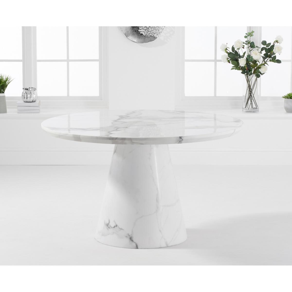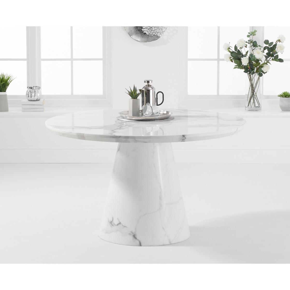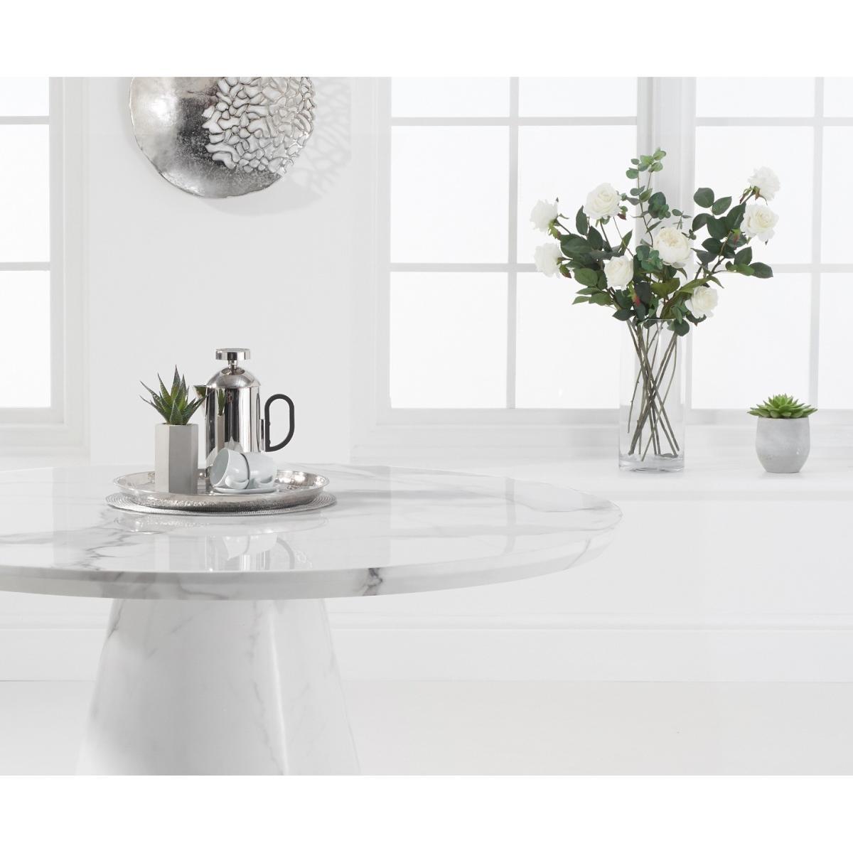 Sleek and modern, the Ravello 130cm Round White Marble Dining Table with Malaga Chairs is a stunning dining set. The small Ravello table is chic and space saving with a smooth round table top and pedestal base. Malaga chairs complete the set with faux leather and hooped metal legs. Small and stylish marble dining set makes an impression. Designed to seat 6 people. Round white marble dining table Smooth table top and modern pedestal base. Wipe-clean glossy finish. Malaga Chairs complete the set. Faux leather in a choice of colours. Hooped brushed metal legs*Ground Floor Delivery Only