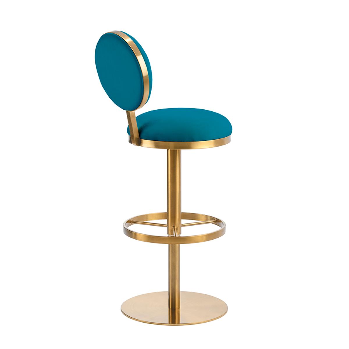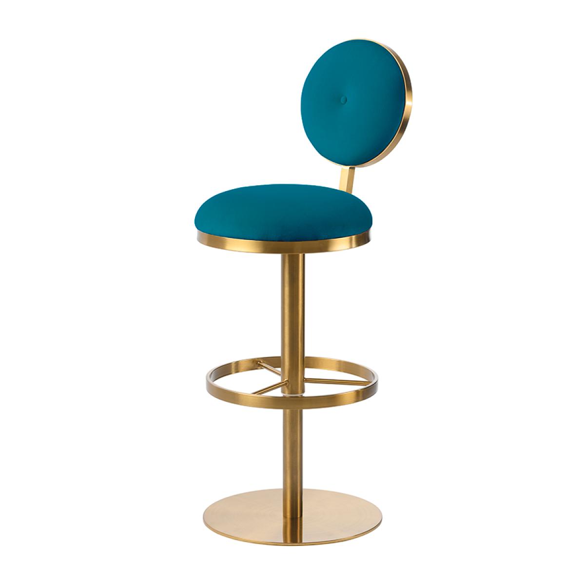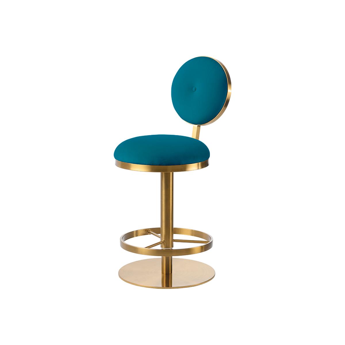 Striking, sculptural form inspired by mid-century Italian design. Frame hand crafted from brushed stainless steel with brass electro plated finish. Comfortable padded seat and backrest. Velvet upholstery fabric. Single button detail. Height adjust and swivel function. Suitable for use as a bar or counter stool.