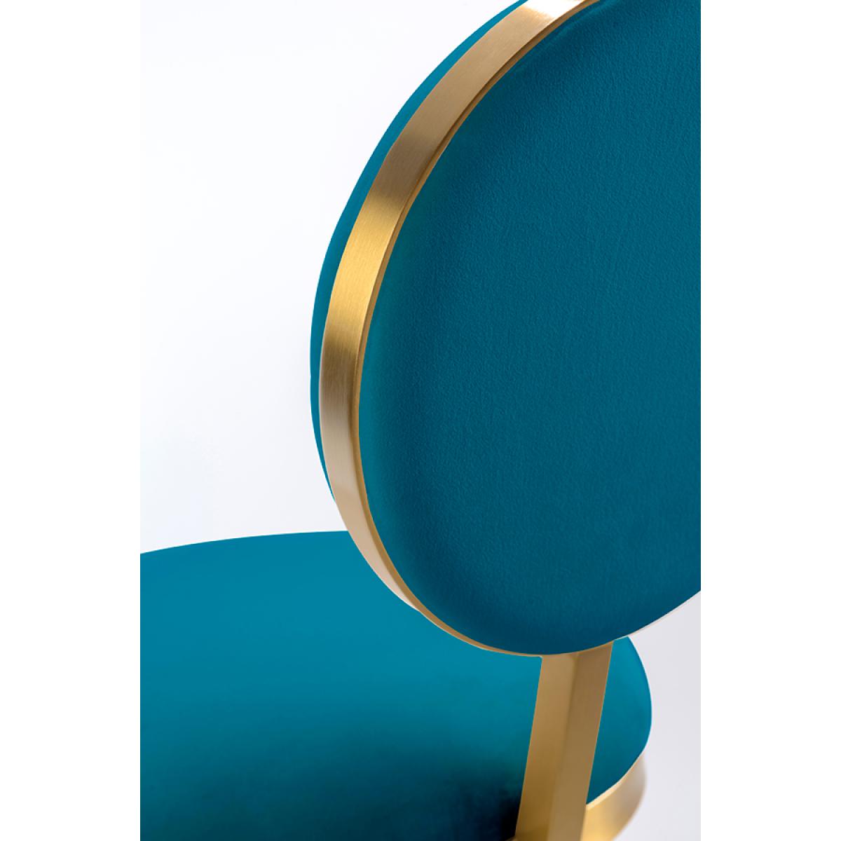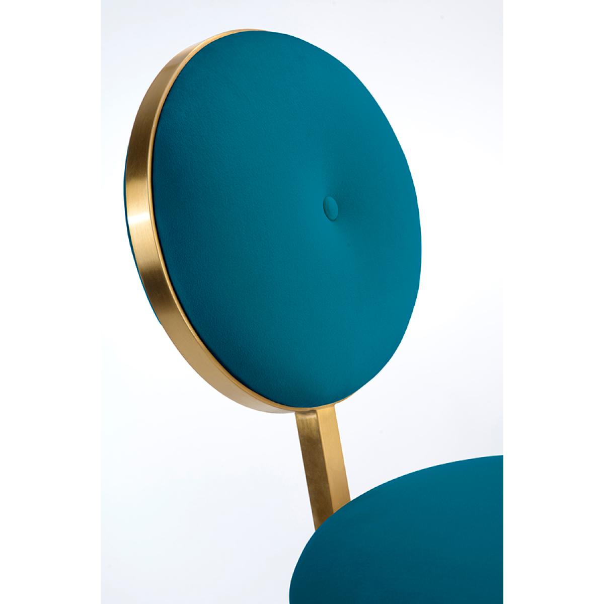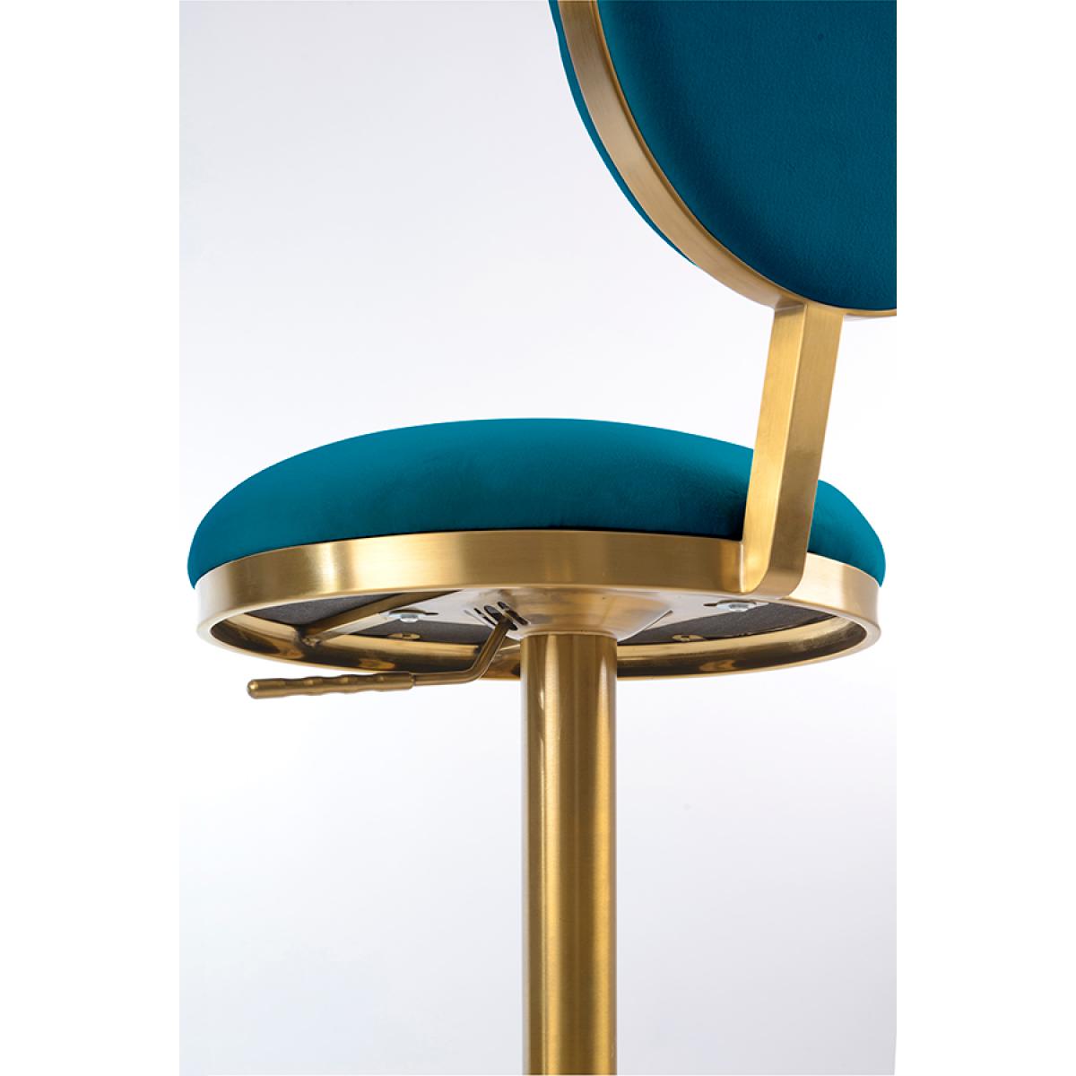 Striking, sculptural form inspired by mid-century Italian design. Frame hand crafted from brushed stainless steel with brass electro plated finish. Comfortable padded seat and backrest. Velvet upholstery fabric. Single button detail. Height adjust and swivel function. Suitable for use as a bar or counter stool.
