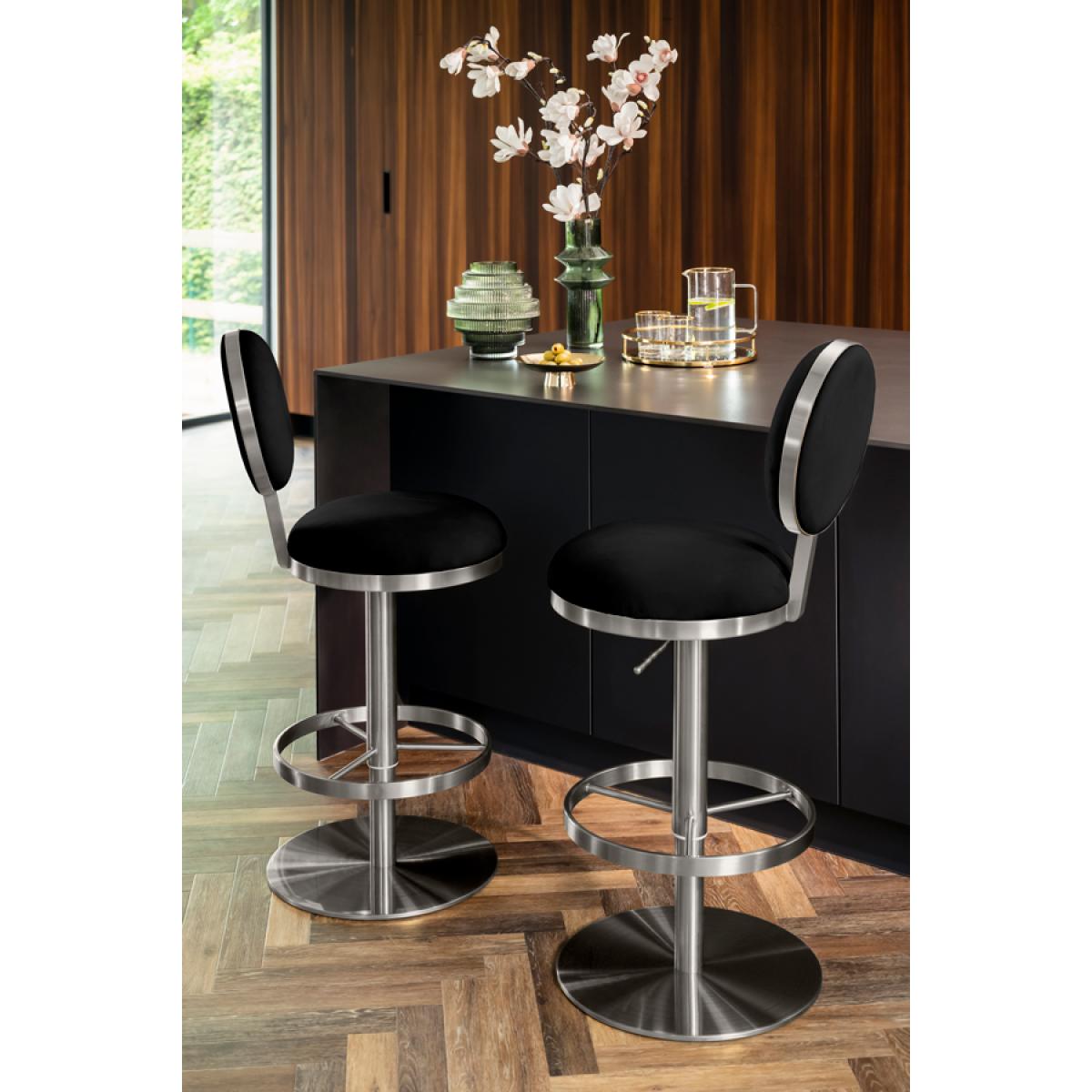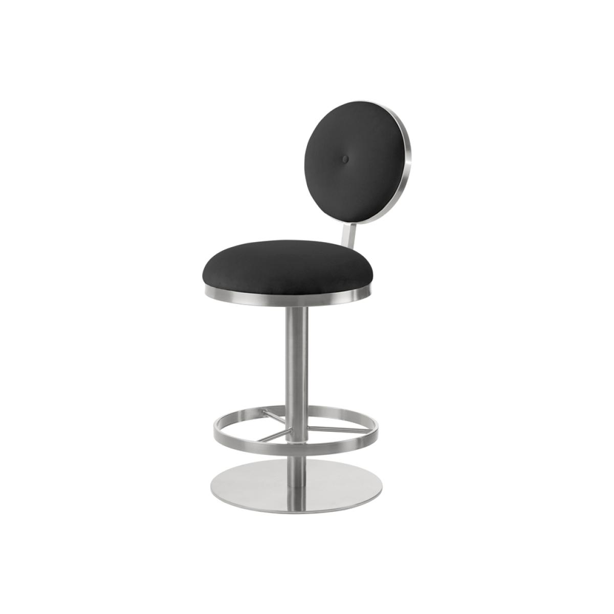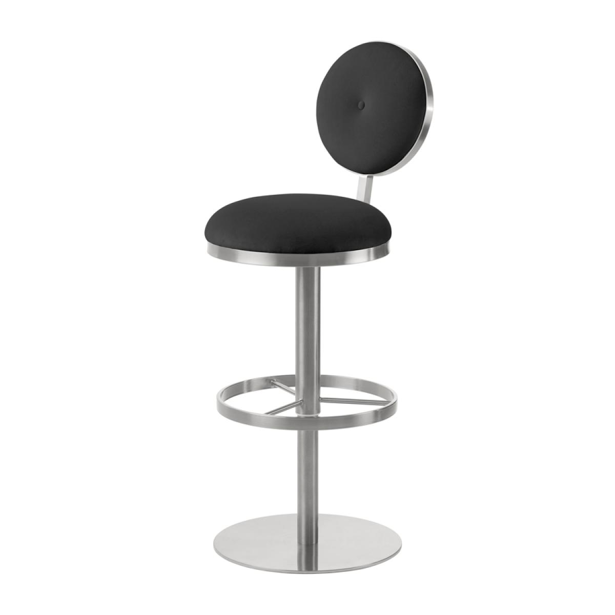 Striking, sculptural form inspired by mid-century Italian design. Frame handcrafted from brushed stainless steel. Comfortable padded seat and backrest. Velvet upholstery fabric. Single button detail. Height adjust and swivel functions. Suitable for use as a bar or counter stool.