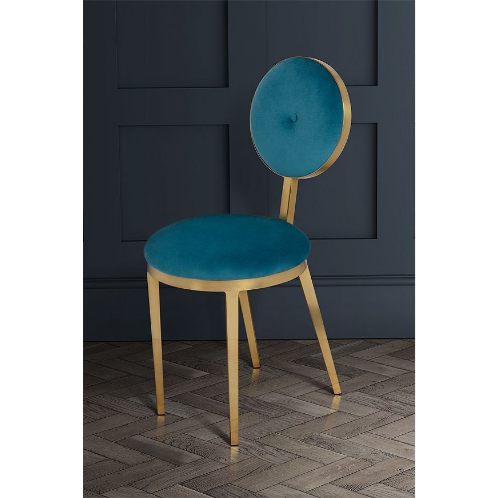 Frame hand crafted from steel with brass electro plated finish. Comfortable padded seat upholstered in luxurious velvet with sleek, single button detail. Striking, sculptural form inspired by mid-century Italian design. Part of the complete Ravello living and dining room collection.