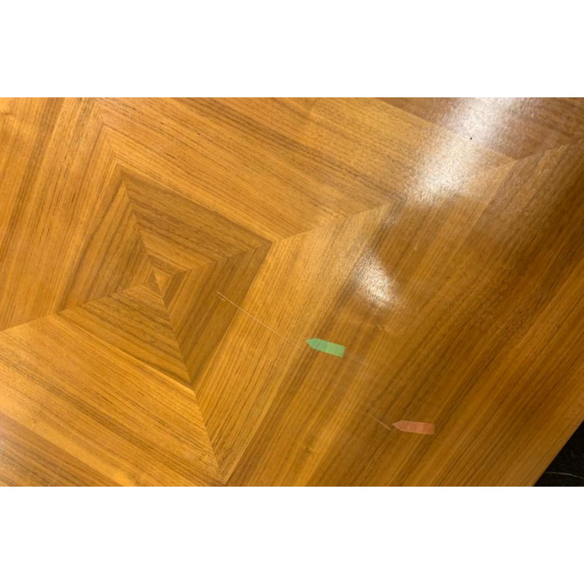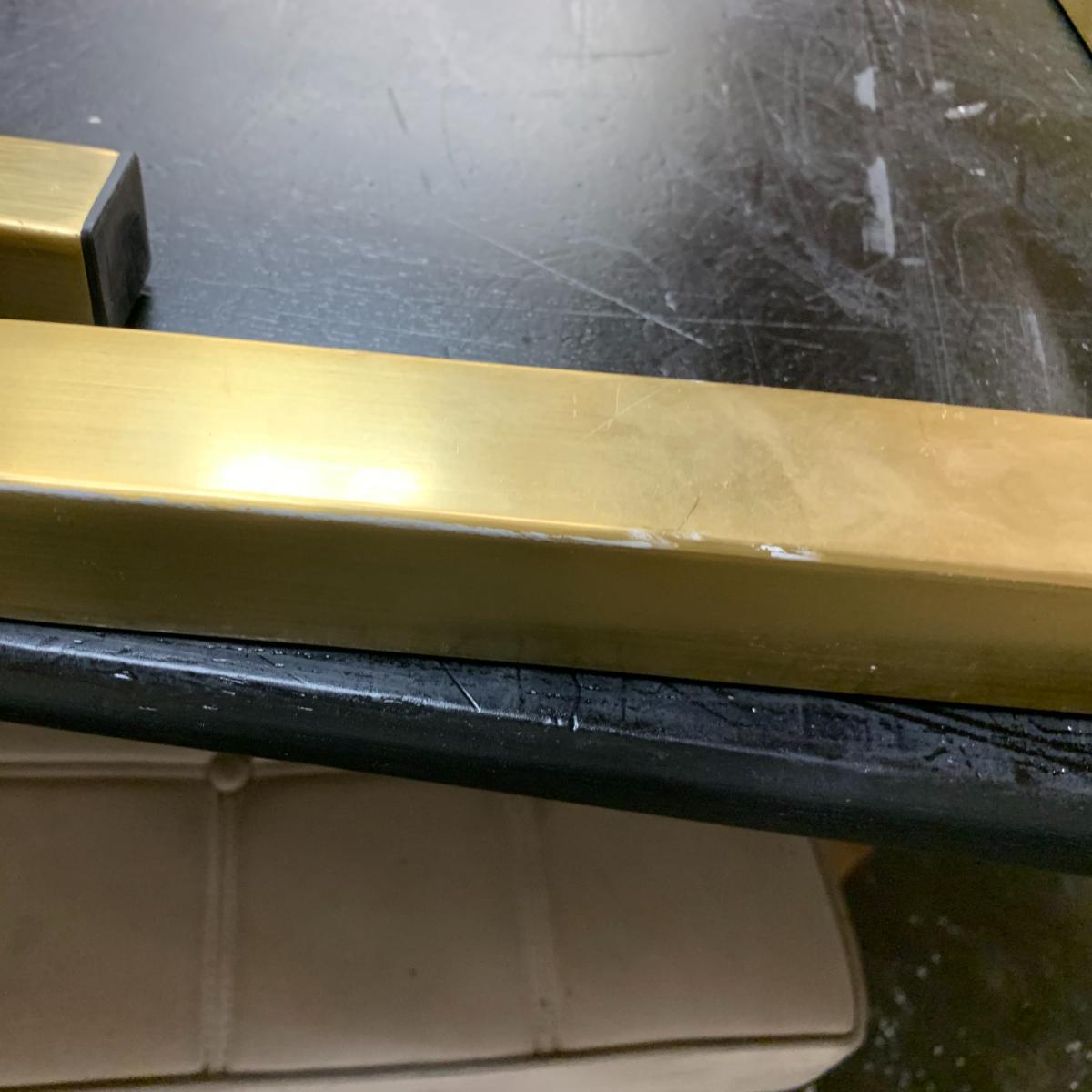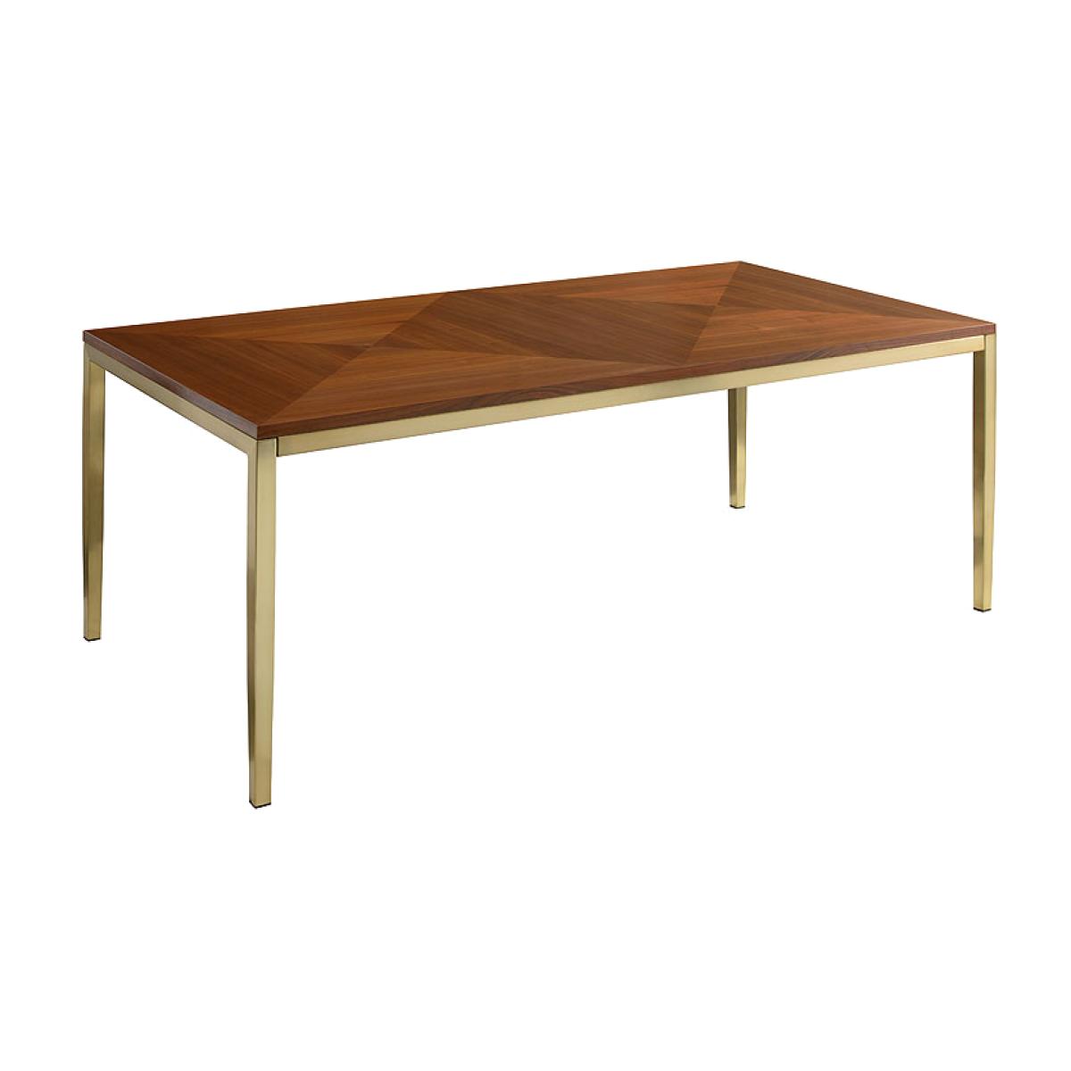 Frame hand crafted from steel with brass electro plated finish. Distinctive top finished with diamond pattern walnut veneer. Striking form inspired by mid-century Italian design. Will seat 6-8 people. Part of the complete Ravello living and dining room collection. Simple assembly required. Requires assembly. ITEM WITH ISSUES. Please Note: Items with issues can be returned as normal. However, they cannot be replaced with new for any reason. Please check photos for any issue(s). Packaging not new. Legs are marked or scratched. Top has scratches.