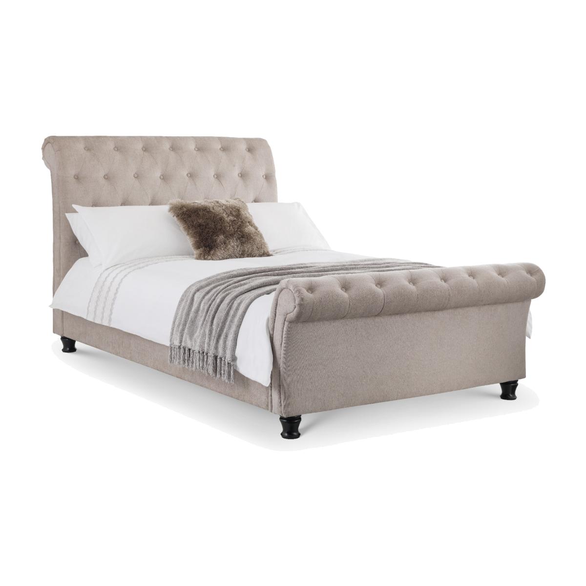 The Ravello Bed is a resplendent and statement addition to any modern bedroom suite. In the classic scroll style, this opulent bed is a gorgeously stylish choice for your home. Beautifully crafted from soft chenille fabric in a gentle mink tone, the elegant headboard and footboard are oversized, feature buttoned detailing and create a beautiful feature. Strong hardwood frame and soft padding create an elegant, long-lasting design Sprung slatted base ensures a comfortable night’s sleep Rich upholstery and button features create an elegant look Coordinates beautifully with a range of interior styles