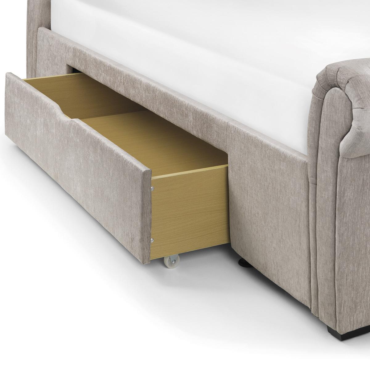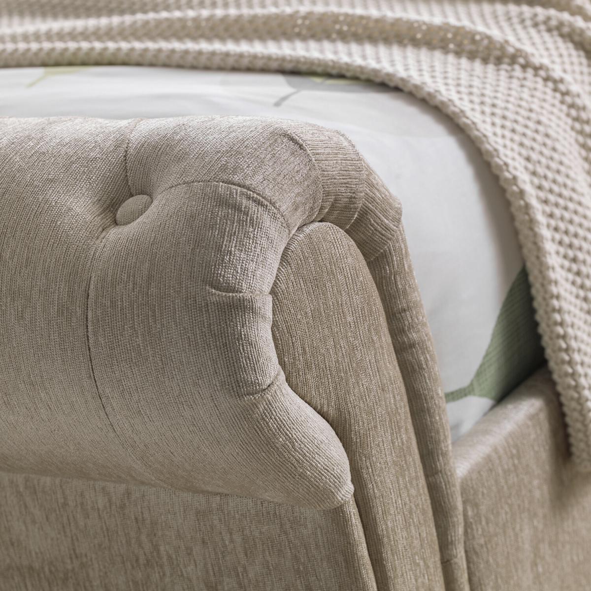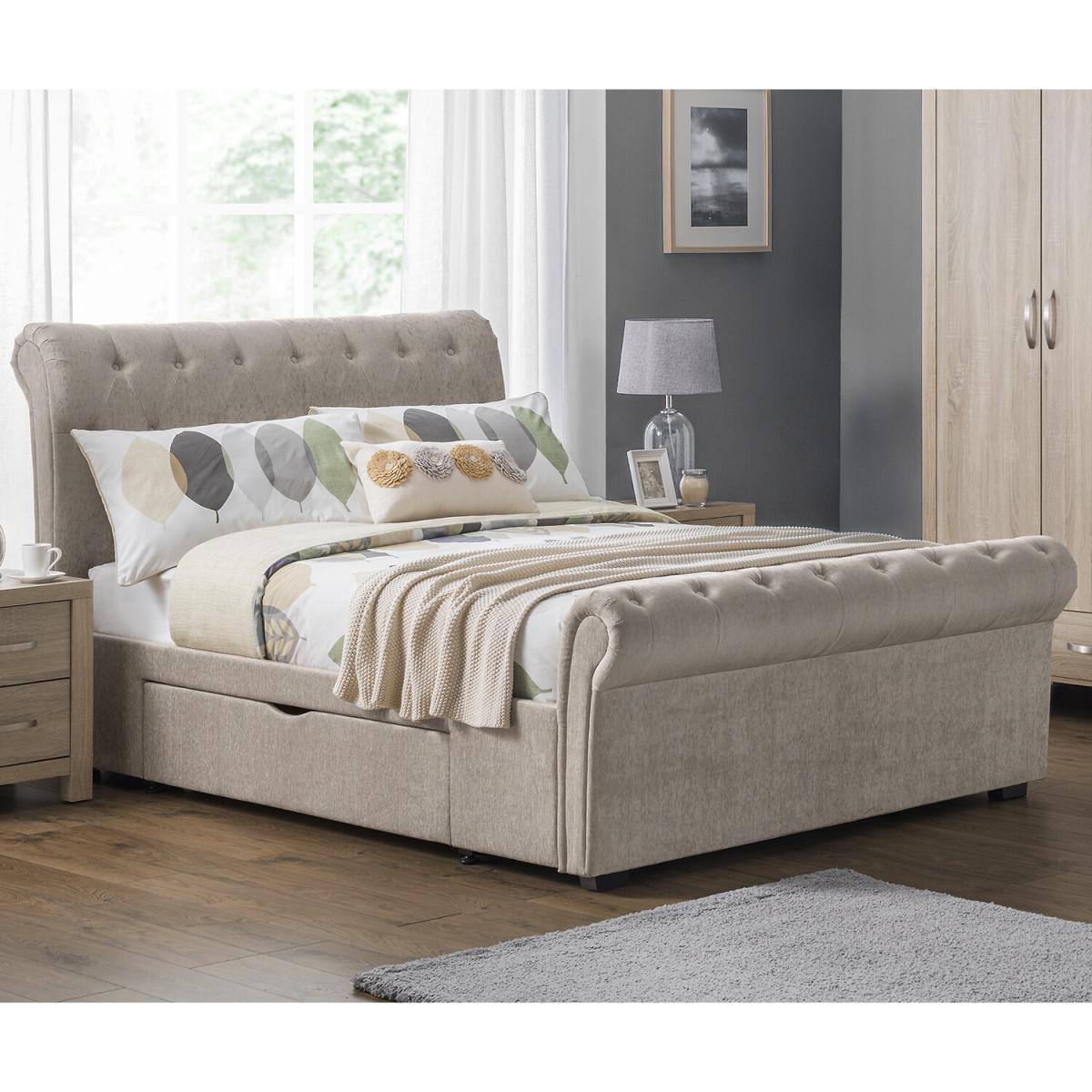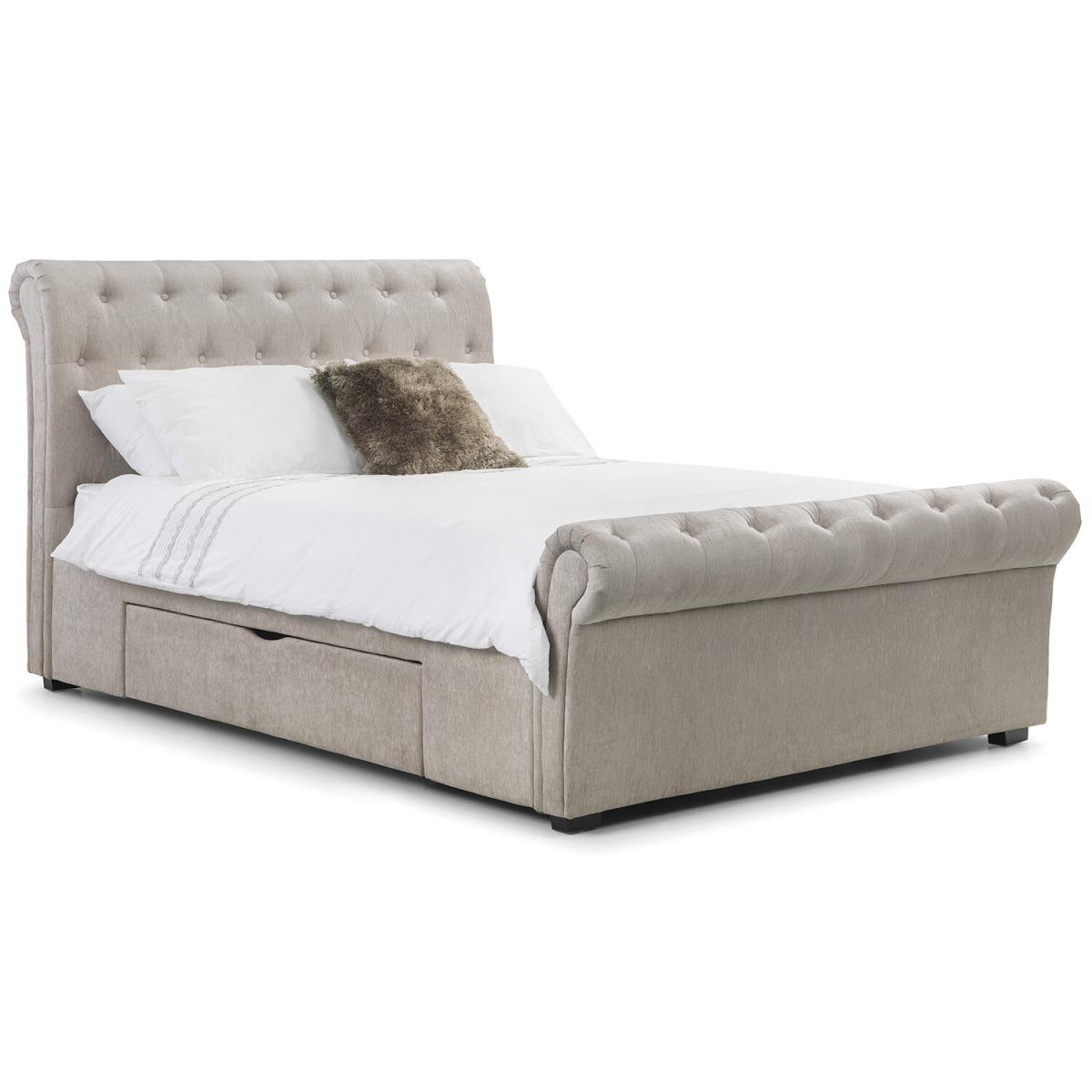 Ravello is a stunning fabric bed in a classic scroll design, finished in a lovely soft touch mink chenille. It is a substantial bed characterised by exquisitely finished, sumptuous upholstery and a striking deep buttoned, high headboard with matching footboard. Two large under bed drawers add a phenomenal amount of storage space. Ravello adds a wow factor to any bedroom and is a perfect match for traditional and contemporary interiors alike. A sprung slatted base ensures extra comfort and prolonged mattress life.