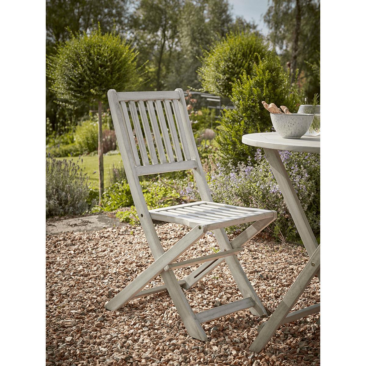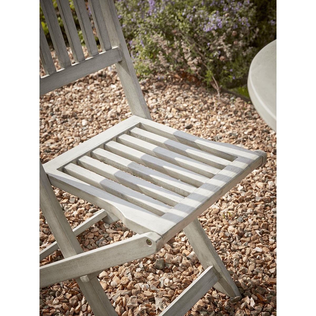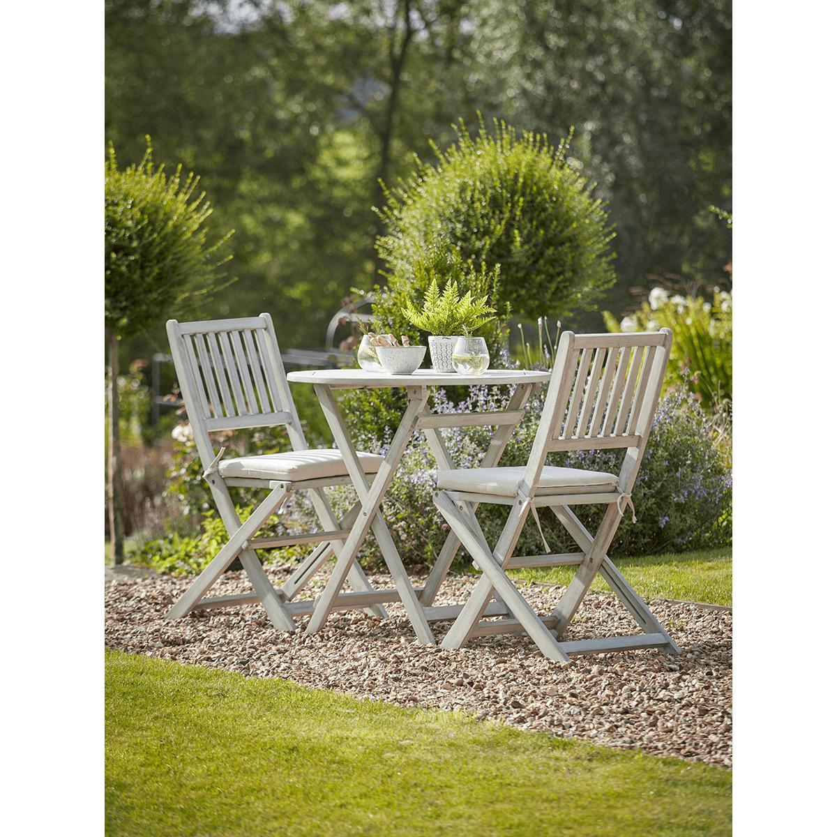 Please accept our apologies, this much loved item is currently sold out. Simple and classic, the perfect fit for a country garden, our Ravenna Bistro Set is made from acacia wood with a washed finish and elegant slatted design. Each with a small round table and two chairs, its perfect for intimate dinners and catching up with friends and can be folded away when not in use.