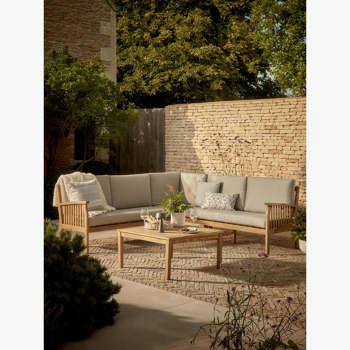 Offering a new look for one of our favourite outdoor furniture collections, the Ravenna is now available in a smooth honey-toned natural acacia wood finish. Simple and classic, the perfect fit for a country garden, the elegantly slatted Ravenna Corner Set in natural offers premium levels of comfort and ample space for the whole family to lounge and enjoy the best of the seasons weather. Each with a large corner sofa, comfortable soft grey cushions and a square table for snacks and drinks, it’s the perfect place to relax with friends and family.