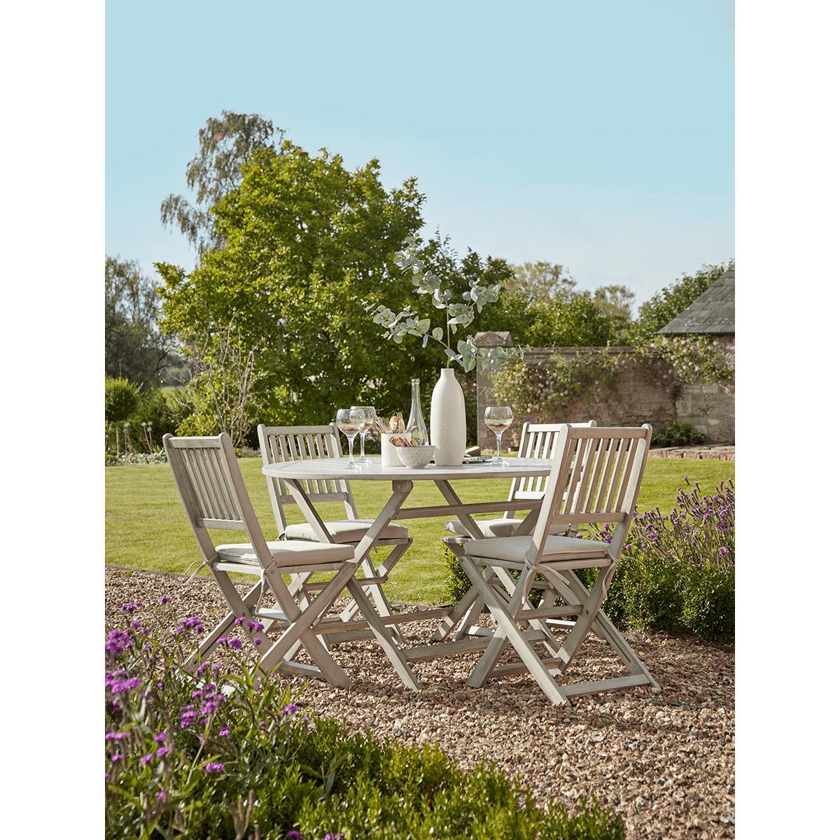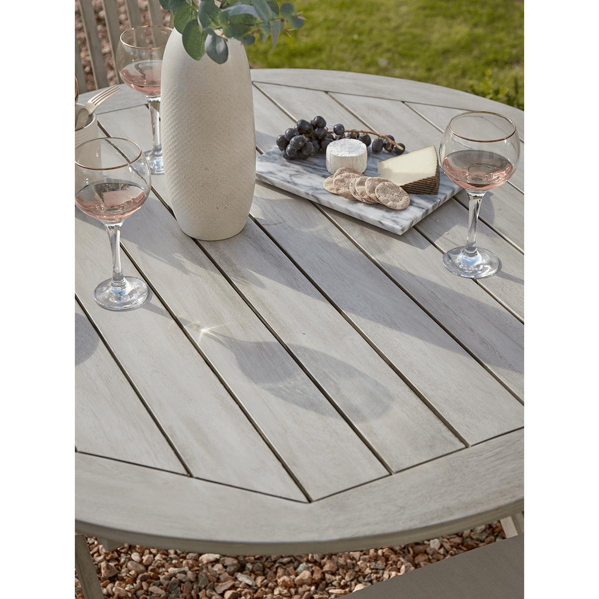 Please accept our apologies, this much loved item is currently sold out. Simple and classic, the perfect fit for a country garden, our Ravenna Dining Set is made from acacia wood with a washed finish and elegant slatted design. Each with a large round table and four chairs, its perfect for family dinners and catching up with friends.