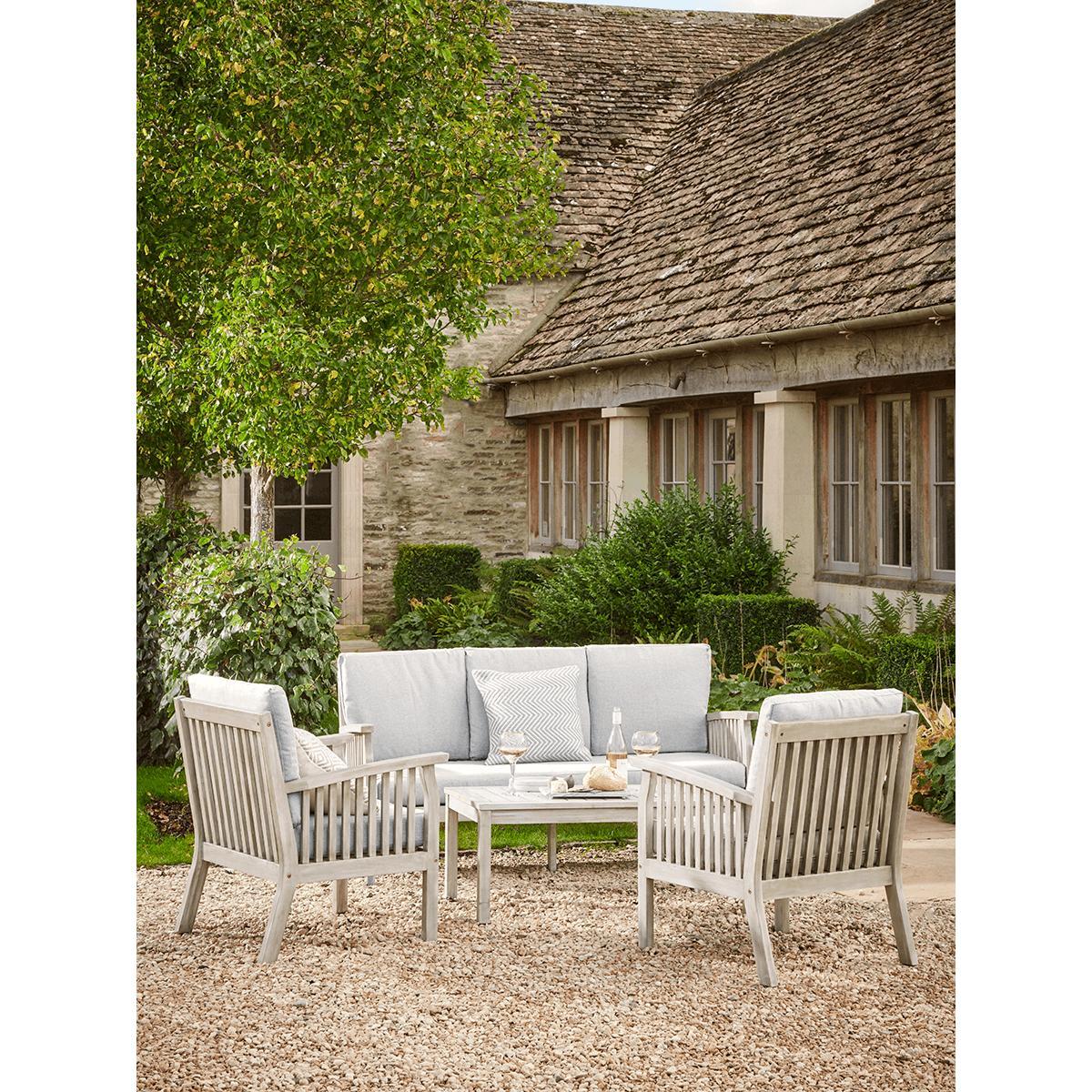 Simple and classic, the perfect fit for a country garden, our Ravenna Lounge Set is made from acacia wood with a washed finish and elegant slatted design. Each with a three-seater sofa and two armchairs with comfortable soft grey cushions, and a rectangular table for snacks and drinks, its the perfect place to relax with friends and family.
