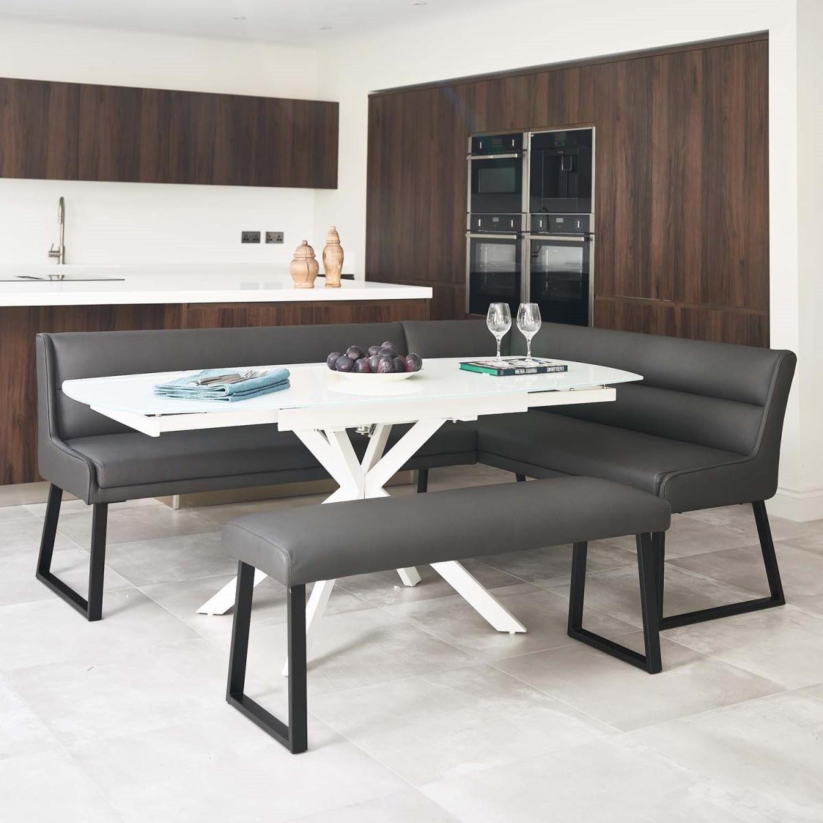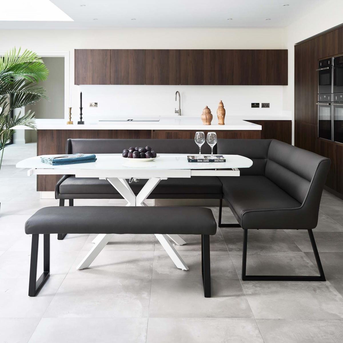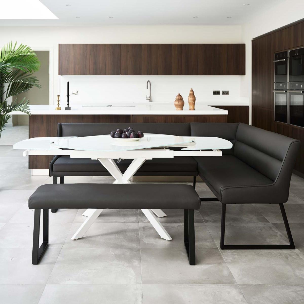 The Ravenna and Paulo Dining set is the perfect way to seat the whole family at dinner time. With a mirrored glass top and brilliant white metal legs, the Ravenna Motion Table is the ideal way to let the decor in your dining space shine. Thanks to the combination of the corner bench and low bench, together with the extending table, you will be able to feed more people in one space for a sociable family meal. Simply spin the table top around to extend smoothly, and rotate it in the opposite direction to store it neatly and take up less space when not in use.