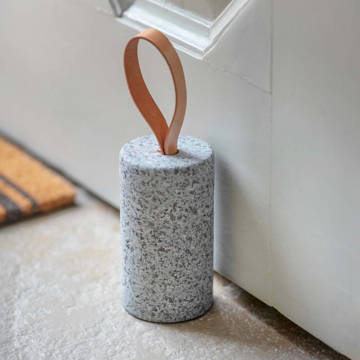 A stylish polished granite door stop with a simplistic leather handle. A sure way to hold even the heaviest of doors open.