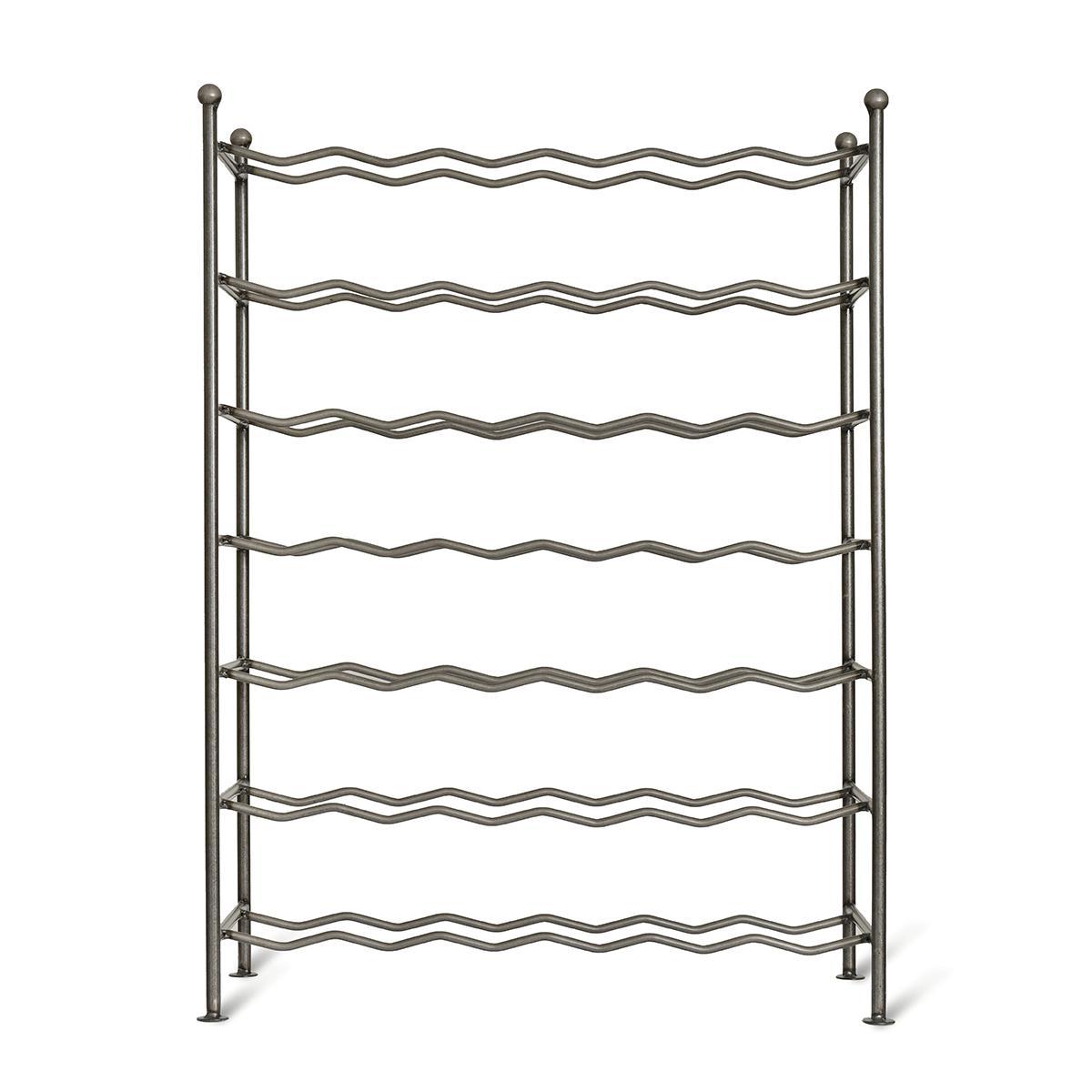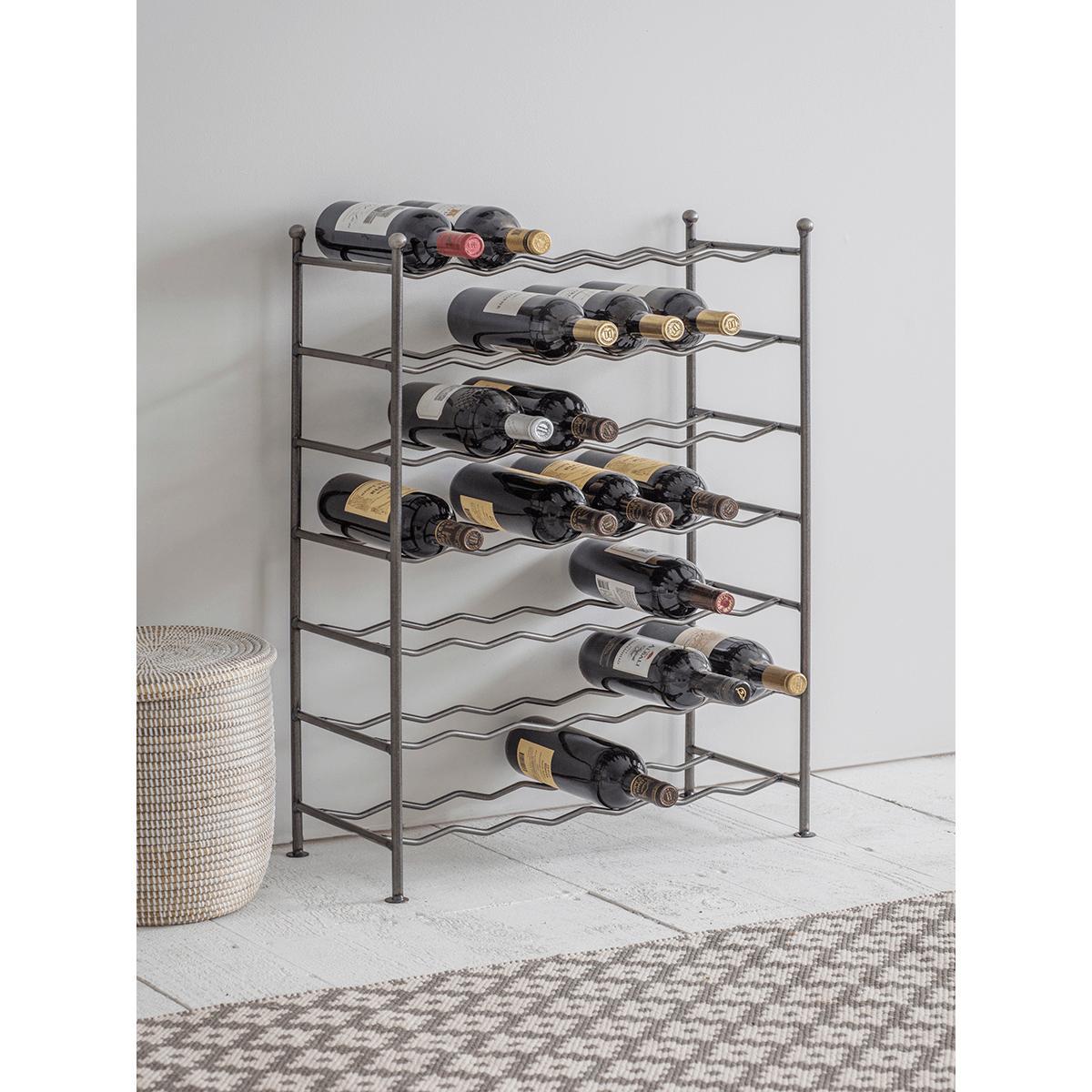 Crafted from steel rods with four circular feet and seven waved rows to hold up to 42 bottles, our industrial style wine rack will make a beautiful addition to your kitchen, dining room or living space. Each piece features four decorative ball details to the top.