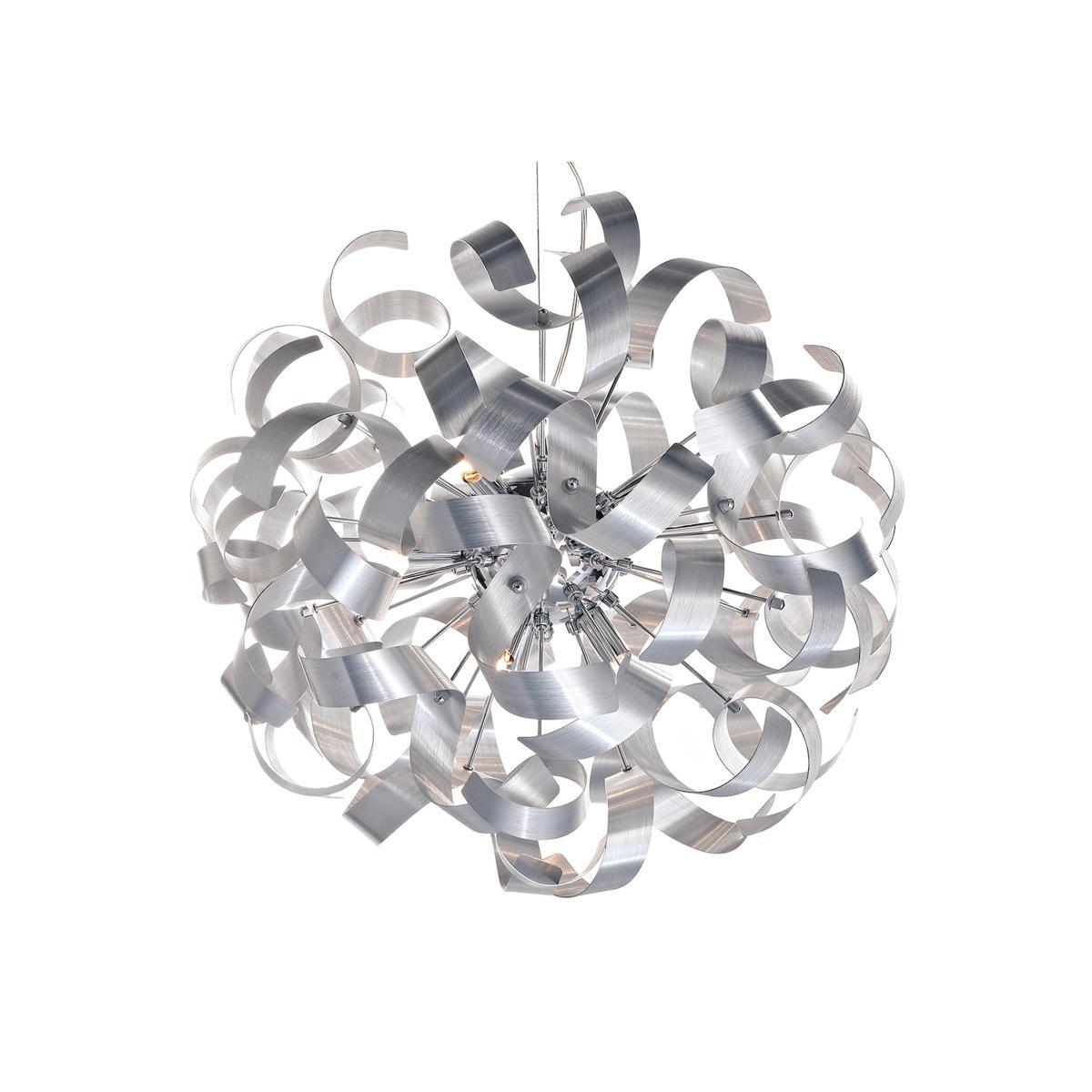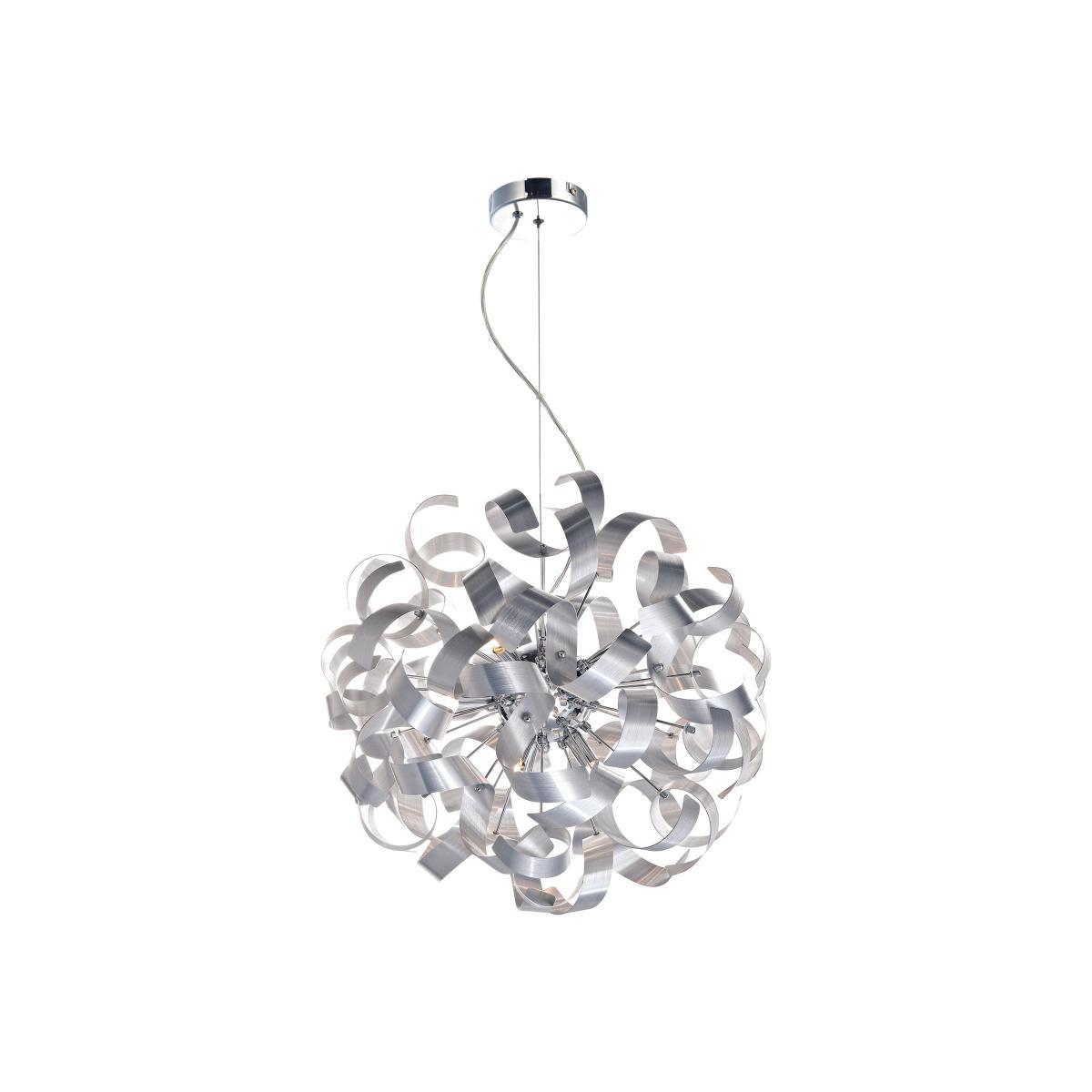 The Rawley 9 light pendant is truly one of a kind. Its unique design has twirling ribbons of polished chrome that will leave an impression on any guest. Why you'll love it. Modern light pendant. Twirling ribbons of polished chrome make a statement. Stunning brushed aluminum chrome base. What you need to know. Made from steel and brushed aluminium. Dimmable with compatible lamps. G9 bulb type (not included). Dimensions. Height: 55 cm (22 in). Width: 60 cm (24 in).