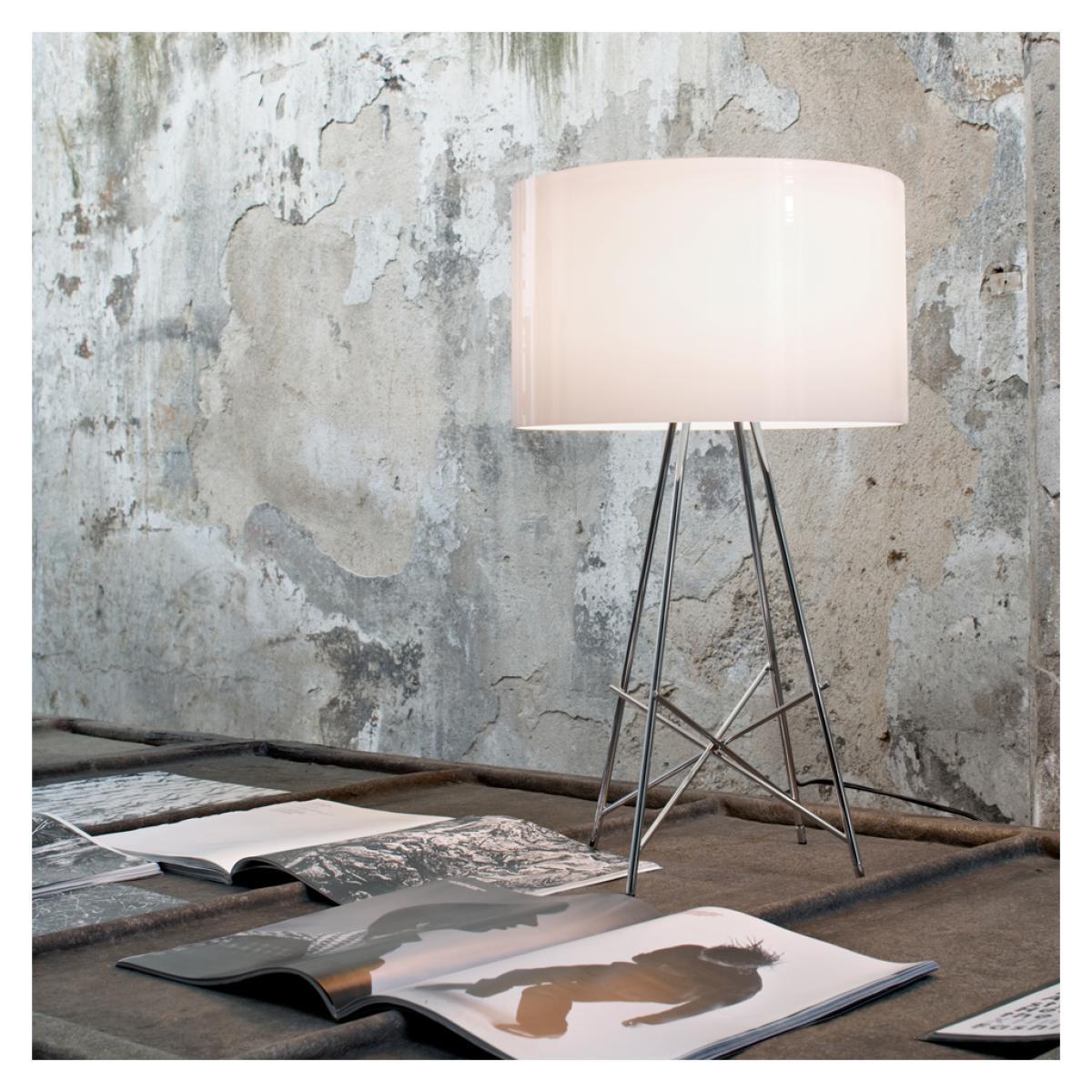 The elegant and structural Ray T Table Lamp in glass was designed by Rodolfo Dordoni in 2006 for Flos. Inspired by a 'part lighthouse, part power pylon' aesthetic, the Ray T Table Lamp provides a diffused emanation for any décor. Crafted with a chrome-plated steel base, the elegant shade is overlaid with hand-blown glass for a glossy external finish, adding dimension to any surface, whether a bedside table, workspace or bureau. Perfect for offering light to any shady corners or as a talking point in a living space, the glass Ray T Table Lamp features an electronic dimmer to achieve the ultimate ambience in its surroundings. Requires 1 x max 105w. E27 HSGS bulb or 1 x LED 8w E27 900lm dimmer bulb (not included).
