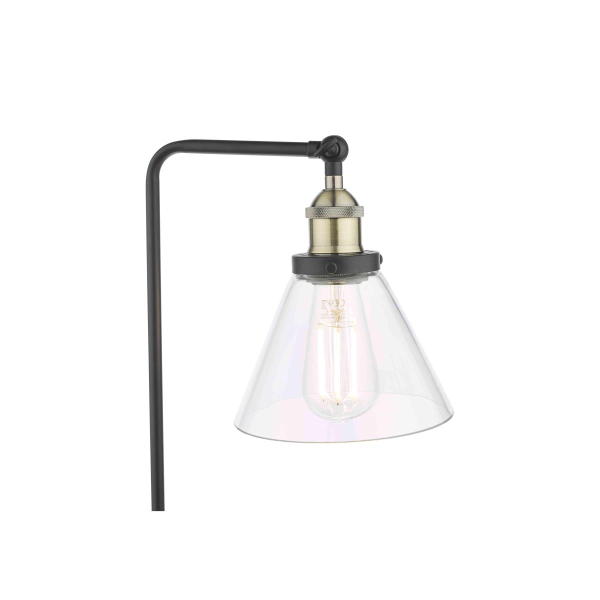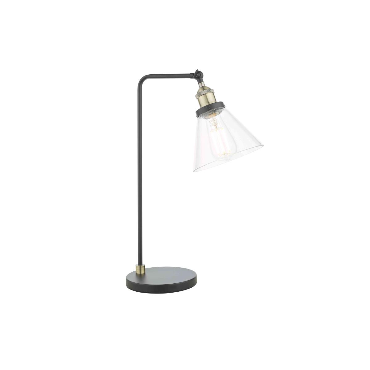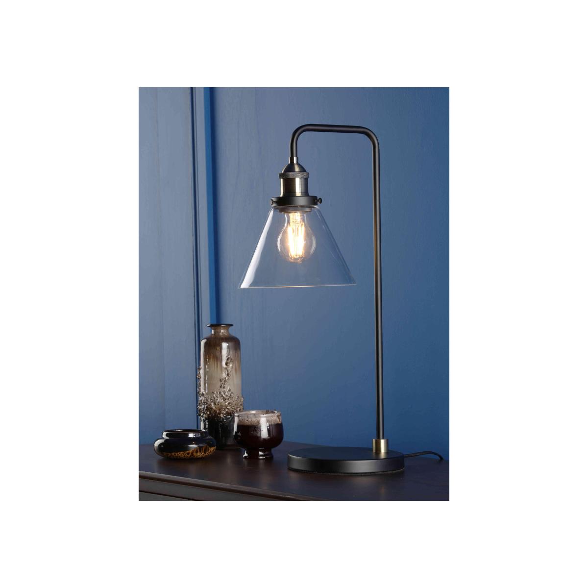 With its slender neck, subtle brass accents and simple clear glass shade, this table lamp delivers elegant industrial style. Why you'll love it This utilitarian table lamp is elegant in its simplicity. Industrial-inspired design. Black circular base and neck with antique brass accents. Cone-shaped clear glass shade is ideal for vintage-style light bulbs. This table lamp is part of the Furniture Village lighting collection. What you need to know Steel and glass. Supplied with 150 cm cable. Inline rocker switch. Requires 1 x E27 max. 40W bulb (not included). Do not exceed the maximum recommended wattage. Unplug before cleaning. Dimensions Height: 49 cm (20 in). Width: 23 cm (10 in). Depth: 19 cm (8 in).