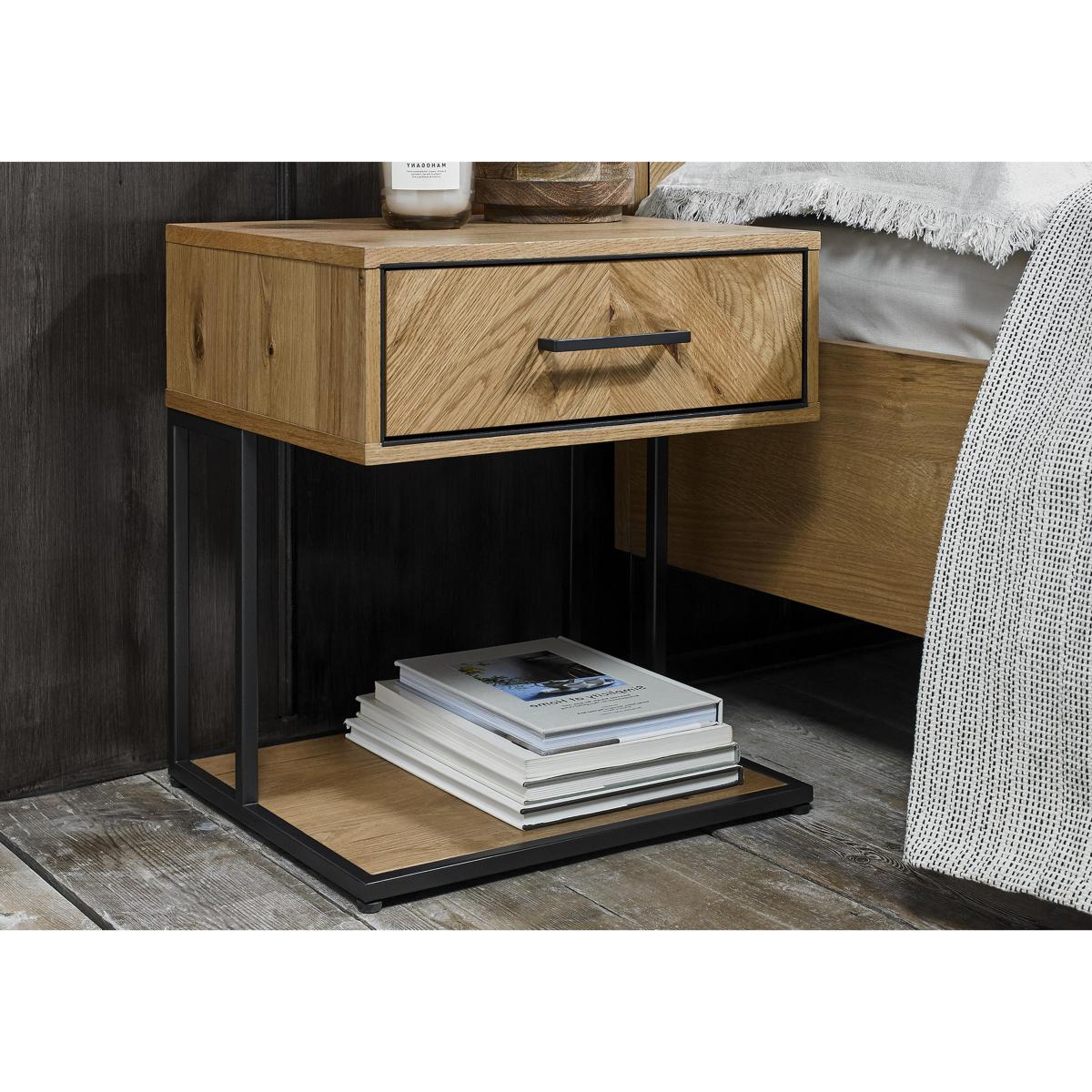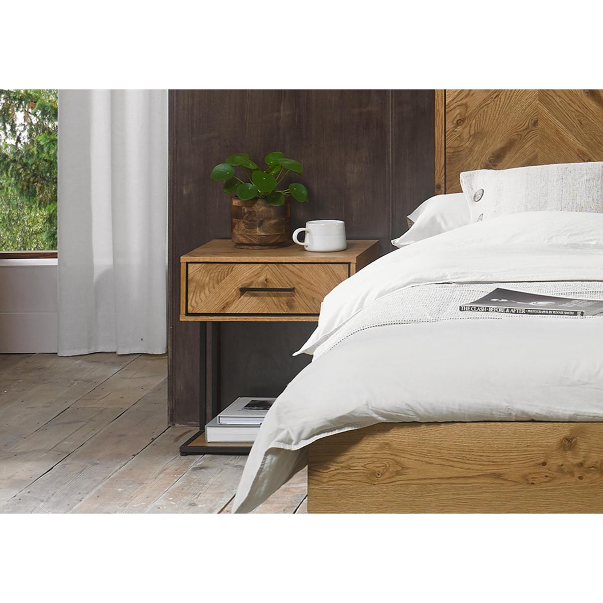 A beautiful blend of industrial-inspired design and contemporary features, the Raya bedroom furniture range makes a stunning impression wherever it's placed. The statement pieces are expertly crafted from solid oak and oiled oak veneers, a finish which highlights the natural character of the wood. Enhance your bedroom interior with a gorgeous Raya cabinet, chest and wardrobe; the striking yet simple designs feature a dynamic herringbone pattern, modern U-shaped legs and plenty of storage space for your clothes and accessories. The coordinating bed frame is the perfect finishing touch and promises a stylish night's sleep. This contemporary one-drawer cabinet makes a perfect addition to any stylish room. Add a lamp for a bright and beautiful bedside. Why you'll love it This 1-drawer bedside cabinet is equally fabulous and functional. Industrial style with a modern feel. Solid natural oak and oak veneer. The wood’s oiled finish highlights its rich character. Dynamic herringbone pattern adds edge. Peppercorn powder-coated metal inlays, legs and handles. Ample storage space. Soft-closing drawer. This 1-drawer bedside cabinet is part of the Raya range. What you need to know Solid oak and oak veneer will show variation in colour. Knots, filled knots and other markings are to be expected. Avoid placing in direct sunlight or close to a heat source. We recommend using placemats and coasters at all times.