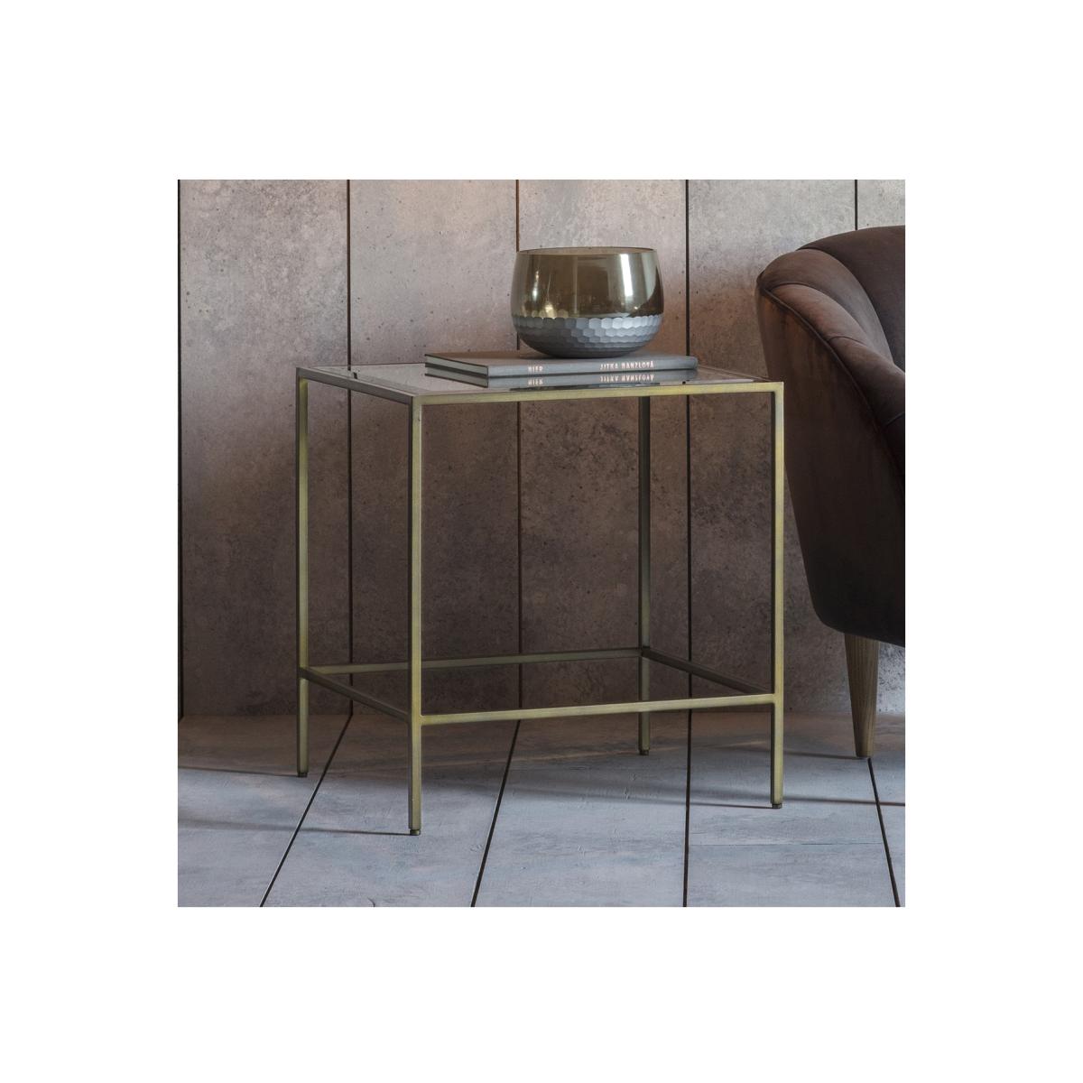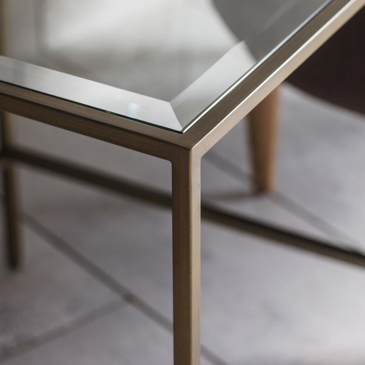 Dimensions H55 x W50 x D50 cm. The Raya side table features clean lines and sparkling textures. The combination of metal and glass with a lavish bronze finish. The slim metal frame holds a gorgeous clear glass top to achieve a level of elegance that is simply unique. Features. Modern side table with clean lines. Bevelled glass top with sleek metal frame Minimalist design. Bronze coloured frame. Matching items available in the range. Assembly required..