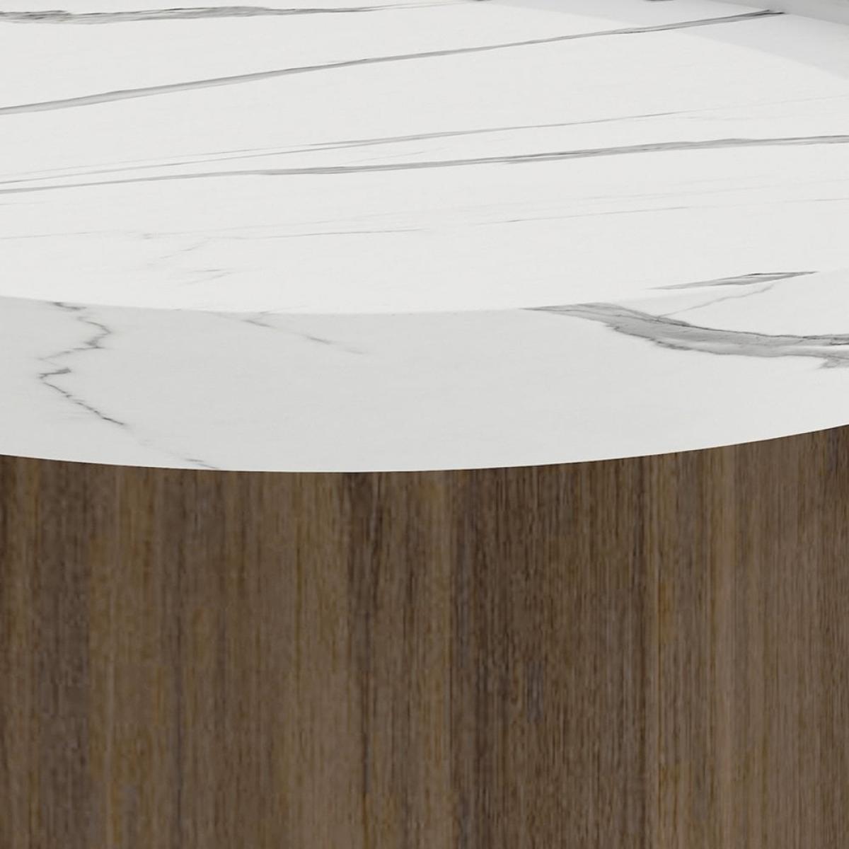 For a fusion of materials that effortlessly elevates your living space, the Raya Side Table is just the ticket. In a white marble effect circular top and dark wood finish base, this is Luxe 70s Revival. A luxurious side table, also note the ribbed detailing on the pedestal base for contemporary and timeless appeal.