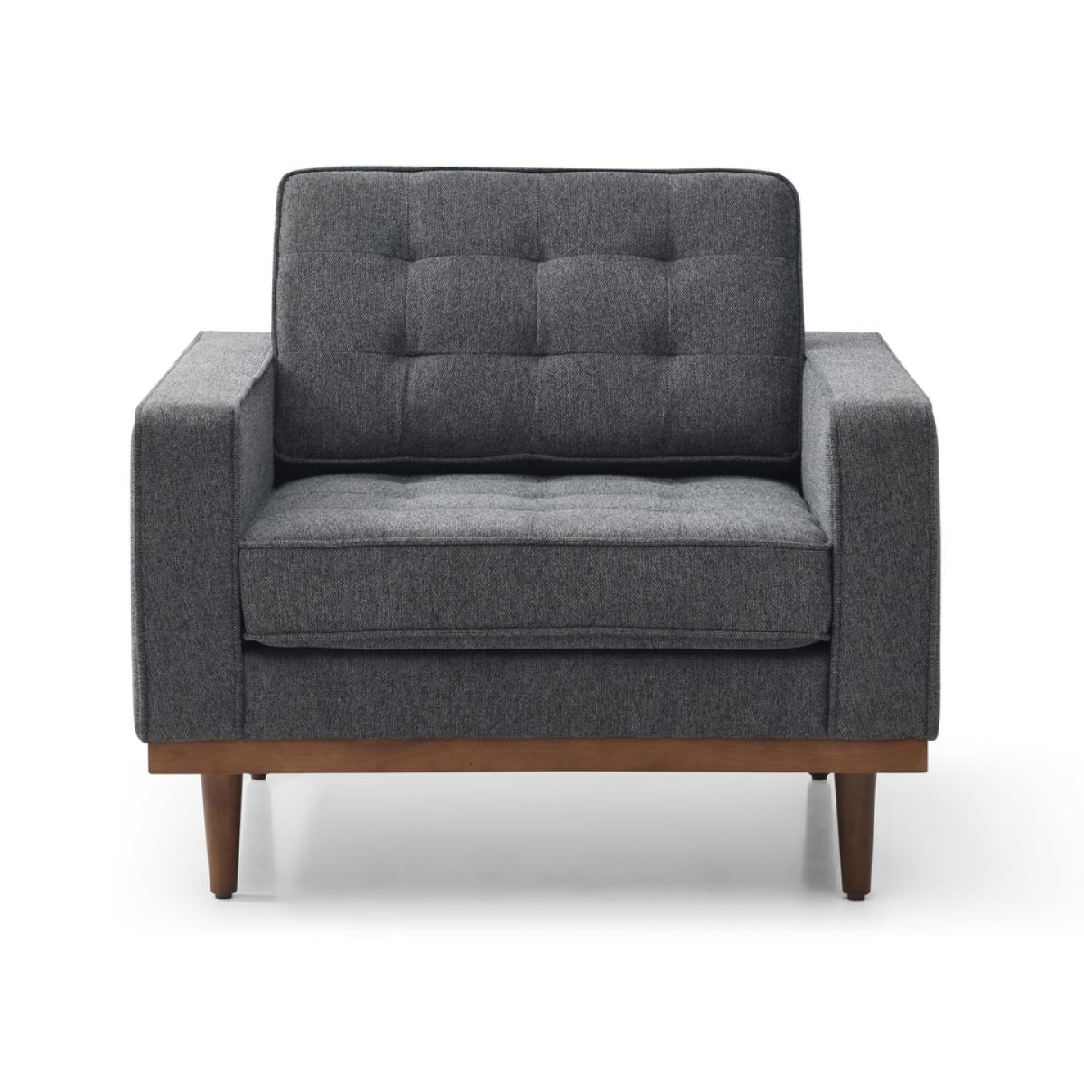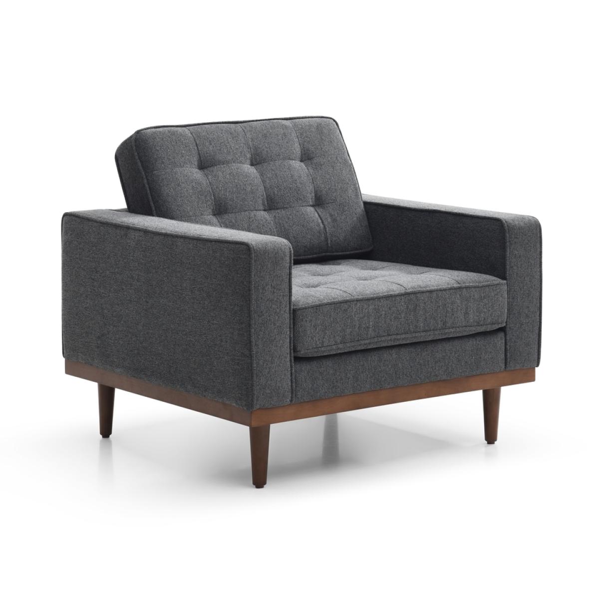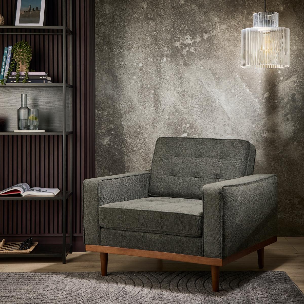 Boasting a classic, cosy design, and upholstered in a soft chenille fabric with button detailing the Raye charcoal armchair is designed for comfort and style. Finished with strong wooden legs and frame, this armchair is ready for you to cuddle up on the foam and fibre filled cushions.